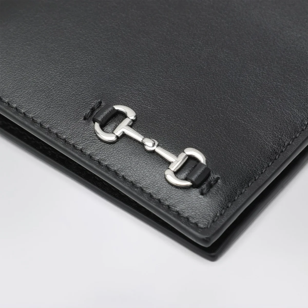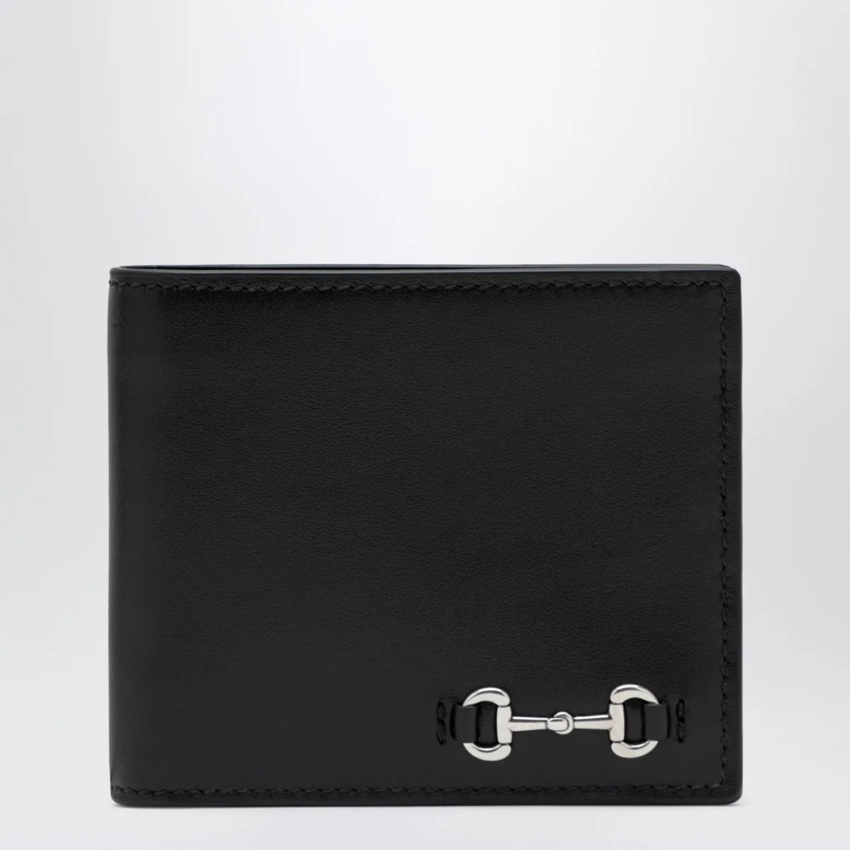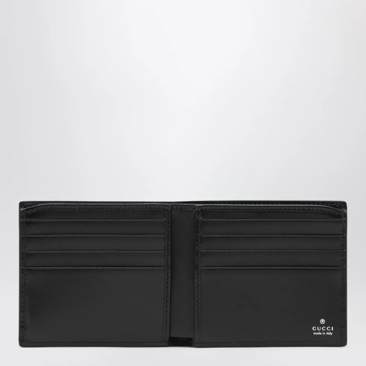 Portafoglio di Gucci in pelle liscia nero, caratterizzato da Morsetto in metallo colo palladio, otto fessure per carte e due scomparti per banconote.