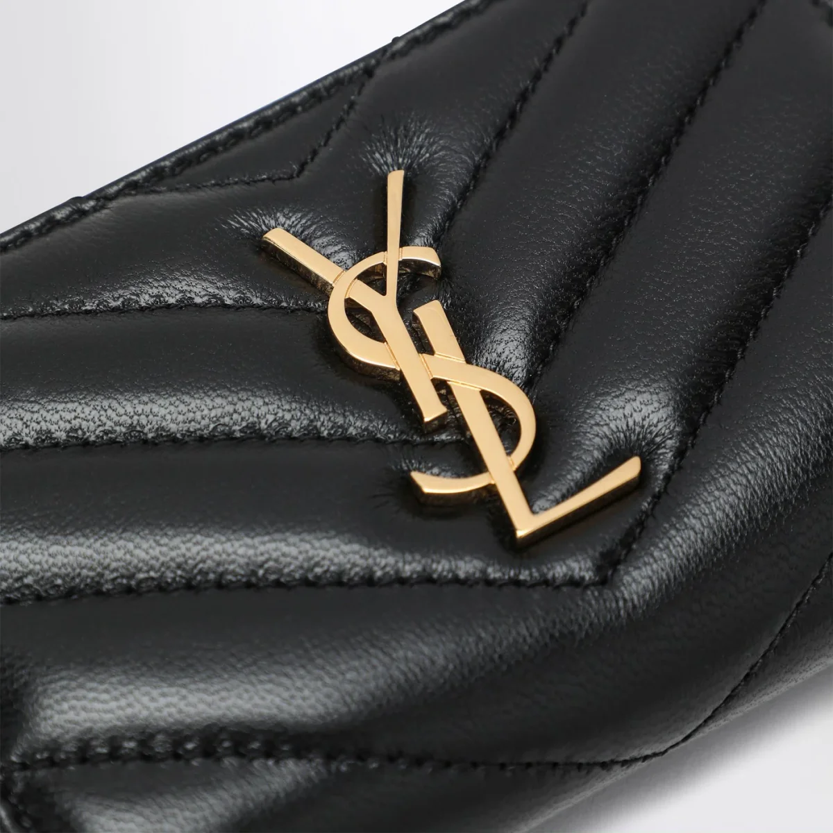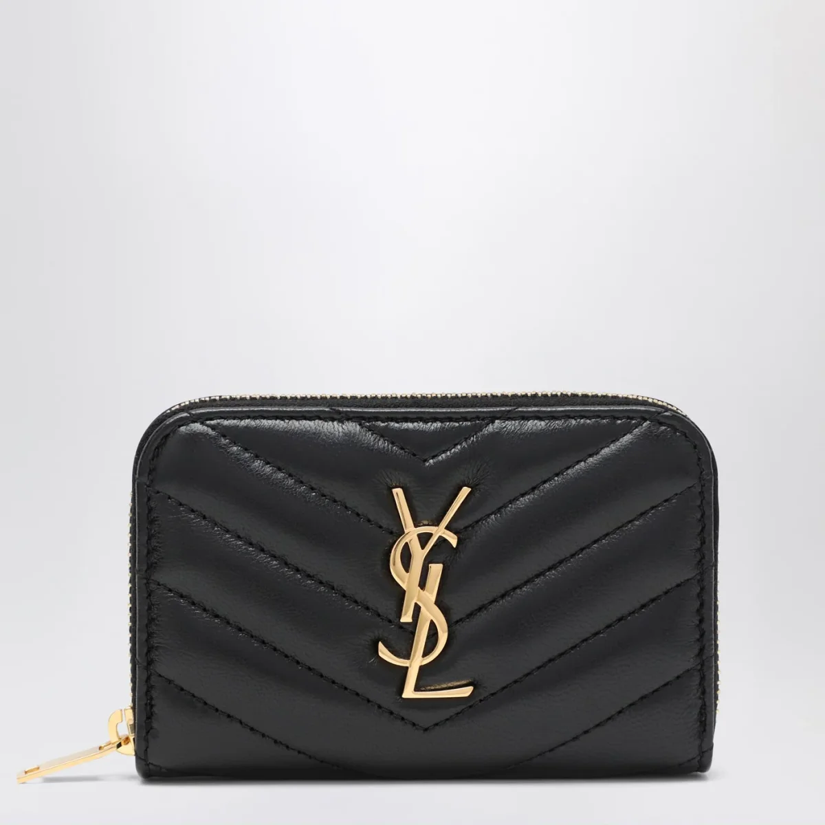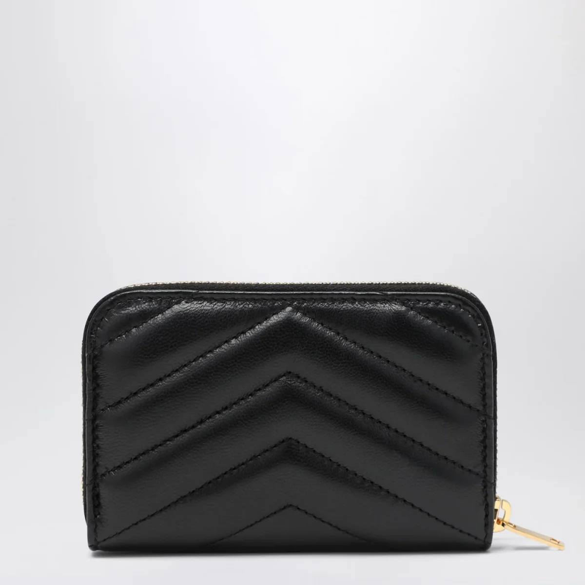 Portamonete e portacarte di Saint Laurent in pelle nero, caratterizzato da impunture trapuntate chevron, hardware in metallo dorato, chiusura con zip, tre scomparti interni a soffietto, logo Cassandre sul davanti e una tasca interna con zip.