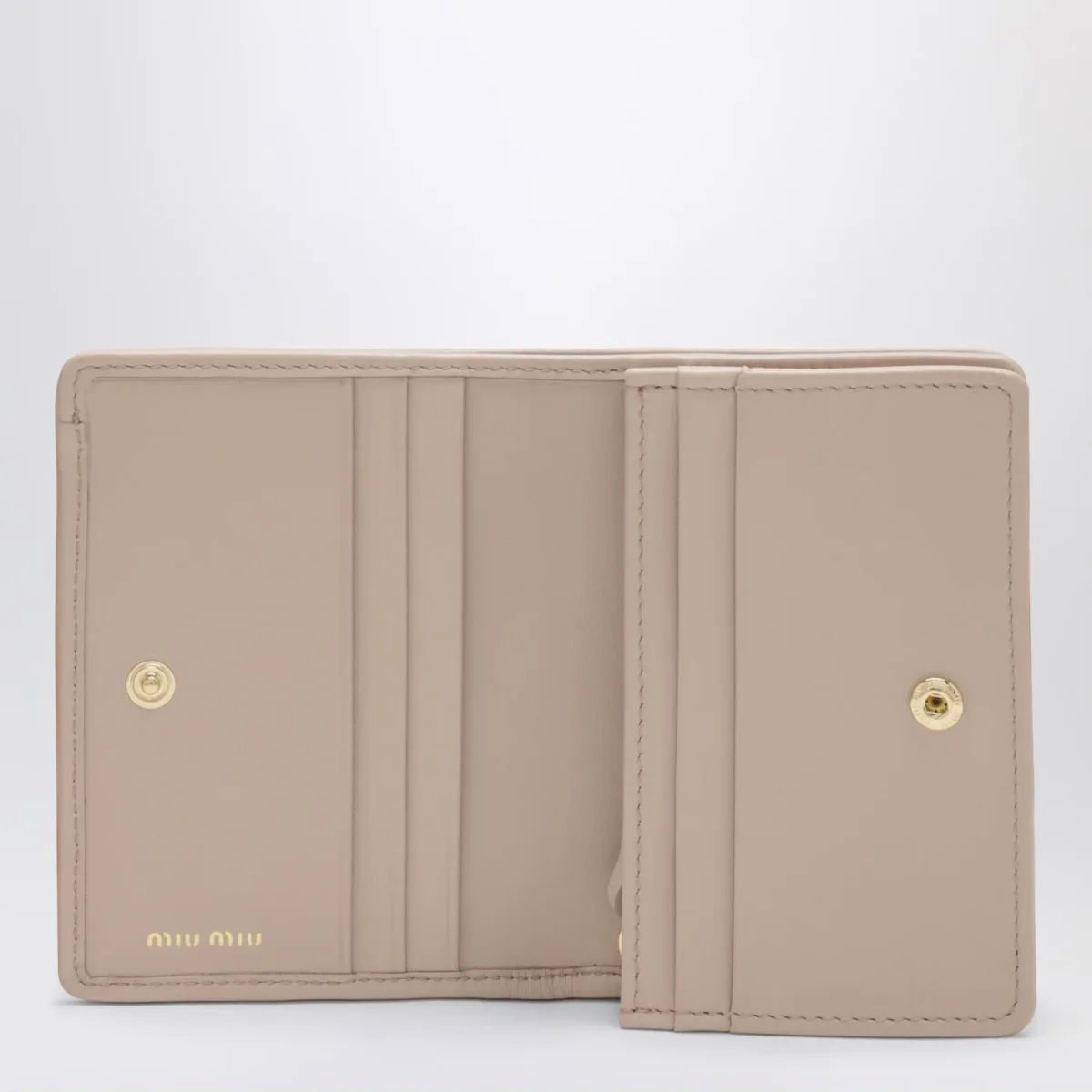 Portafoglio compatto di Miu Miu in nappa matelassé cipria• scomparto per banconote• sei slot per carte di credito• tasca portamonete con zip• chiusura con bottone a pressione• logo lettering in metallo oro sul davanti