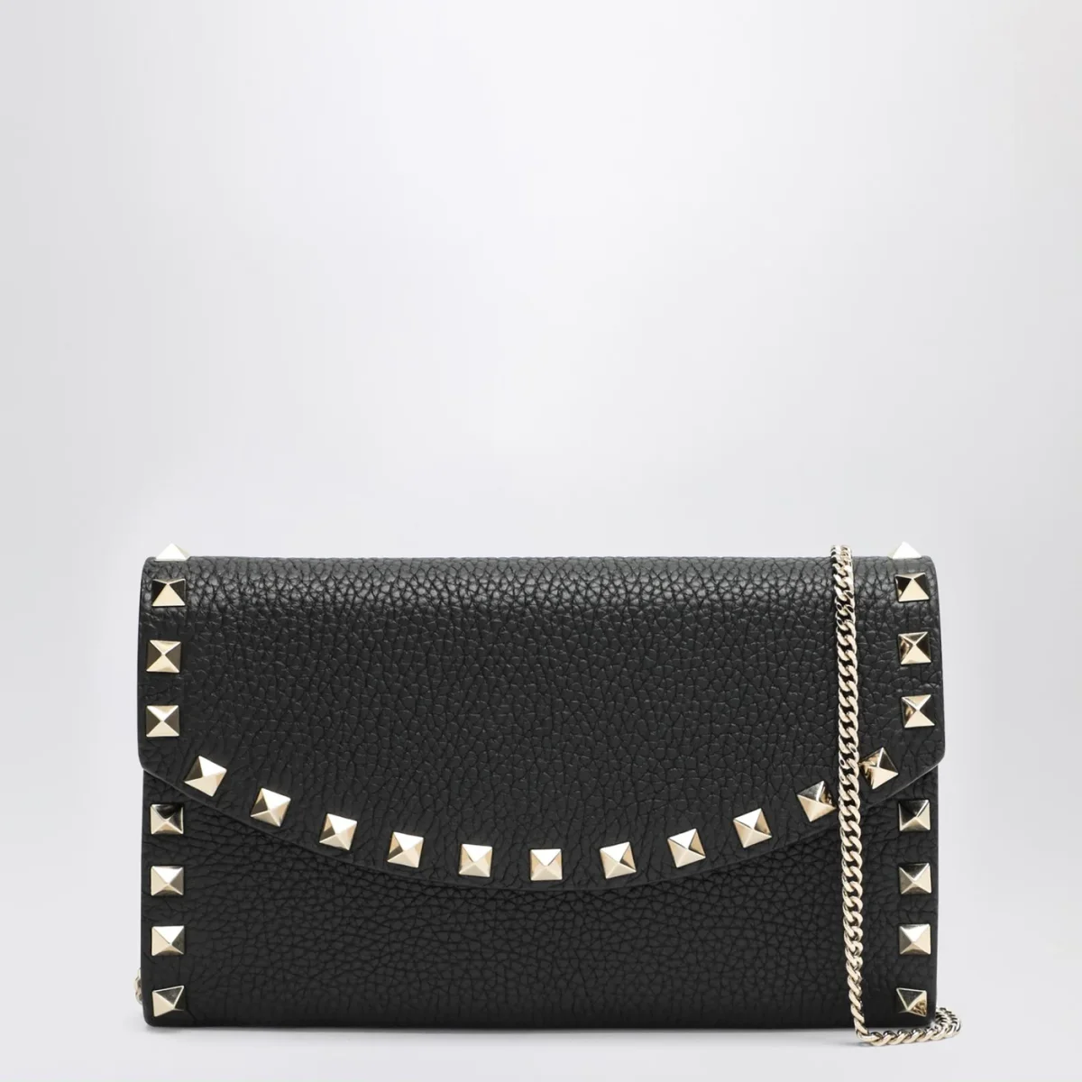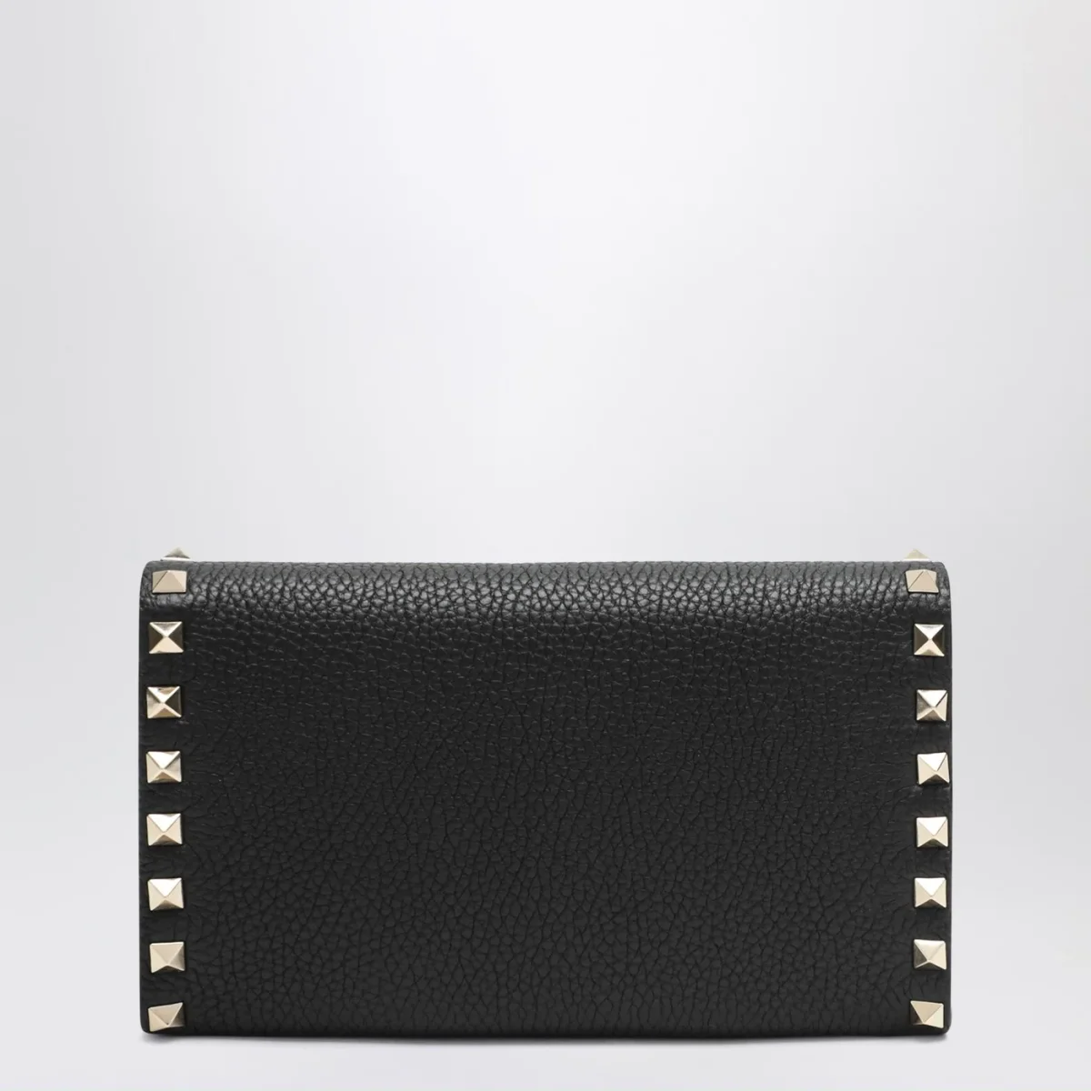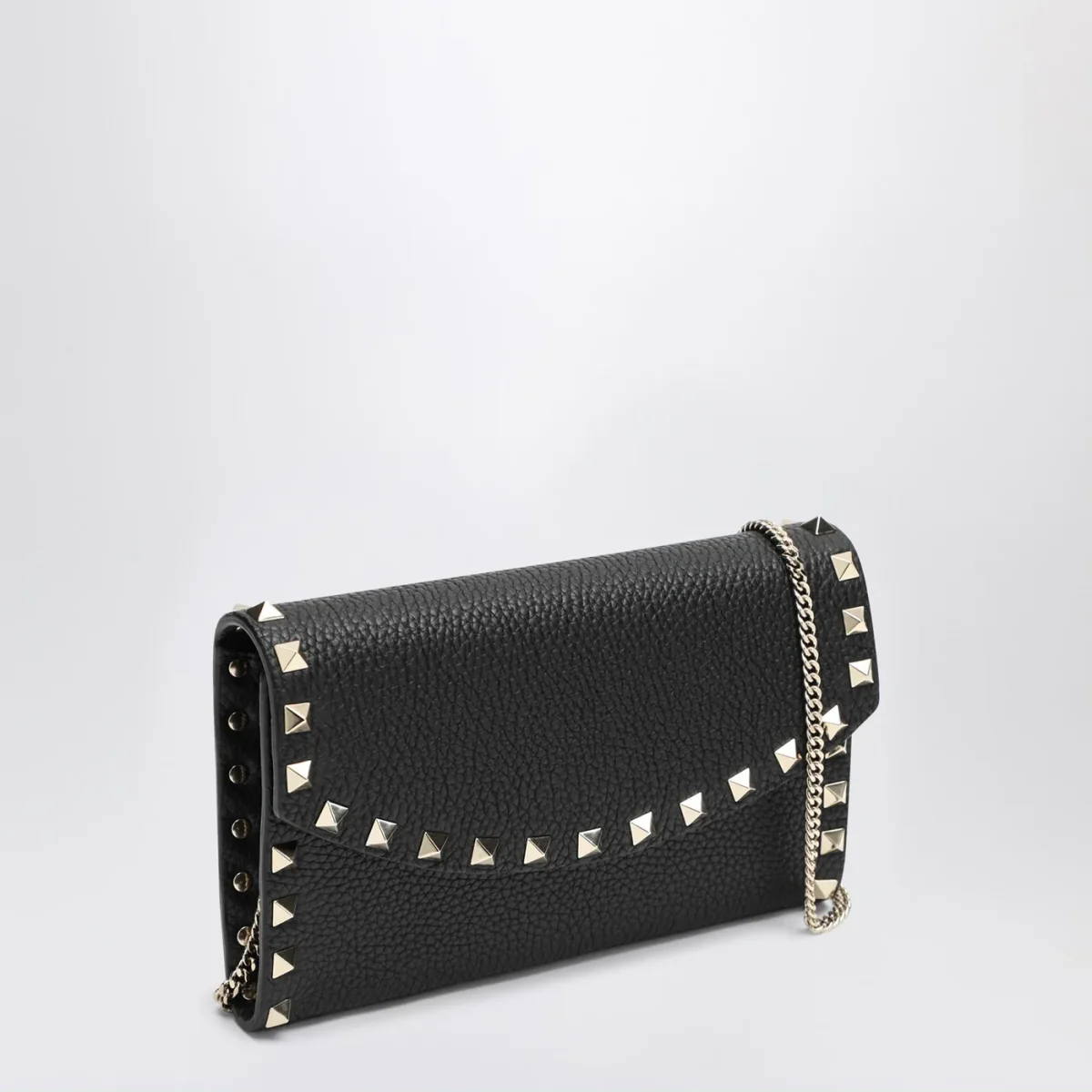 Portafoglio Rockstud di Valentino Garavani in pelle martellata nero, caratterizzato da tracolla a catena rimovibile, chiusura con bottone a pressione e scomparti interni per carte.