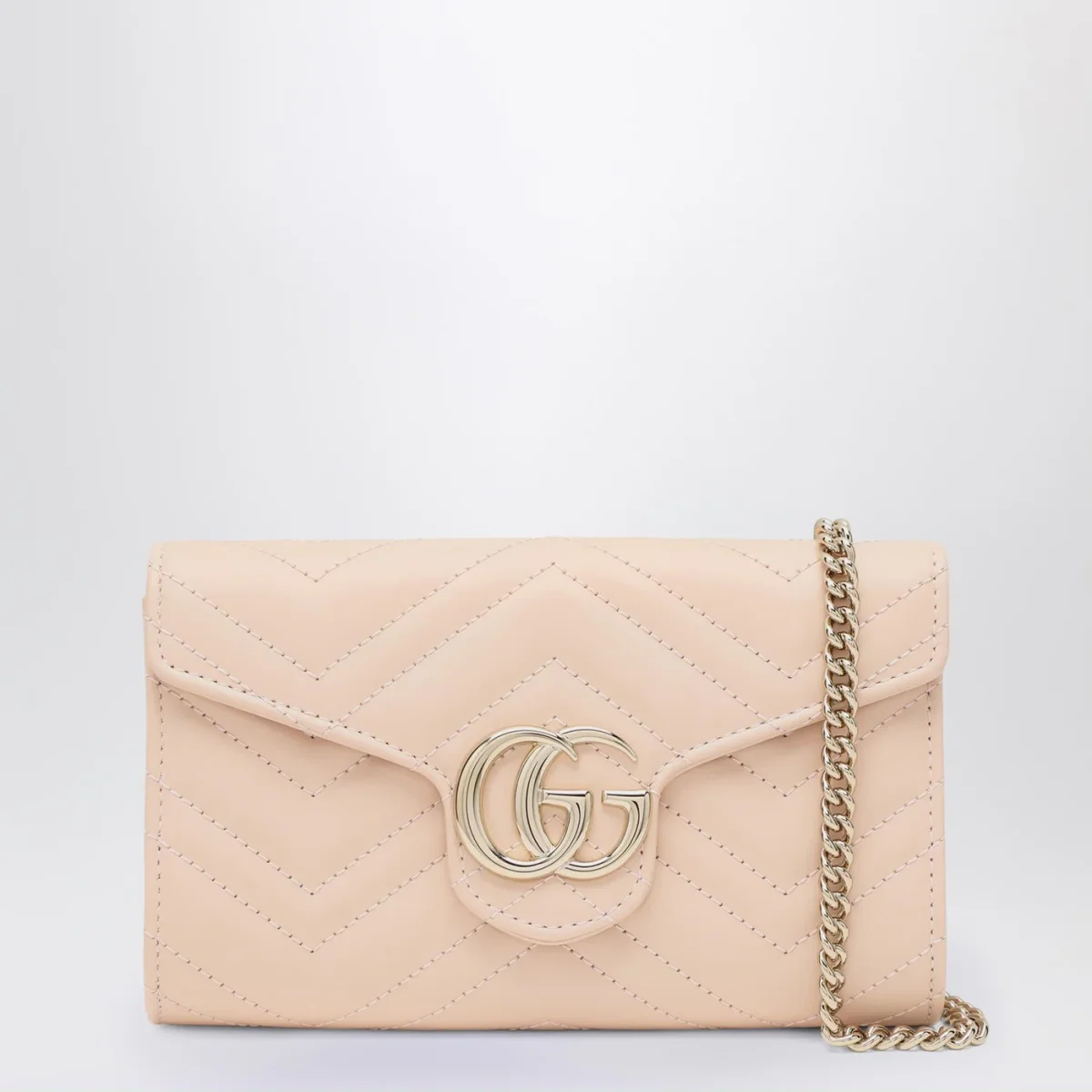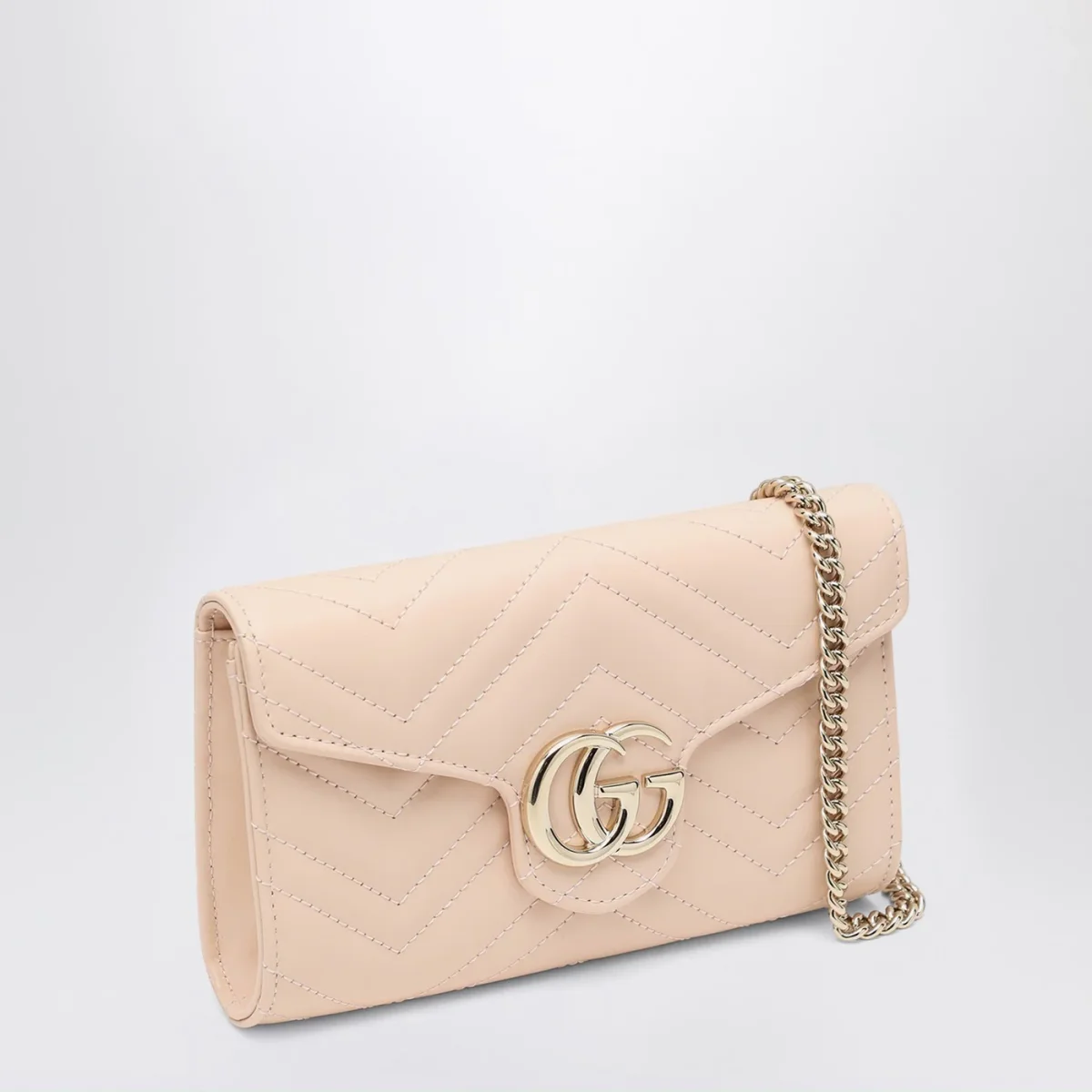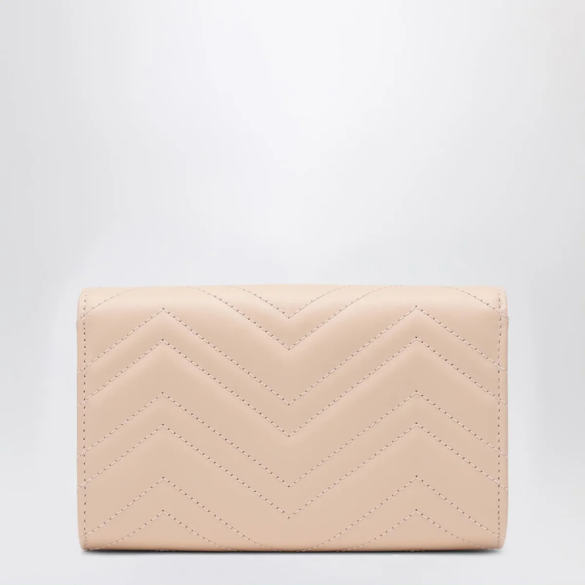 Portafoglio di Gucci in pelle matelassé rosa con motivo chevron, caratterizzato da tracolla a catena, patta frontale con chiusura magnetica, Doppia G sul davanti, sei fessure per carte, una tasca con cerniera e una tasca con pattina.