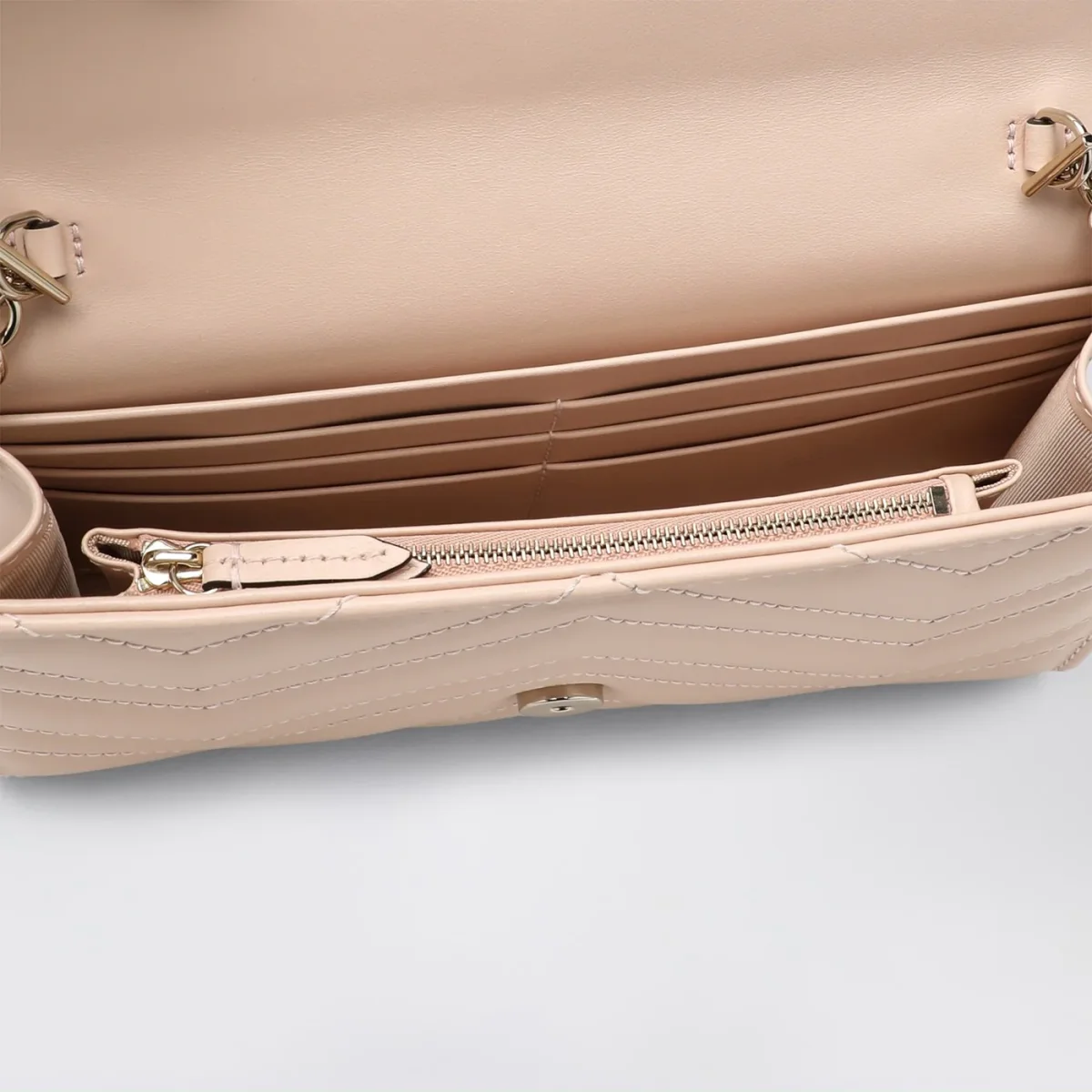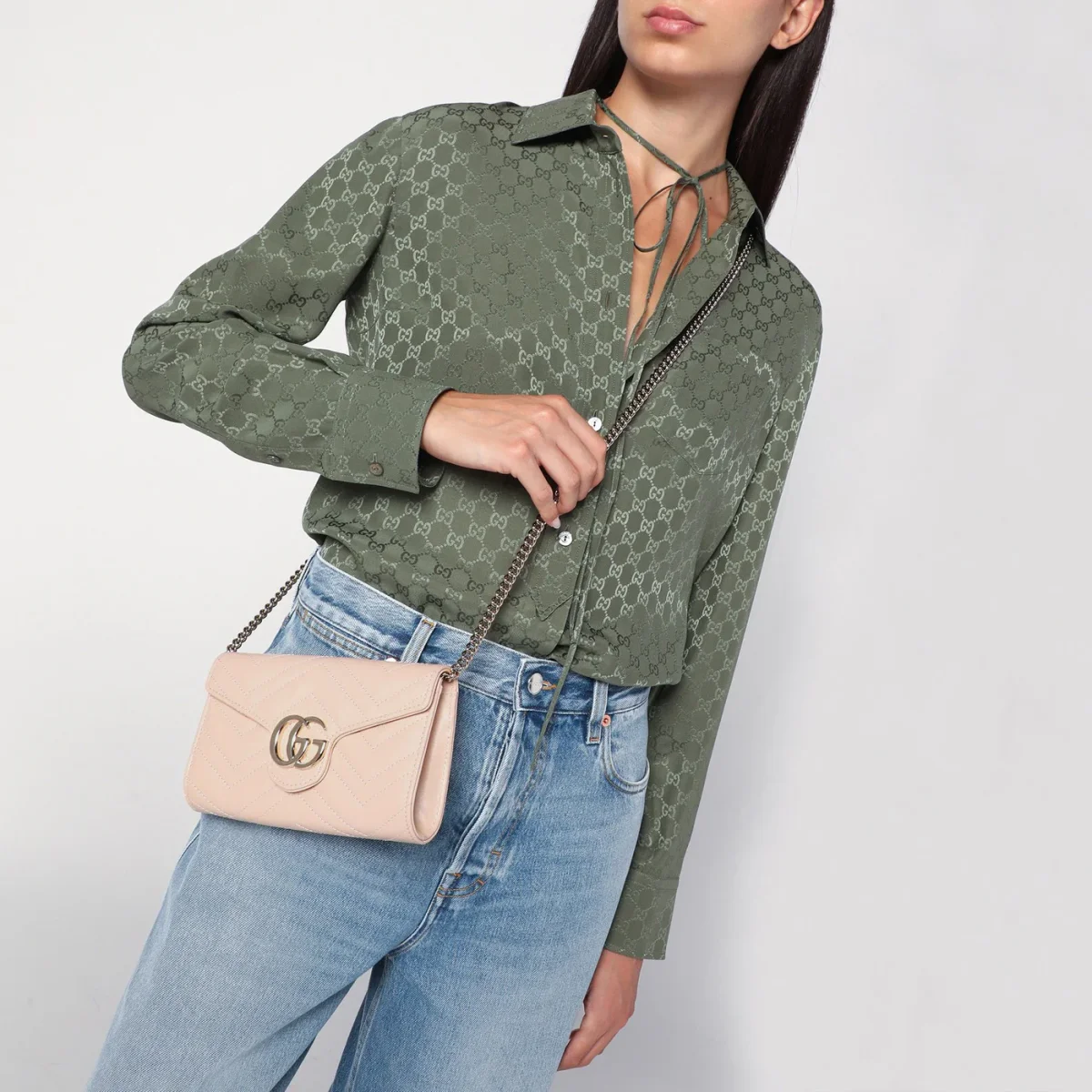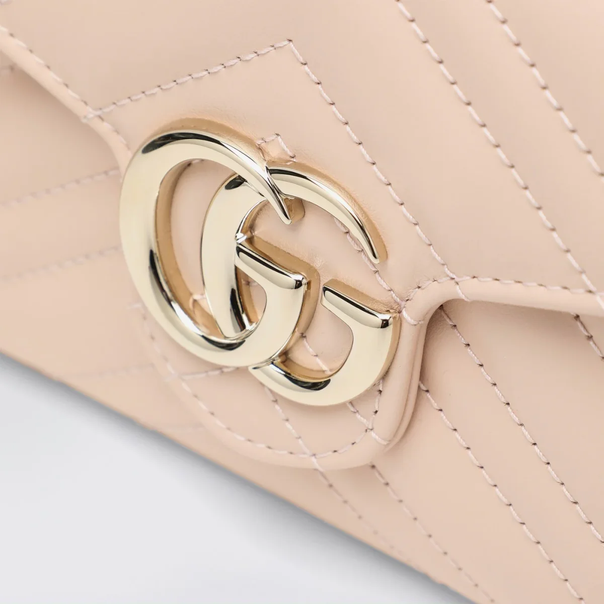 Portafoglio di Gucci in pelle matelassé rosa con motivo chevron, caratterizzato da tracolla a catena, patta frontale con chiusura magnetica, Doppia G sul davanti, sei fessure per carte, una tasca con cerniera e una tasca con pattina.