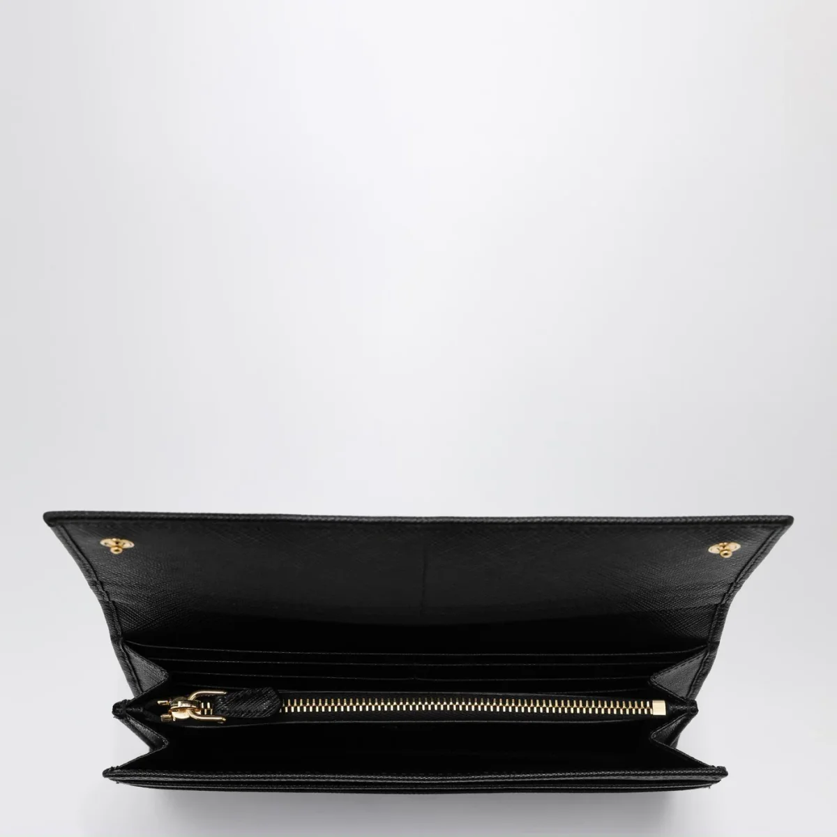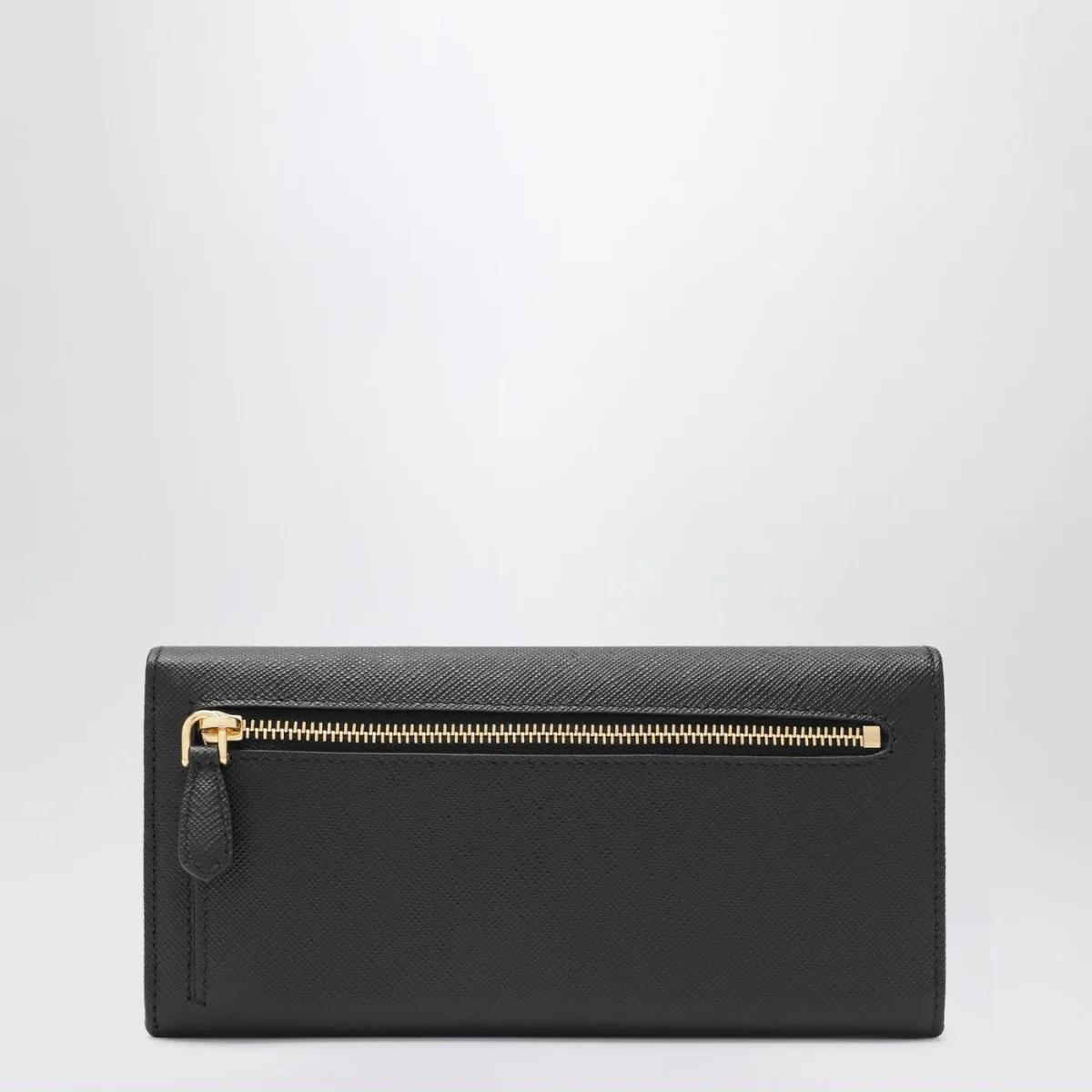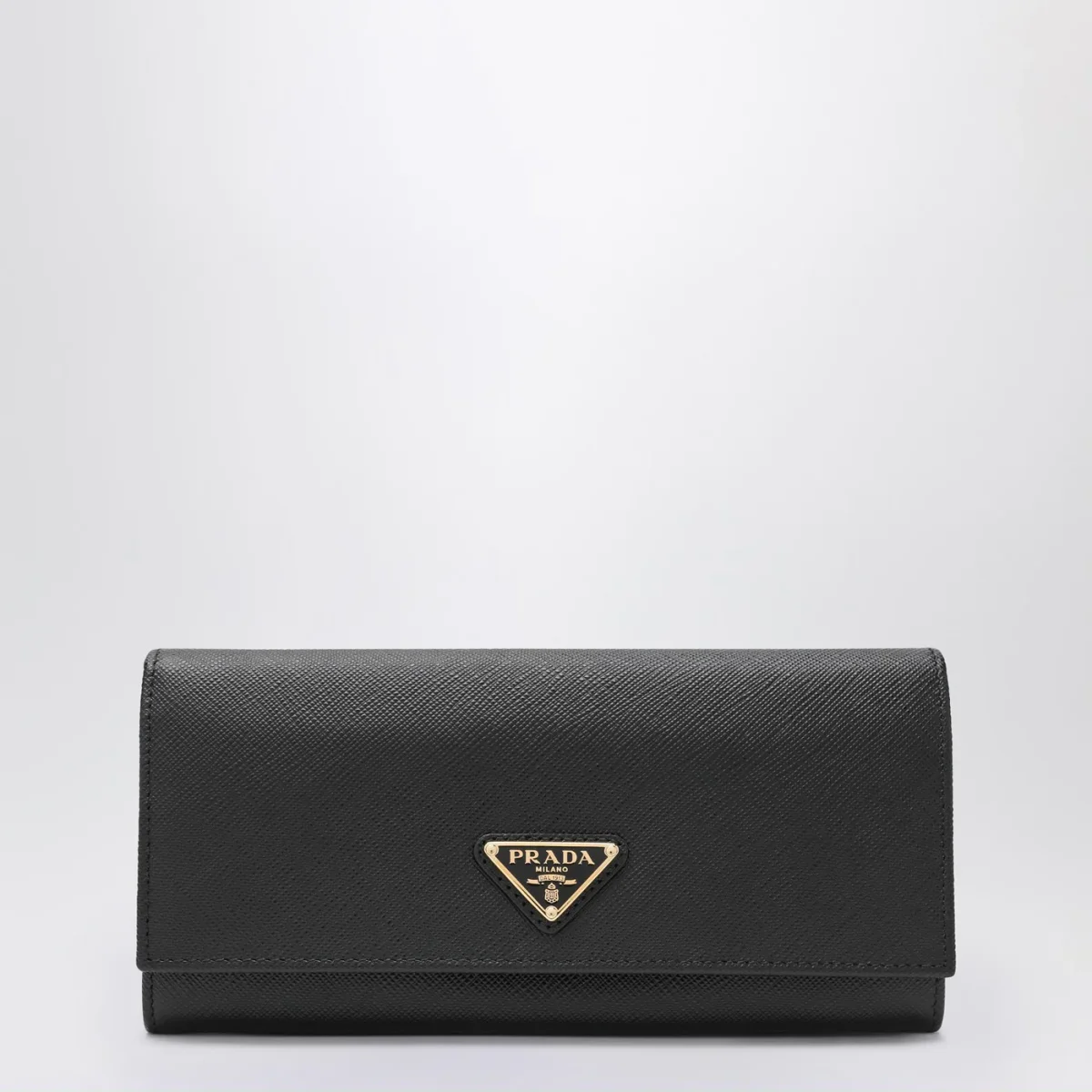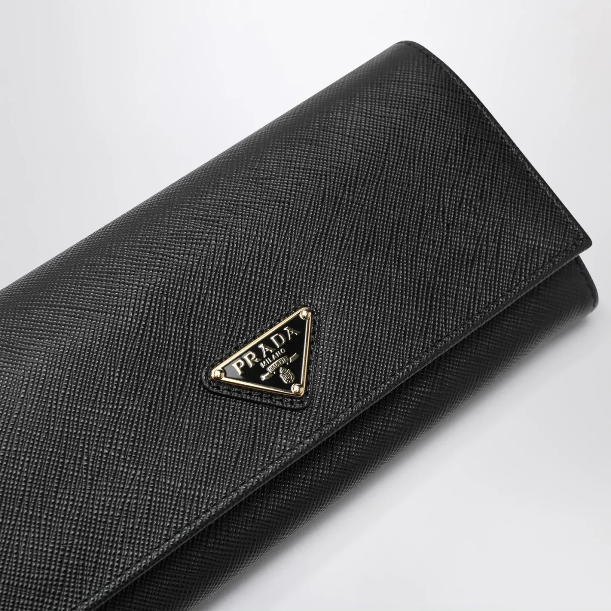 Portafoglio continental grande di Prada in pelle Saffiano nero, caratterizzato da logo triangolo in metallo smaltato sul davanti, chiusura con bottoni a pressione, due scomparti porta banconote, dieci slot portacarte, quattro tasche interne. una tasca interna portamonete con zip, una tasca posteriore esterna con zip e porta badge rimovibile.