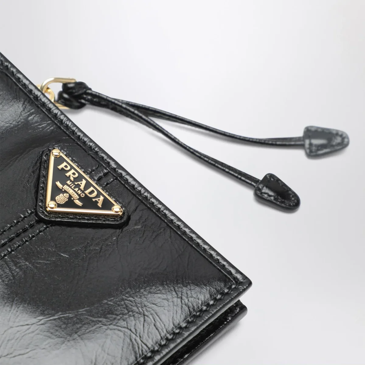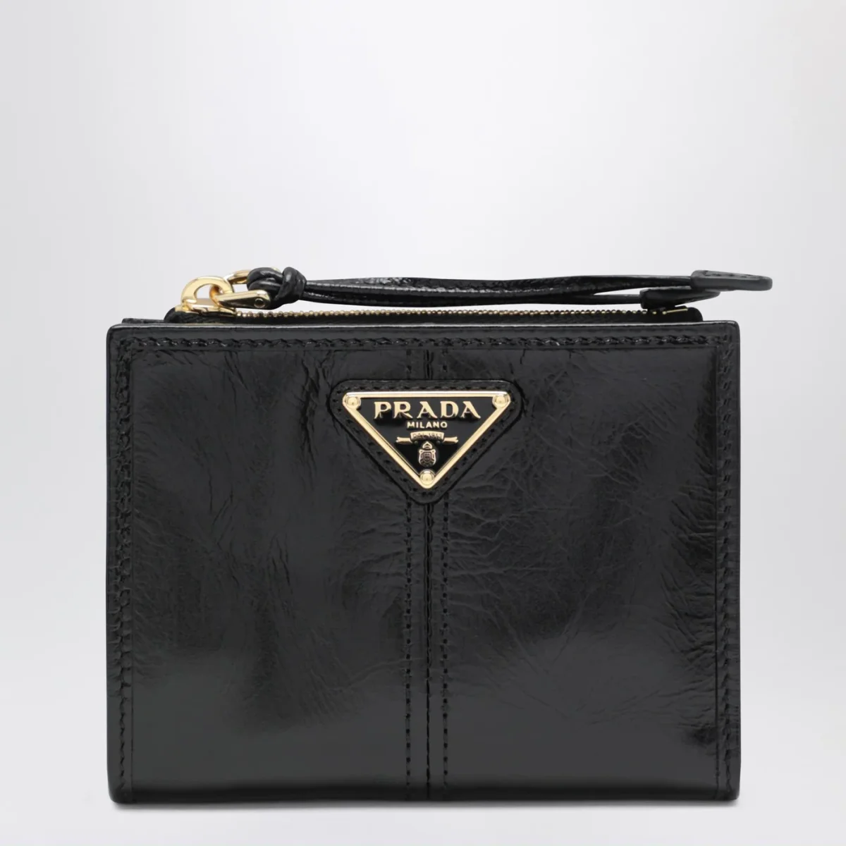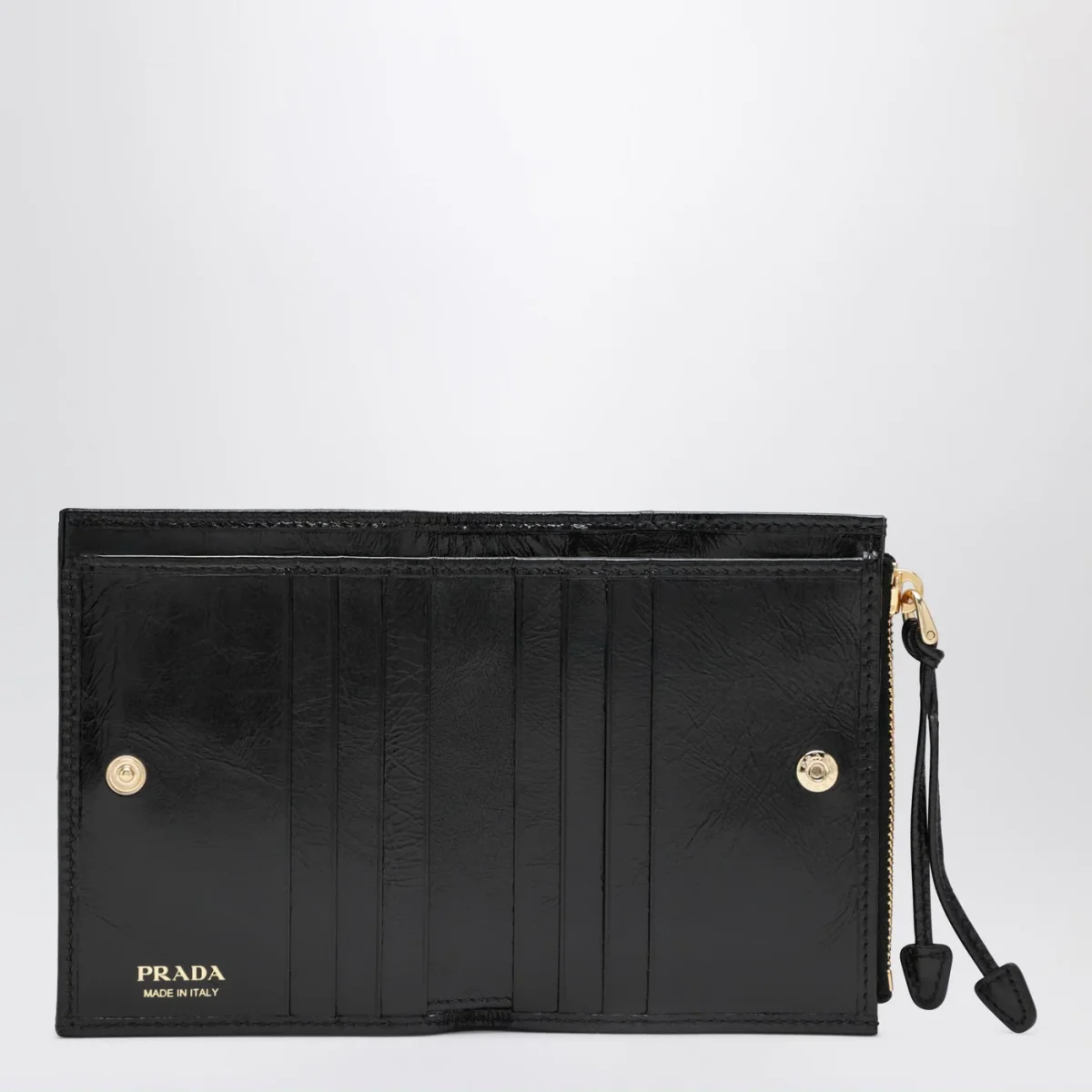 Portafoglio piccolo di Prada in pelle nero • logo triangolo in metallo smaltato• chiusura con bottone a pressione• uno scomparto porta banconote• sei slot portacarte• due tasche interne• portamonete interno con zip