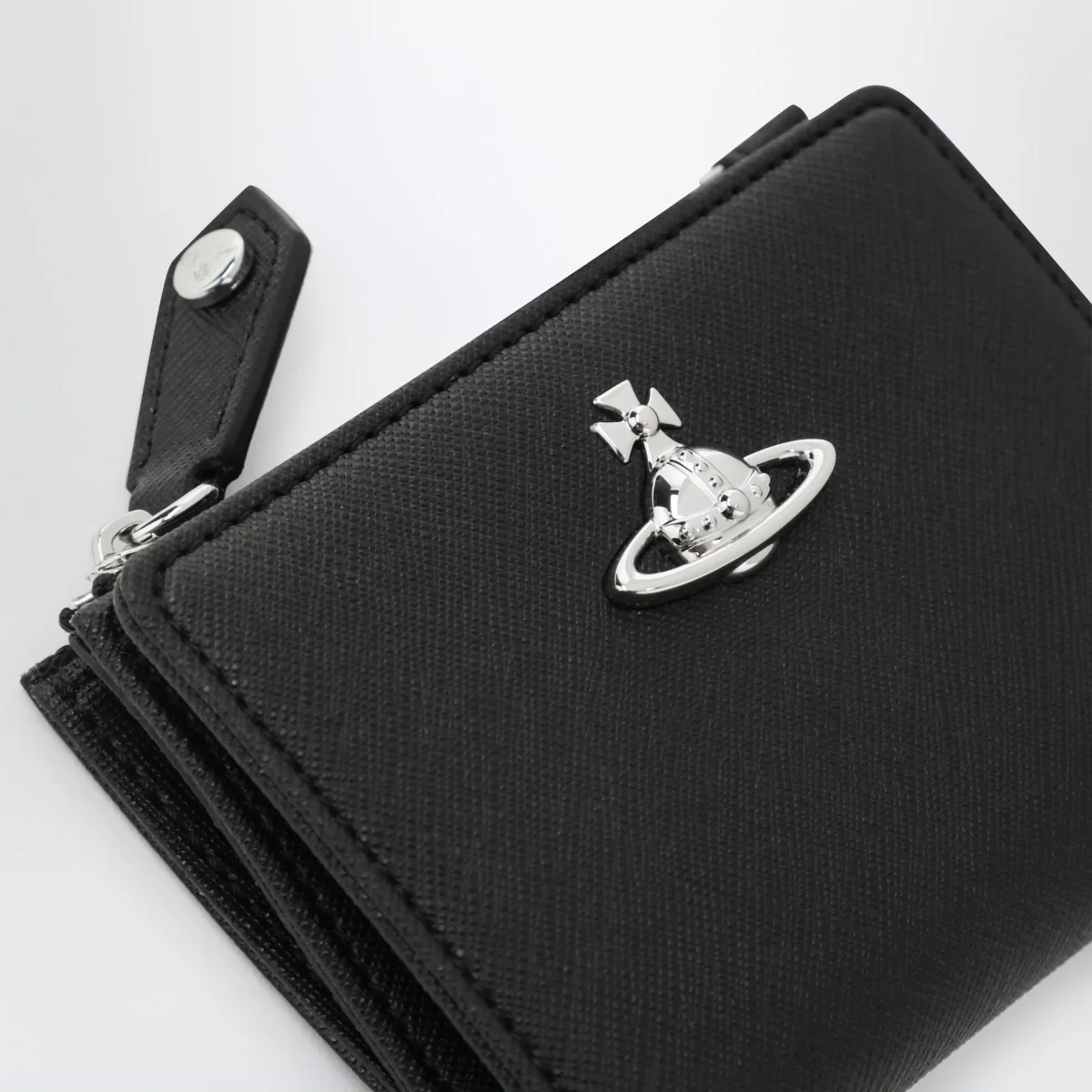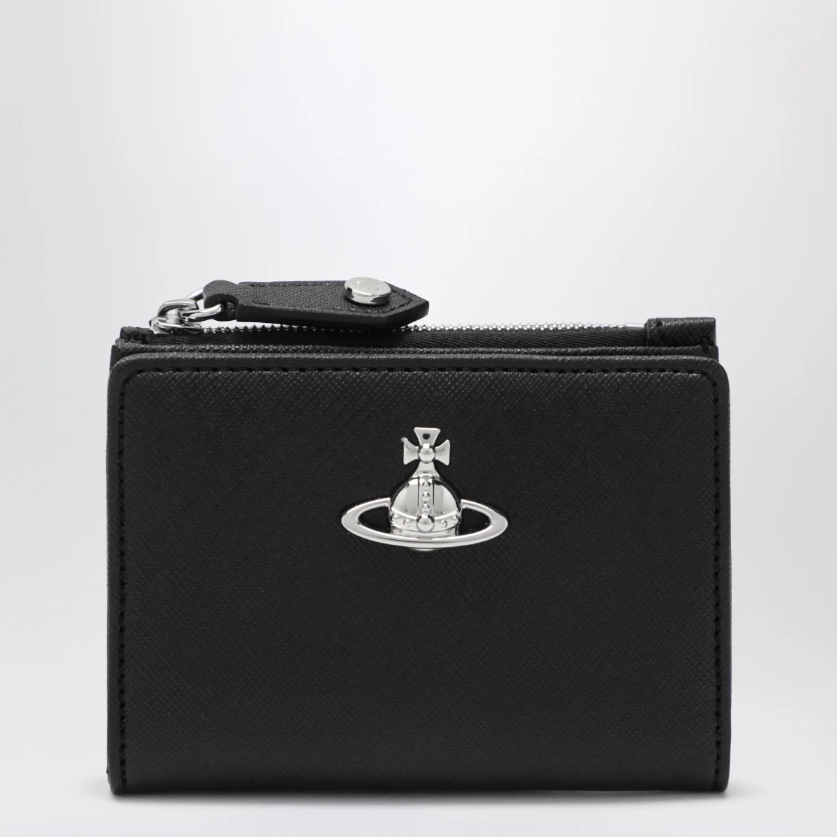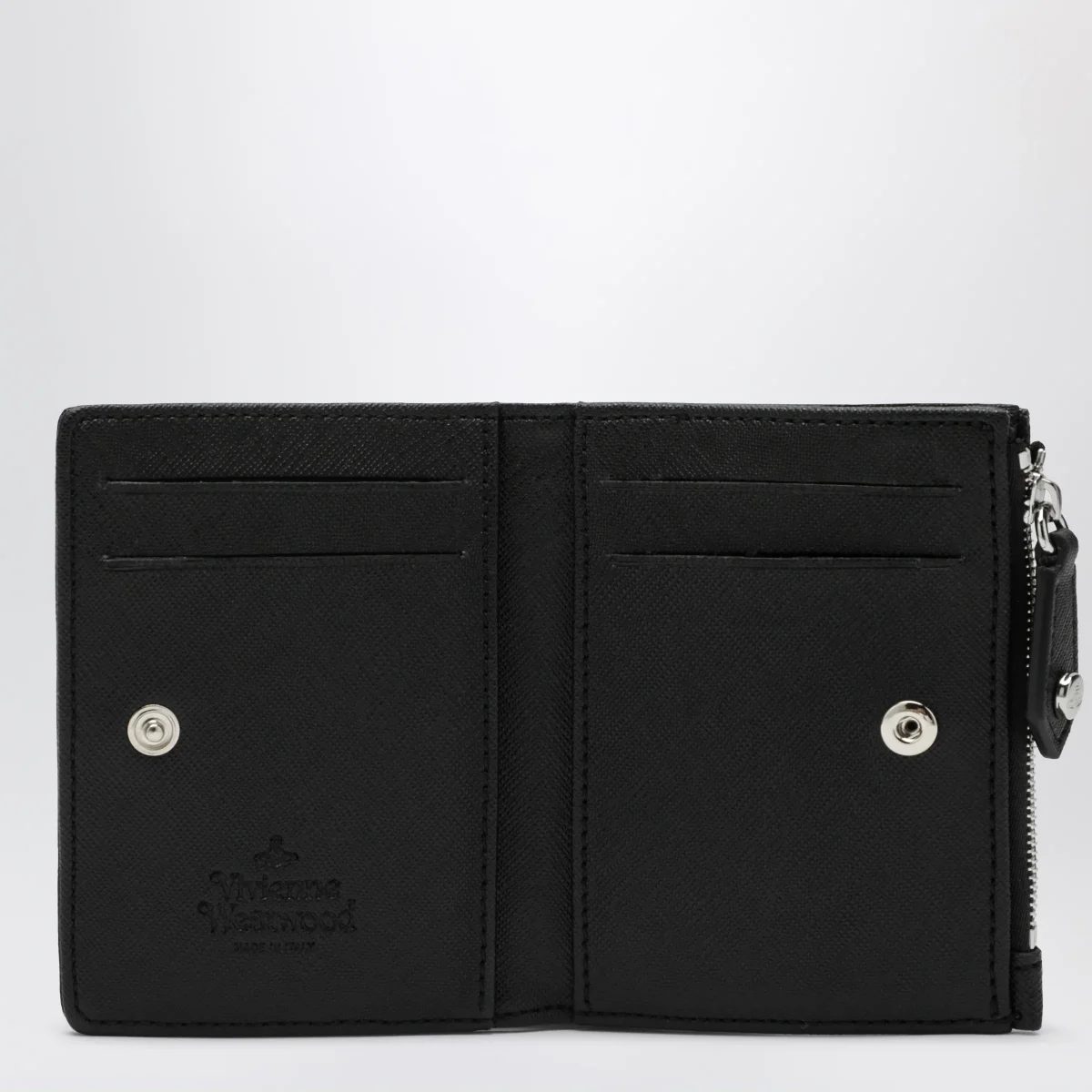 Portafoglio piccolo di Vivienne Westwood in pelle• Colore: Nero• Una tasca con zip• Varie tasche portacarte interne• Chiusura con bottone a pressione• Logo Orb metallico sul davanti• Hardware in metallo color argento