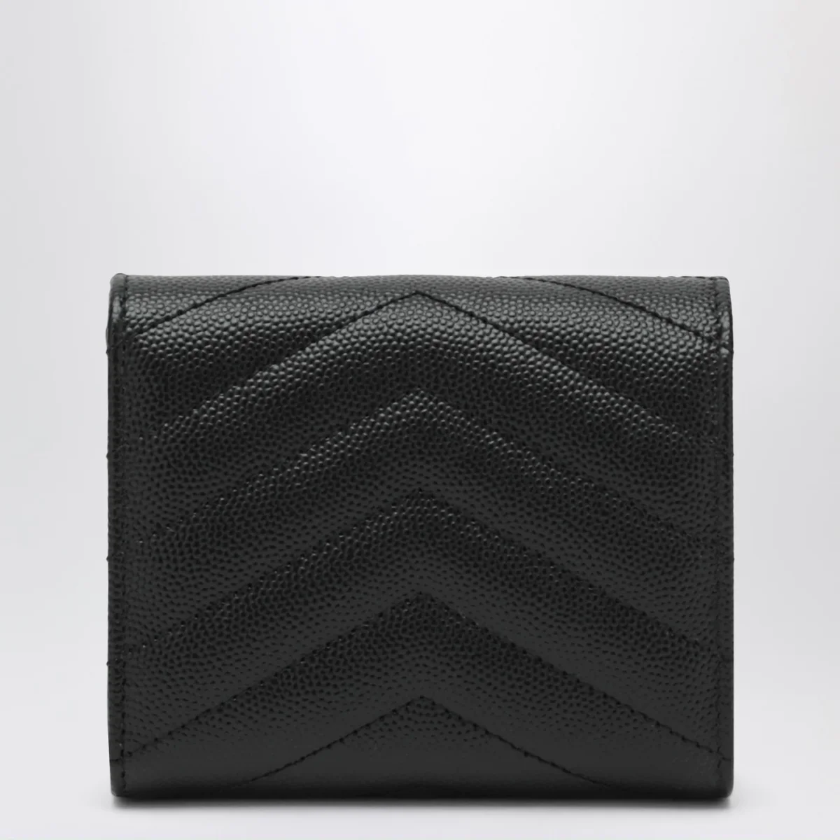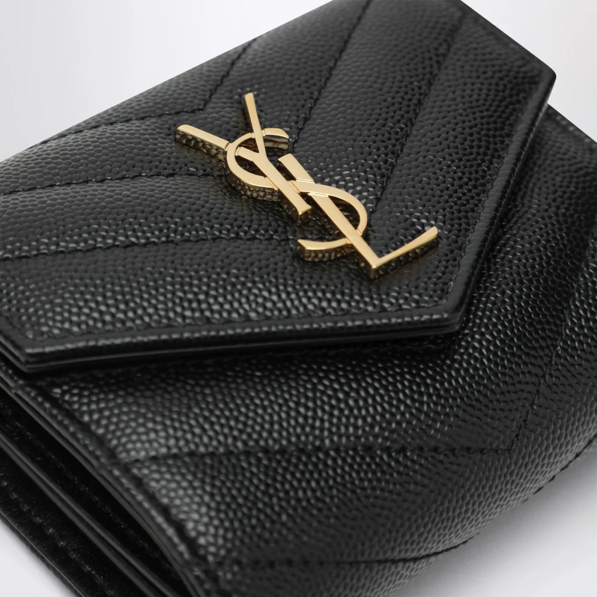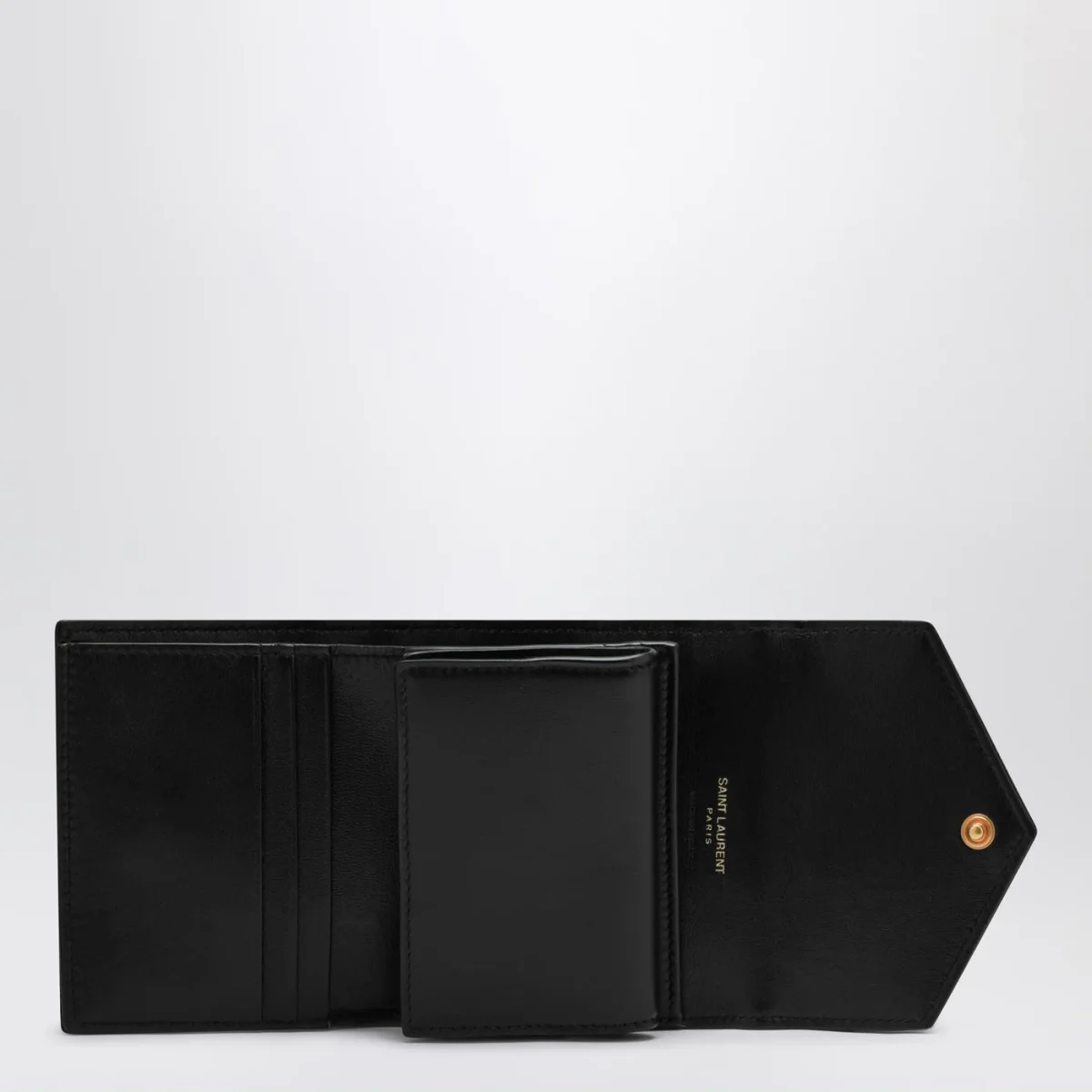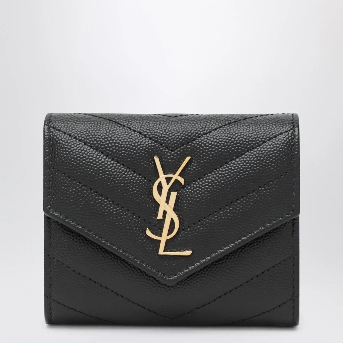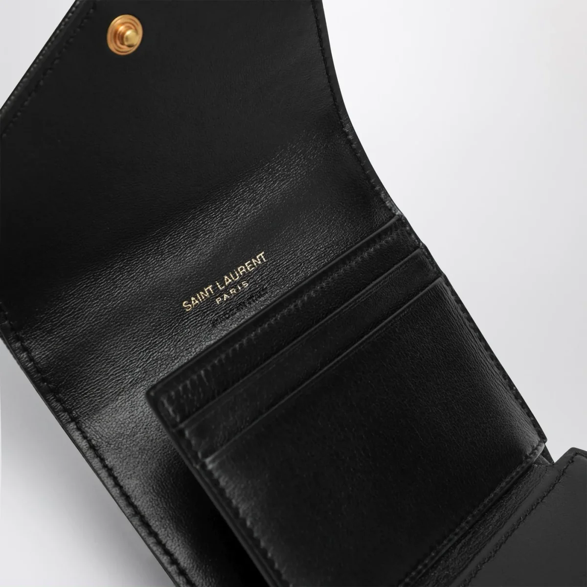 Portafoglio tri-fold di Saint Laurent in pelle matelassé nero, caratterizzato da impunture trapuntate, chiusura con bottone automatico, cinque fessure per carte, portamonete, uno scomparto per banconote, uno scomparto per ricevute e iniziali dorate in metallo sul davanti.