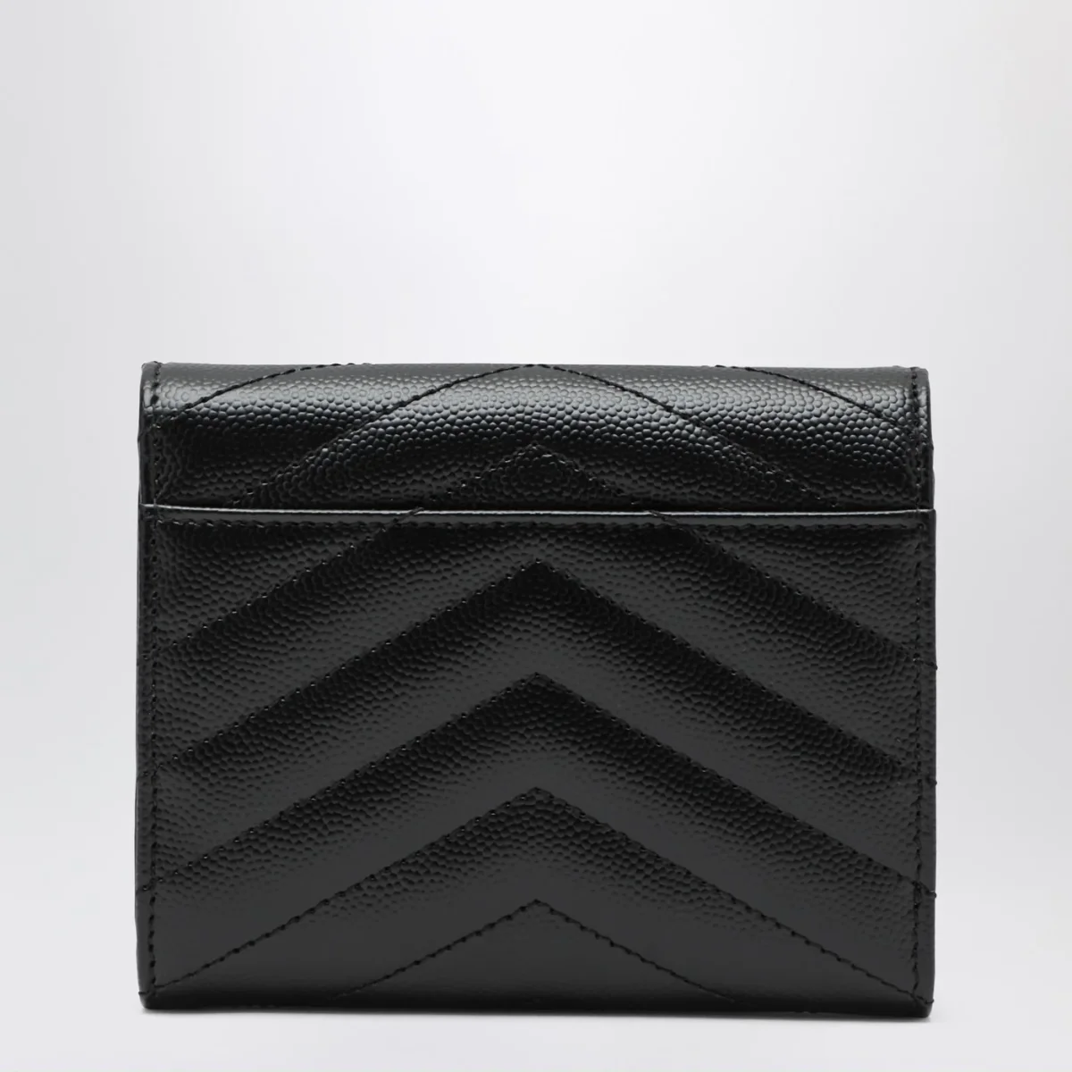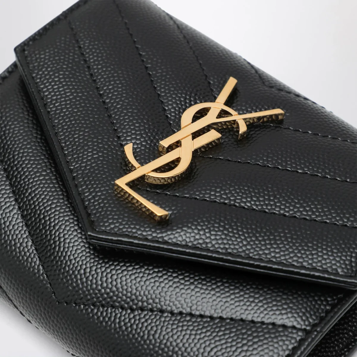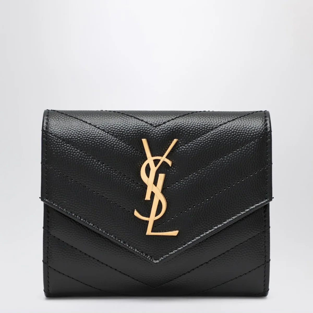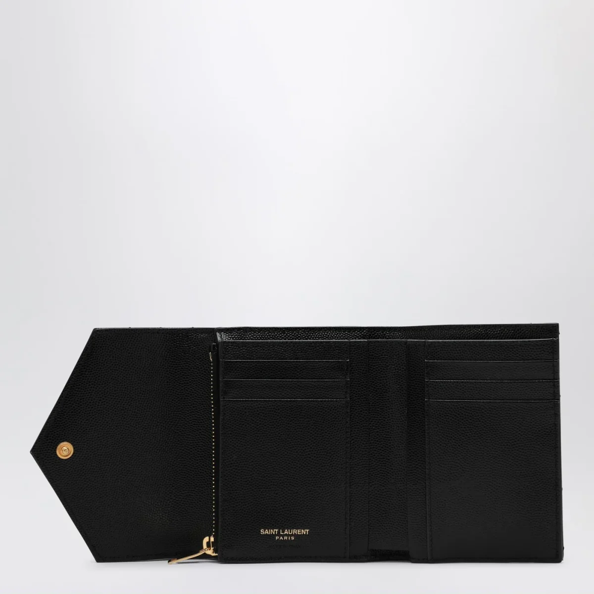Portafoglio di Saint Laurent in pelle grain de poudre nero• impunture trapuntate• logo Cassandre in metallo sul davanti• chiusura con bottone a pressione• una tasca a fessura sul retro• sei scomparti per carte• una tasca porta monete con zip• uno scomparto per banconote• quattro scomparti per ricevute