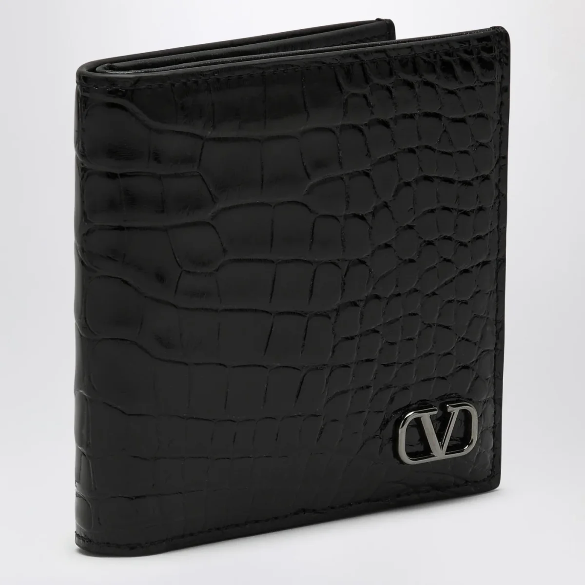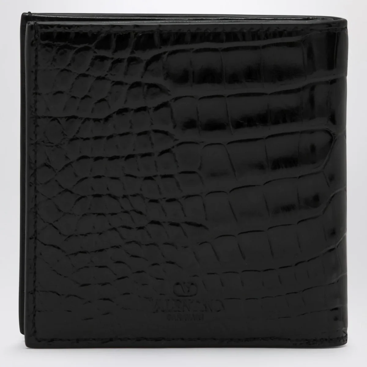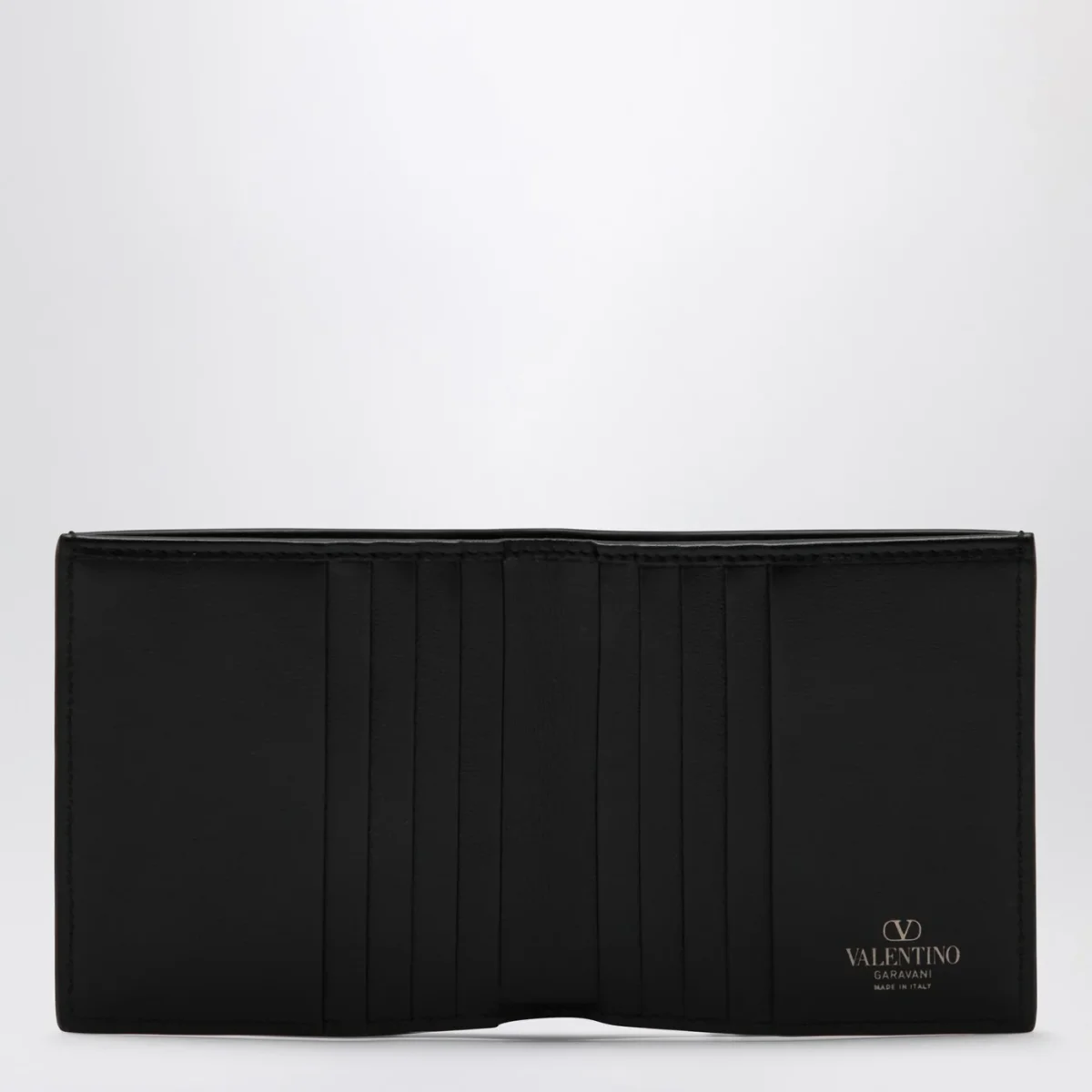 Portafoglio orizzontale di Valentino Garavani in pelle effetto cocco nero, caratterizzato da VLogo Signature sul davanti, uno scomparto per banconote e vari slot per carte interni.