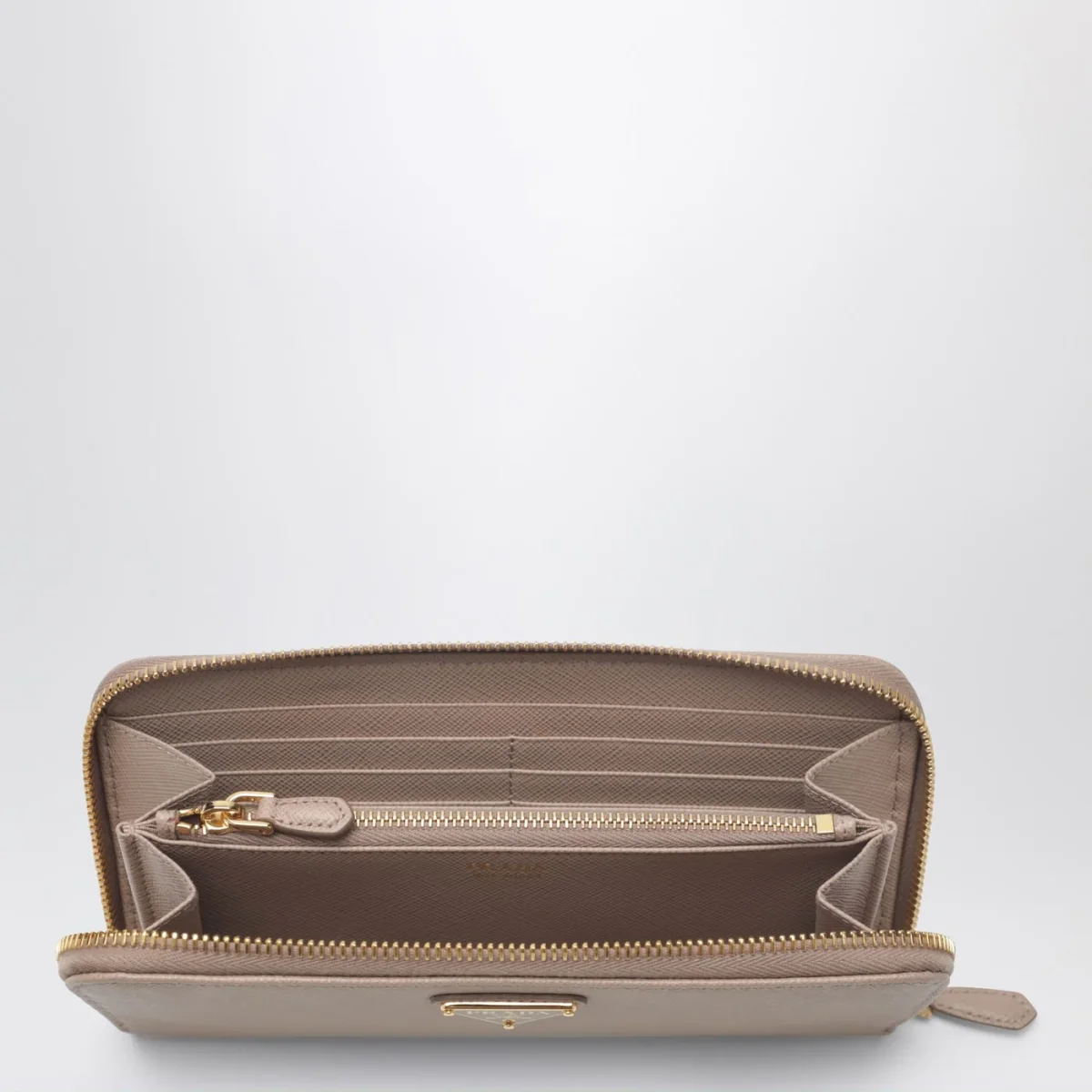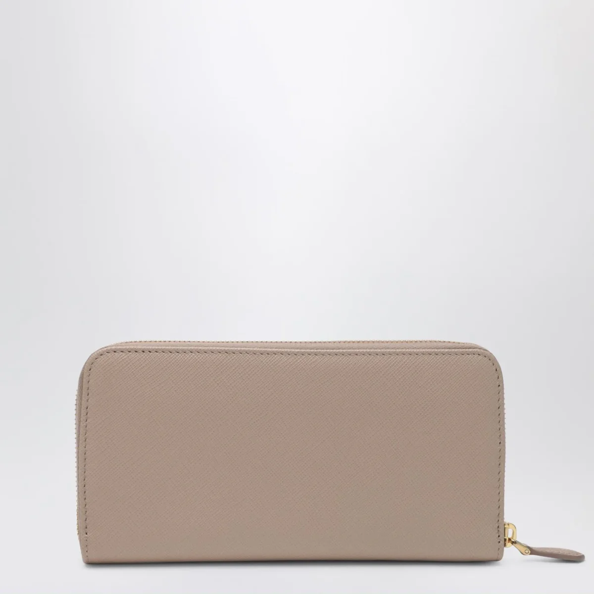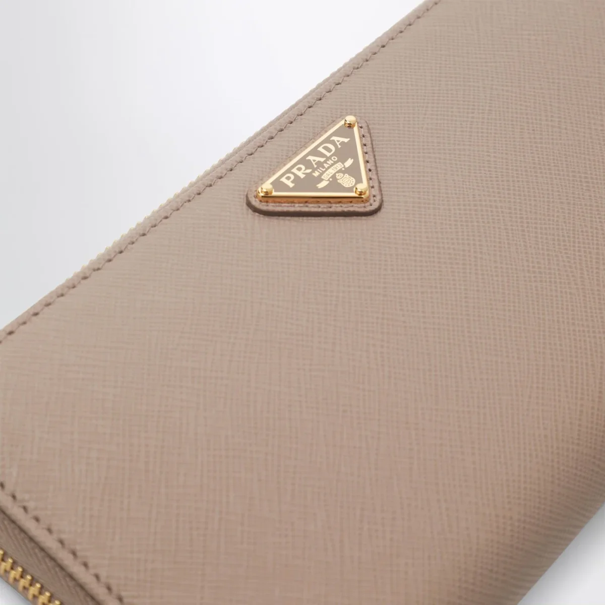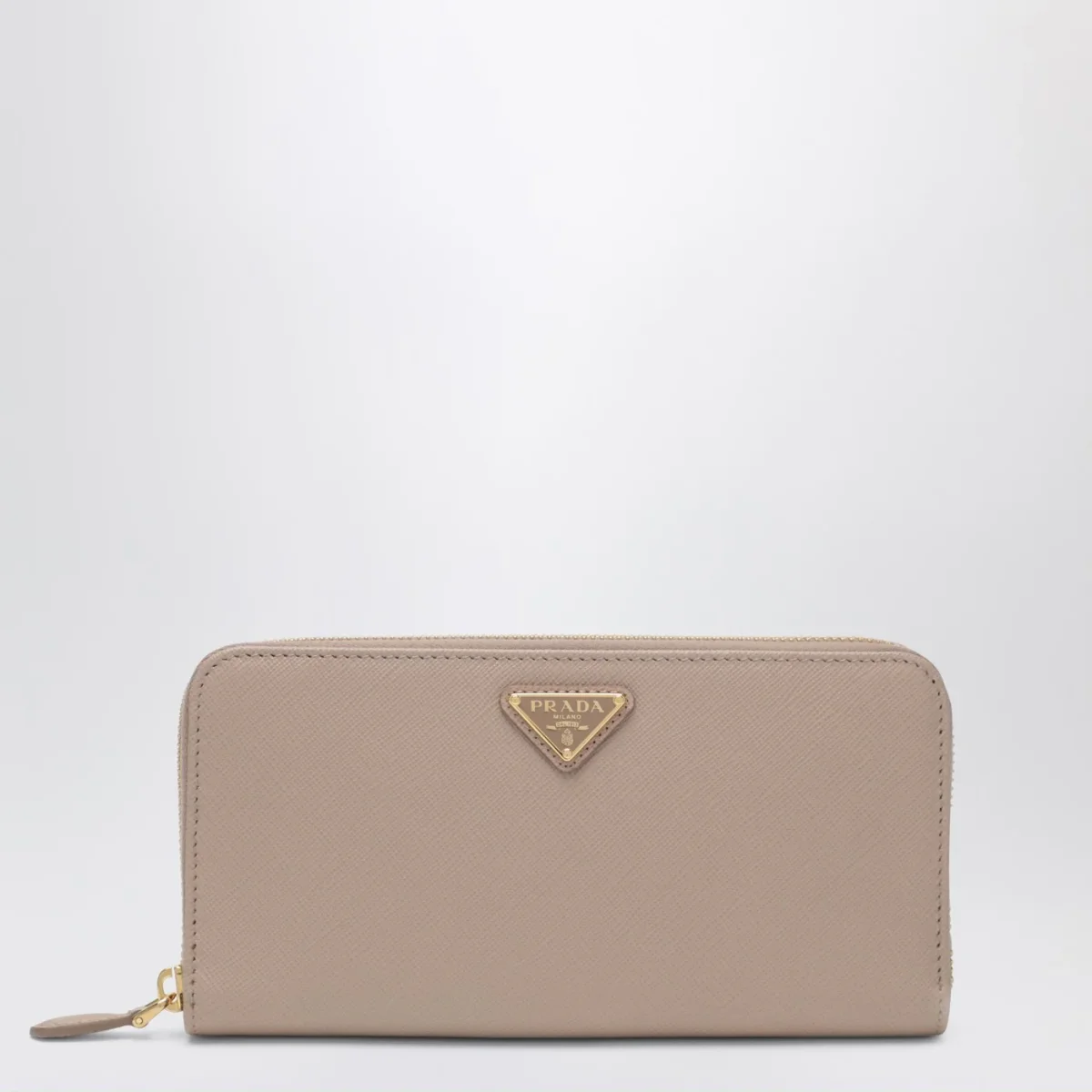 Portafoglio zip around di Prada con logo dorato• realizzato in raffinata pelle Saffiano colori cipria •sedici fessure portacarte• una tasca con zip portamonete• quattro compartimenti per le banconote