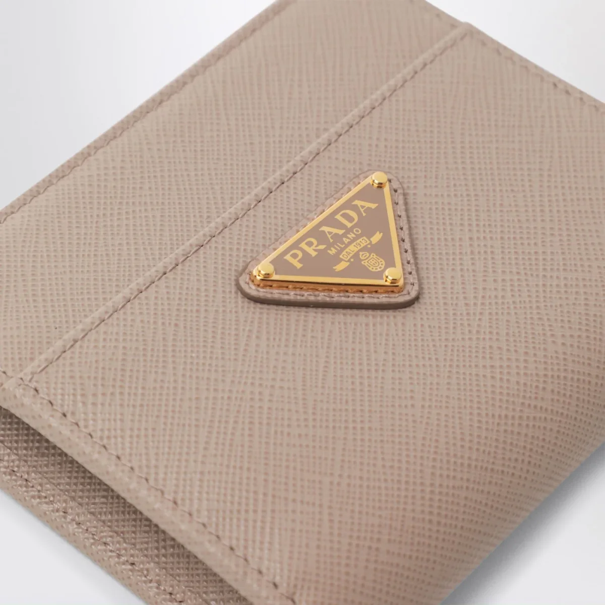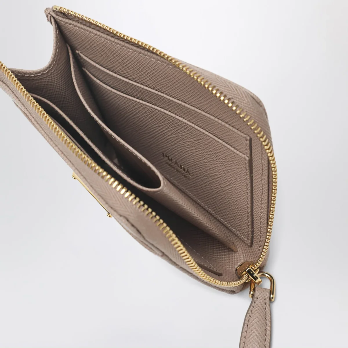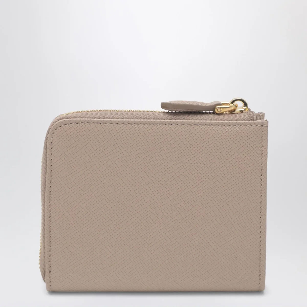 Portafoglio piccolo di Prada in pelle Saffiano color cipria• chiusura con zip• triangolo logo in metallo smaltato sul davanti• quattro slot per carte di credito• uno scomparto per banconote