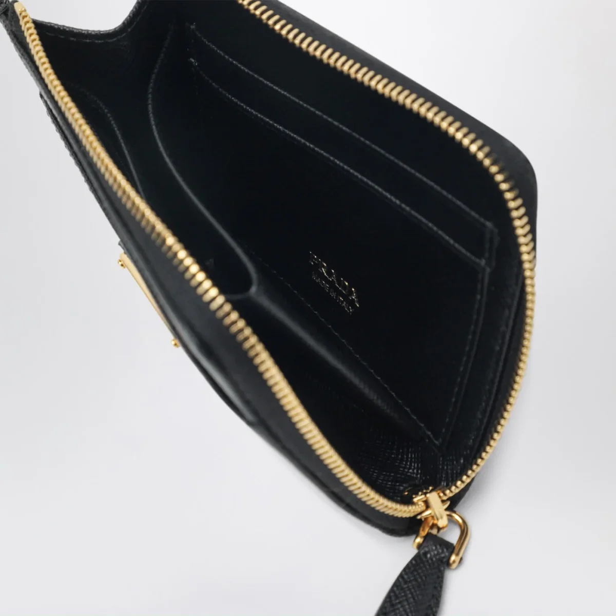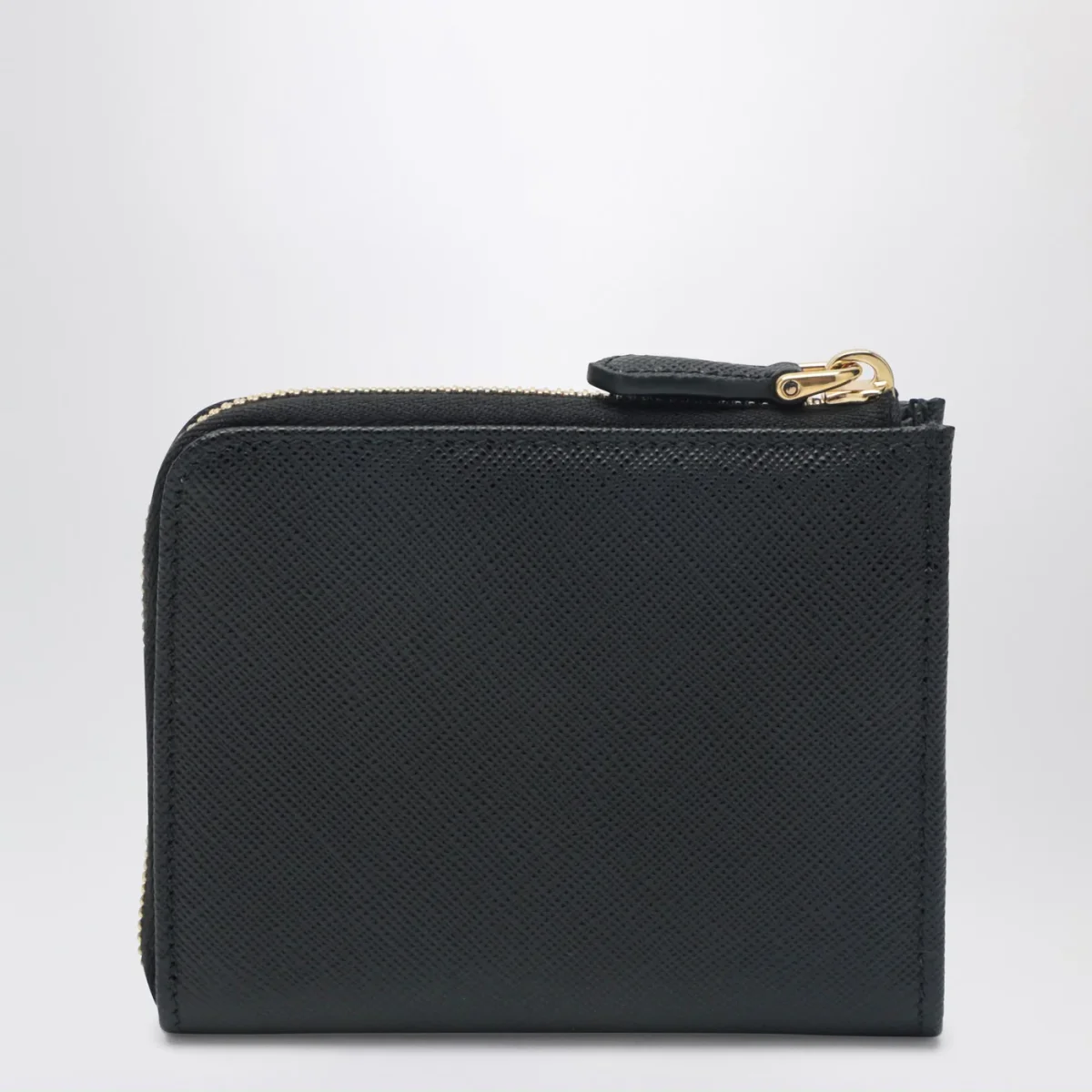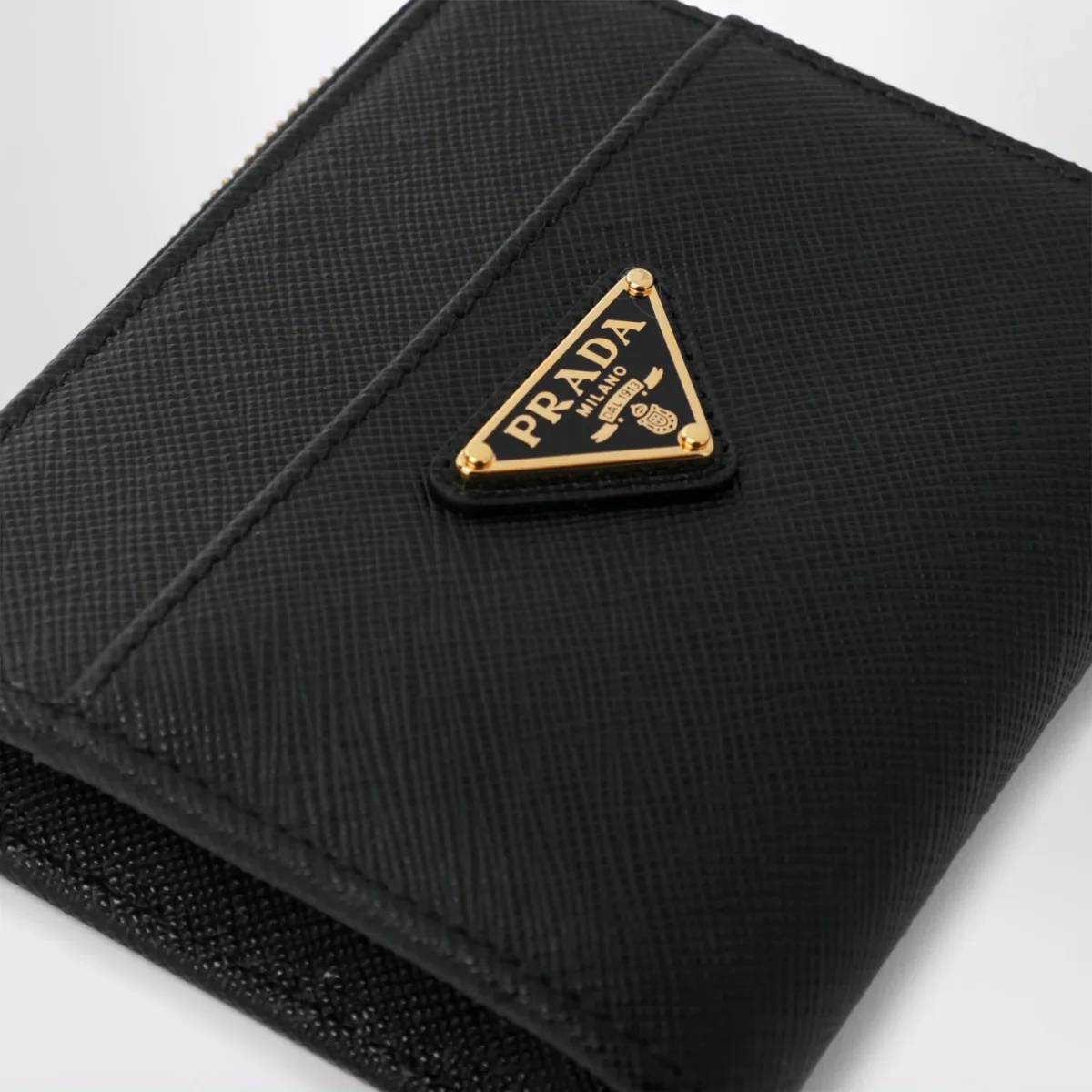 Portafoglio piccolo di Prada in pelle Saffiano nero• chiusura con zip• triangolo logo in metallo smaltato sul davanti• quattro slot per carte di credito• uno scomparto per banconote
