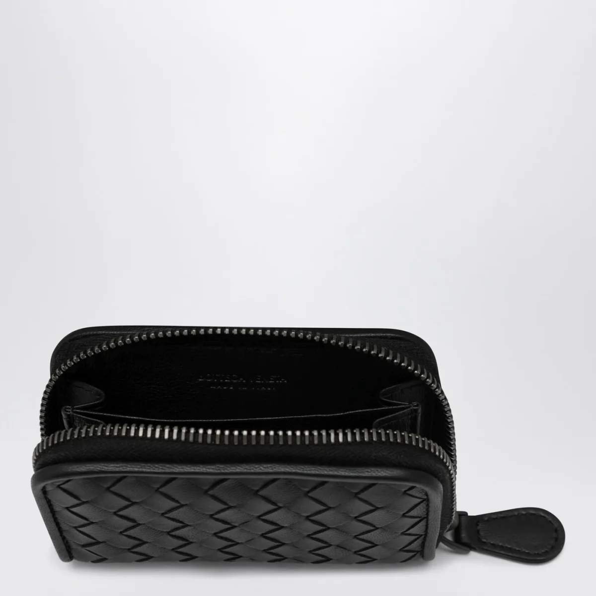 Portafoglio piccolo di Bottega Veneta in pelle nera con motivo Intrecciato, caratterizzato da chiusura con zip e due scomparti centrali.