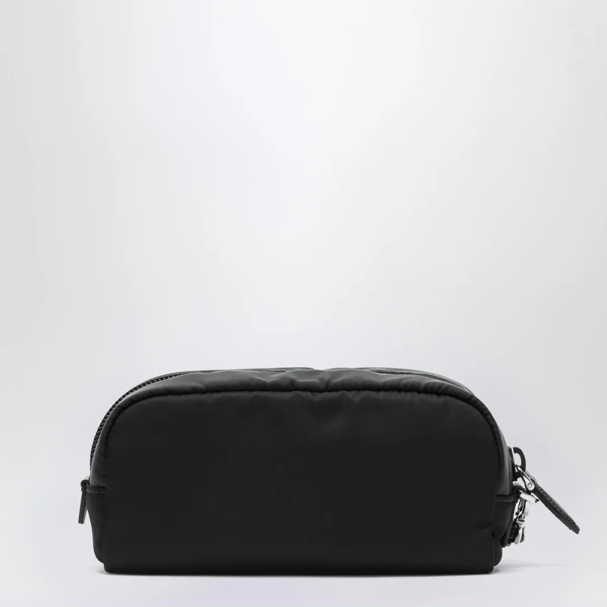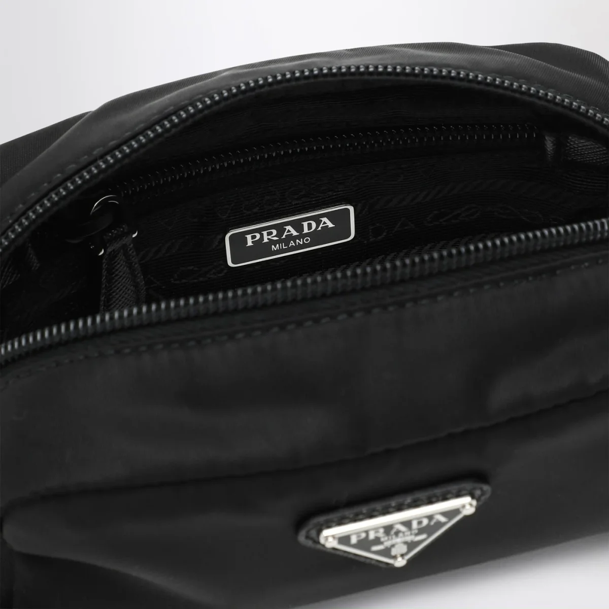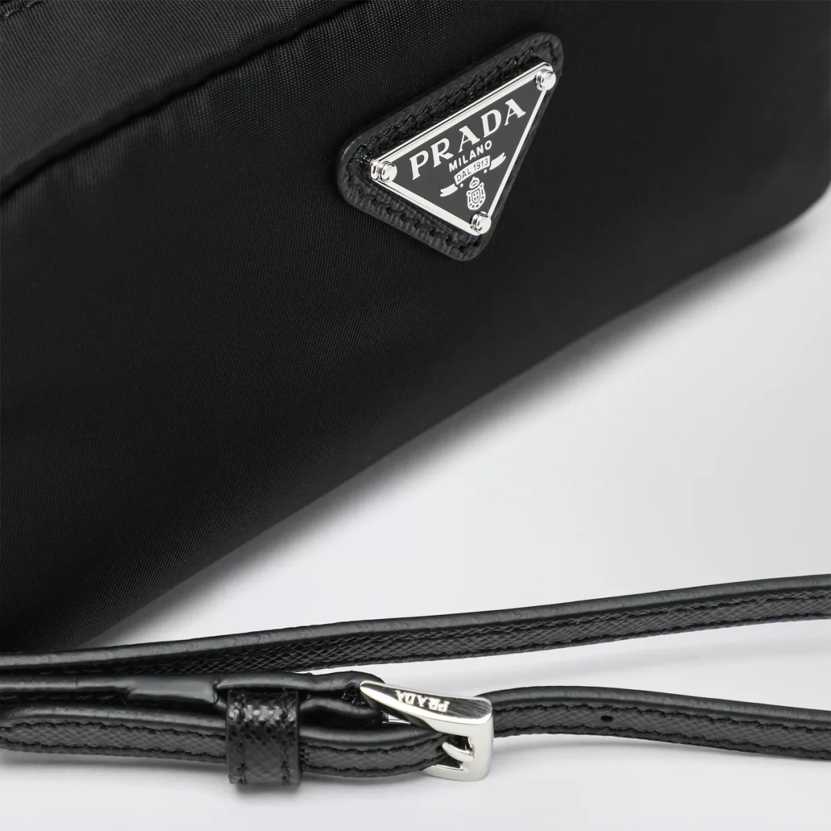 Portatutto di Prada in Re-Nylon nero, caratterizzato da chiusura con zip, una tasca interna con zip, hardware in metallo color argento, triangolo logo in metallo smaltato sul davanti, cinturino da polso regolabile e rimovibile e dettagli in pelle Saffiano.