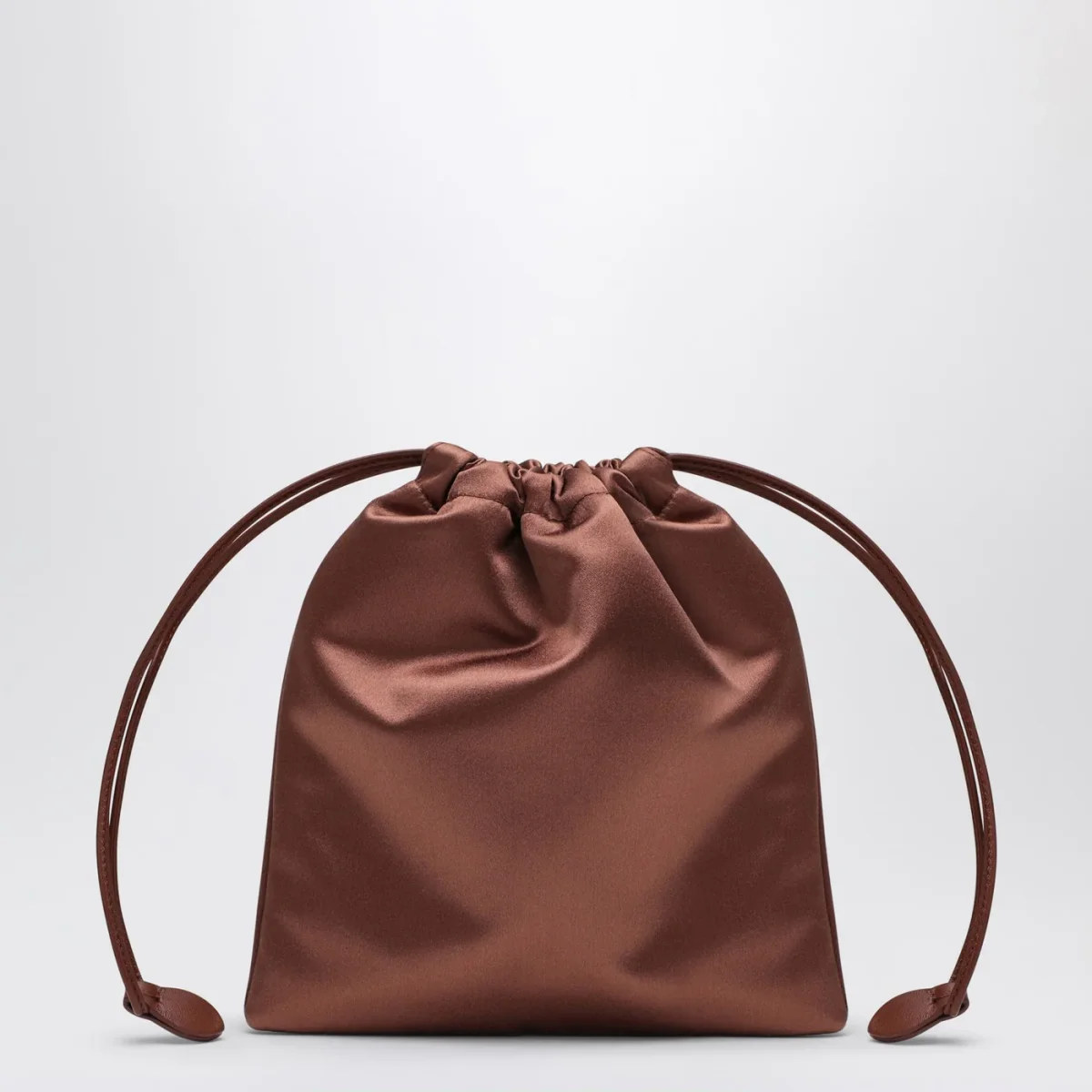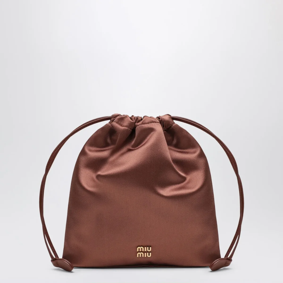 Pouch di Miu Miu in raso color Cacao, caratterizzata da moschettone, chiusura con coulisse in pelle e logo lettering in metallo dorato sul davanti.