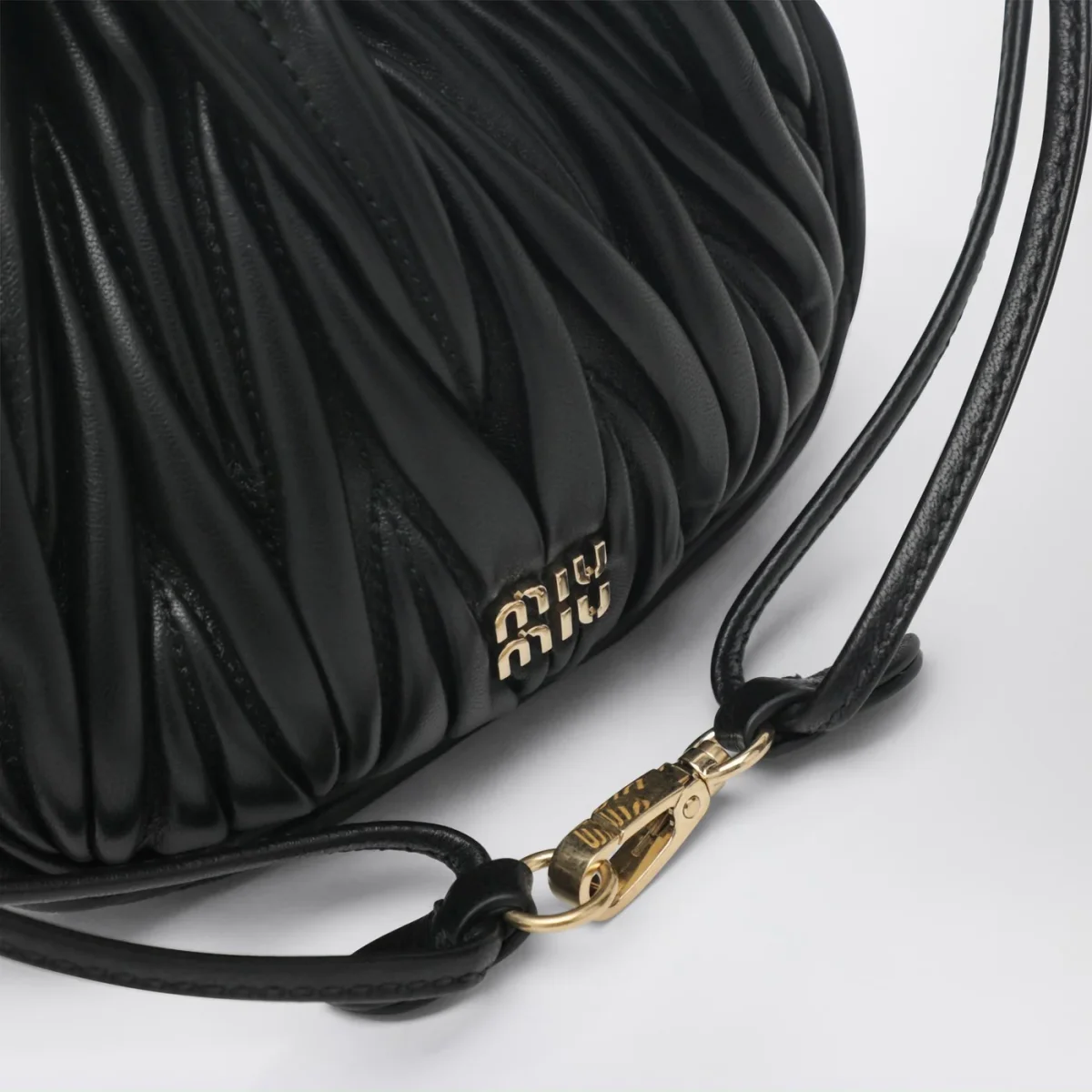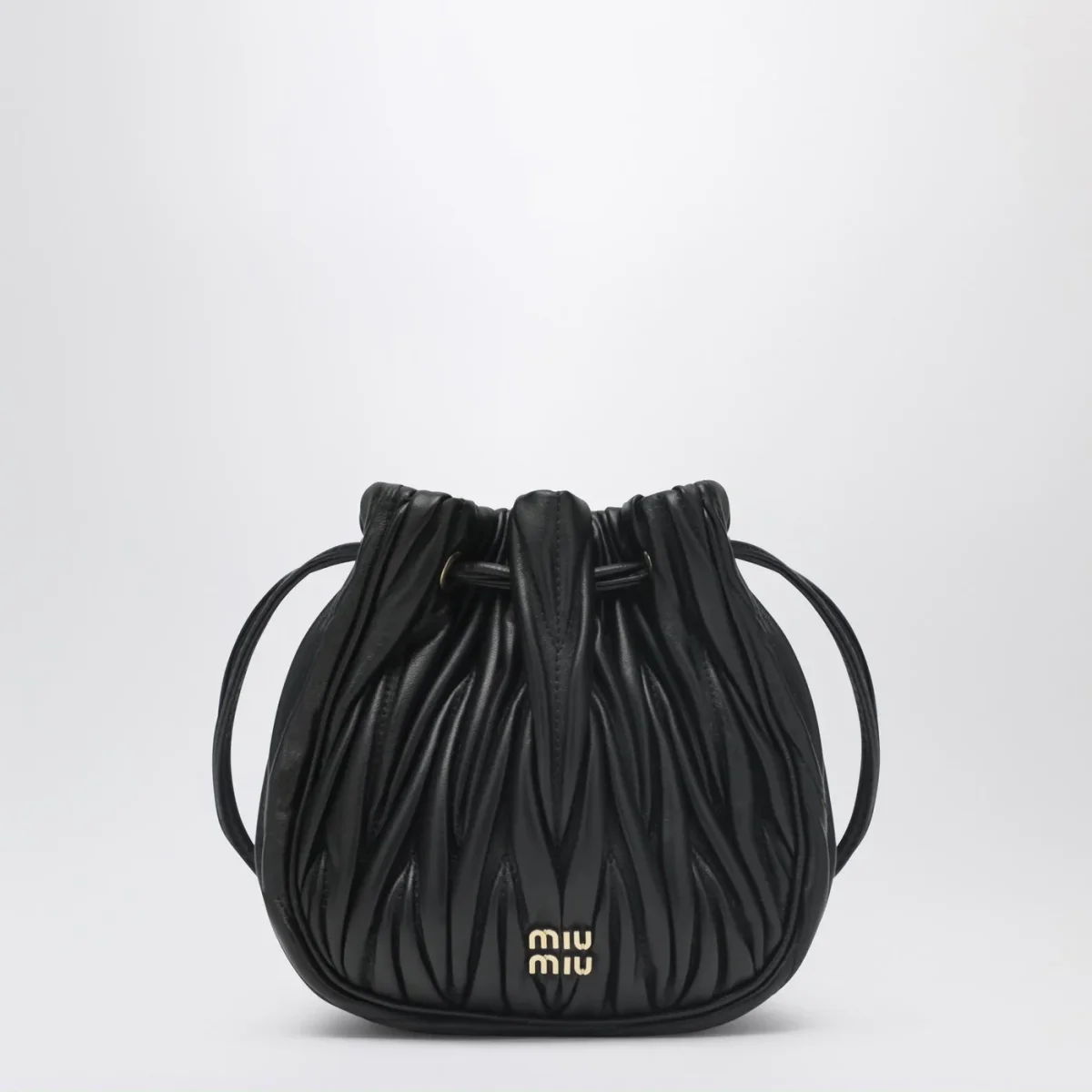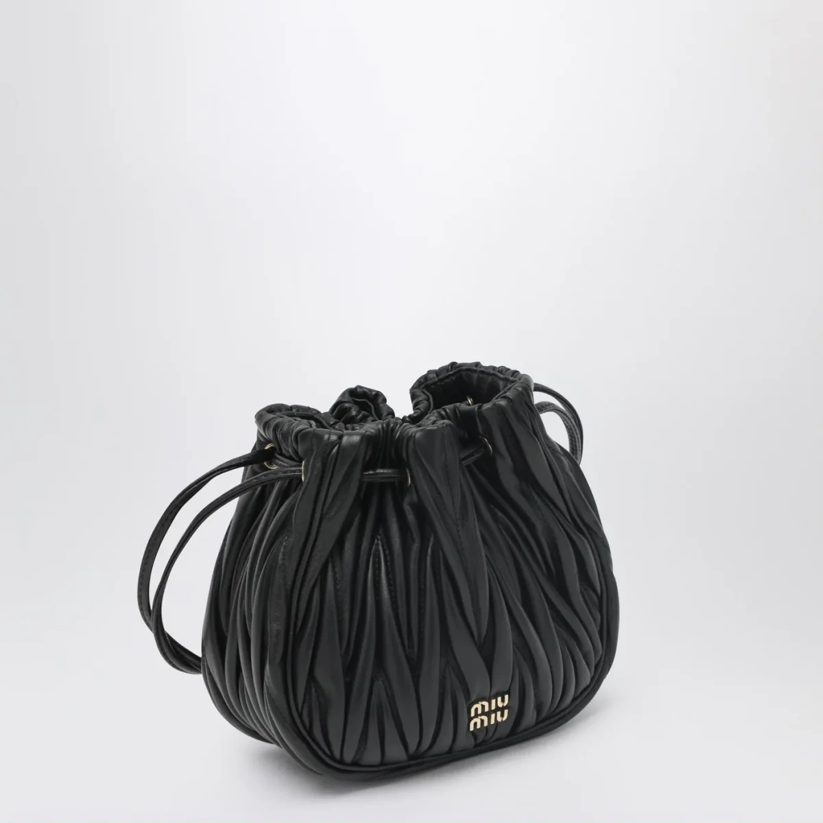 Pouch di Miu Miu in pelle nera con lavorazione matelassé, caratterizzata da chiusura con coulisse, hardware in metallo dorato, logo lettering in metallo frontale e interno in raso cotone.