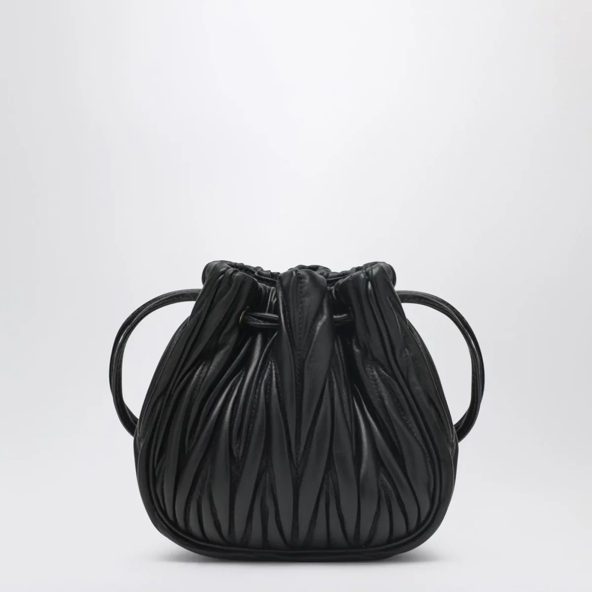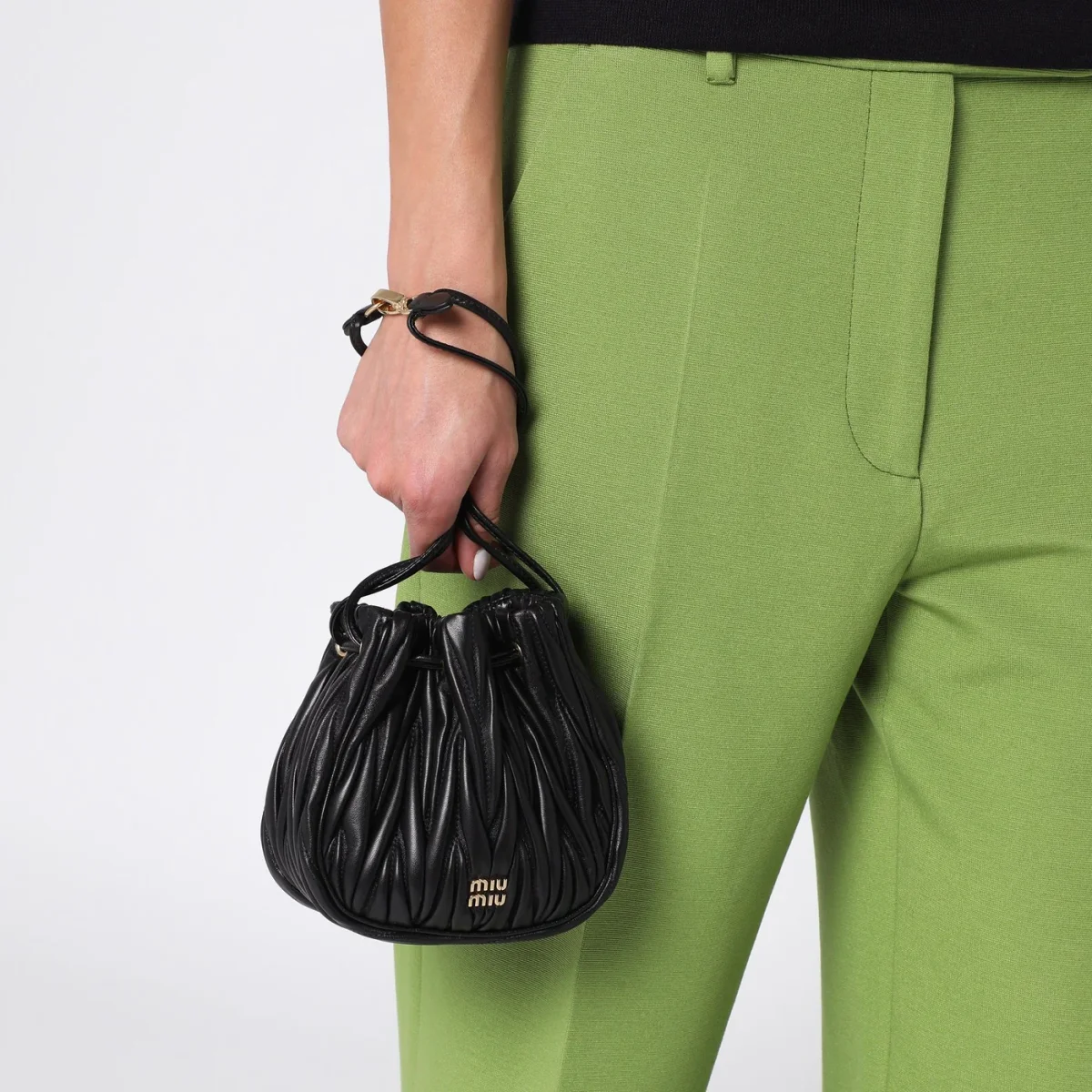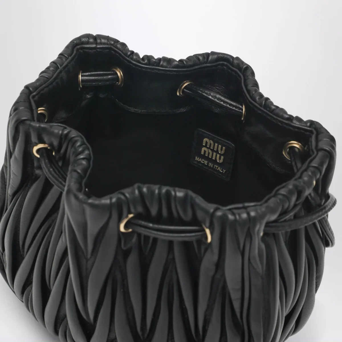 Pouch di Miu Miu in pelle nera con lavorazione matelassé, caratterizzata da chiusura con coulisse, hardware in metallo dorato, logo lettering in metallo frontale e interno in raso cotone.