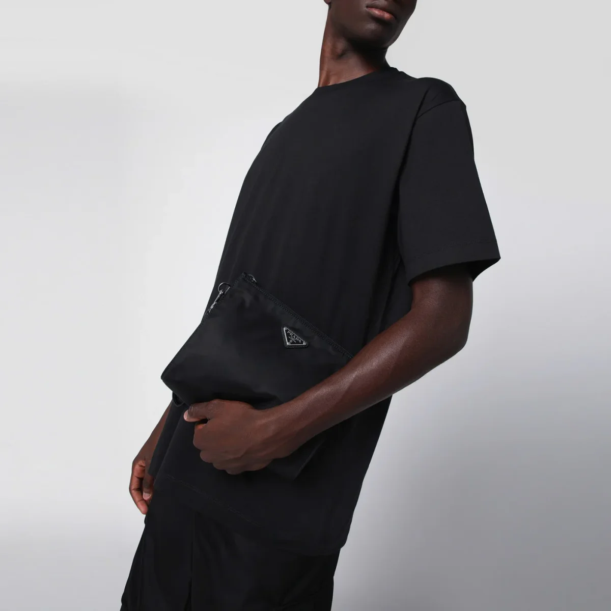 Pouch di Prada in Re-Nylon nera, caratterizzata da chiusura con zip, cinturino da polso rimovibile, una tasca interna con zip, dettagli in pelle Saffiano e triangolo logo in metallo smaltato sul davanti.