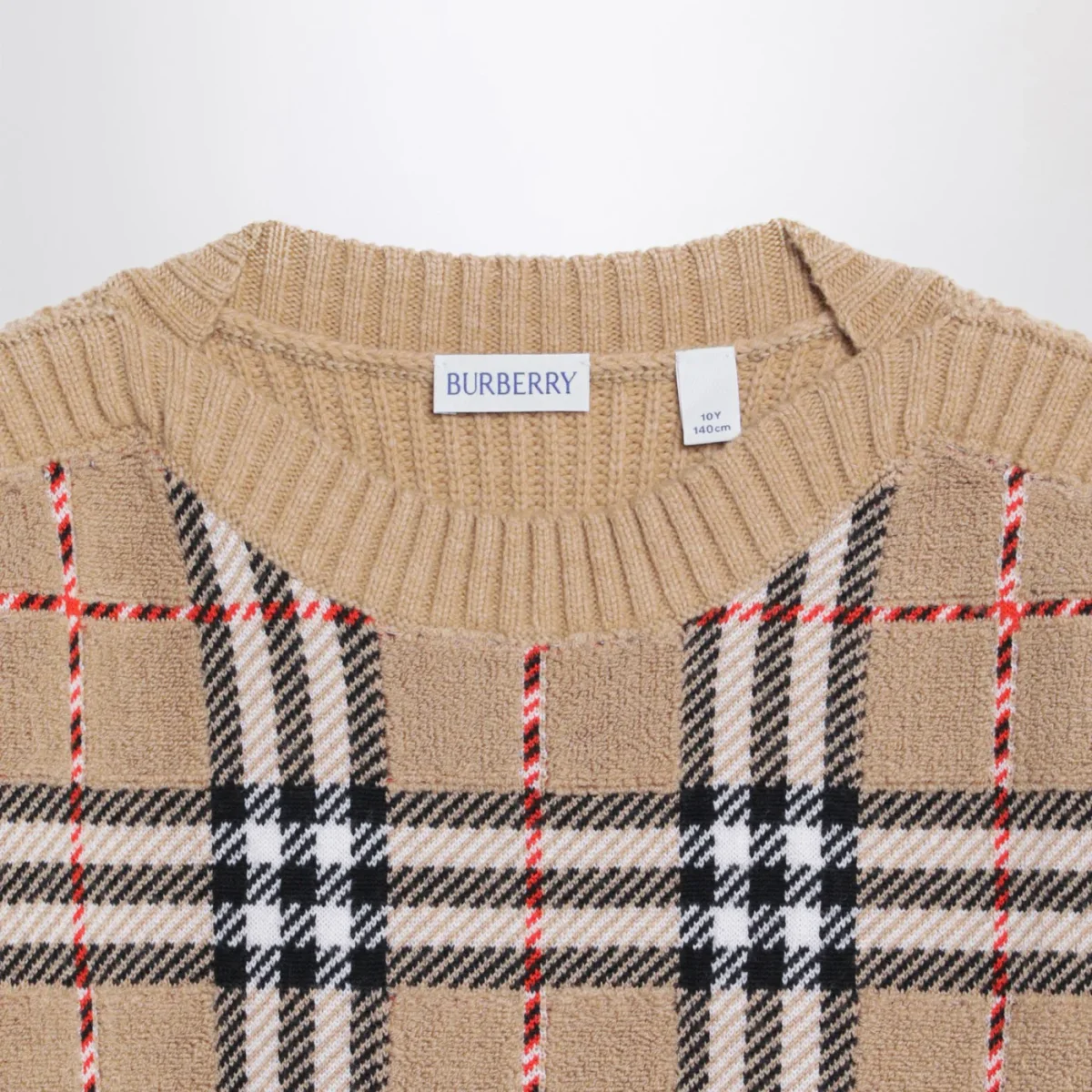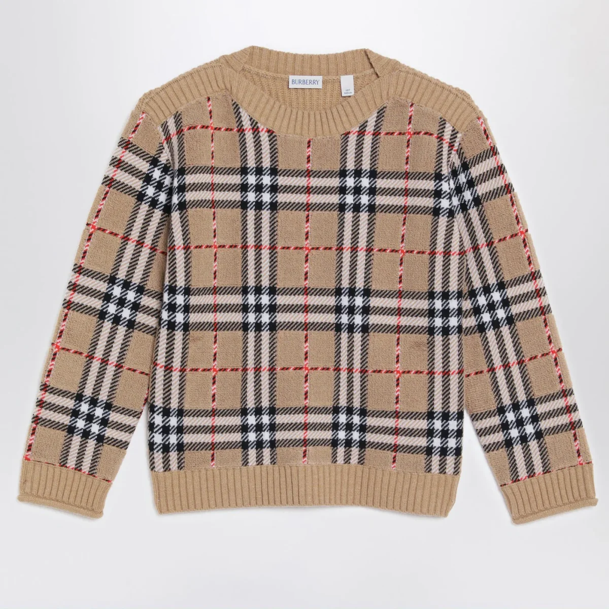 Pullover di Burberry in lana beige, caratterizzato da motivo Check, design girocollo, collo, polsini e orlo a costine.