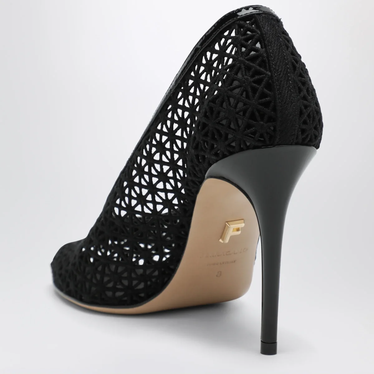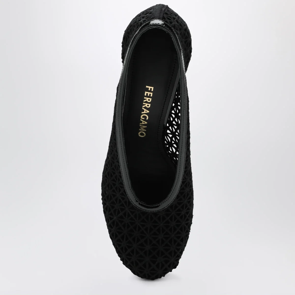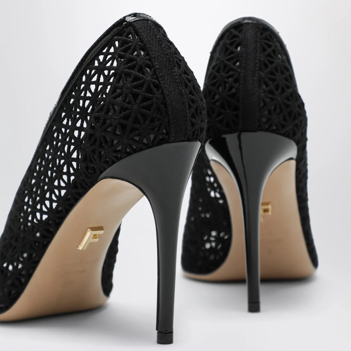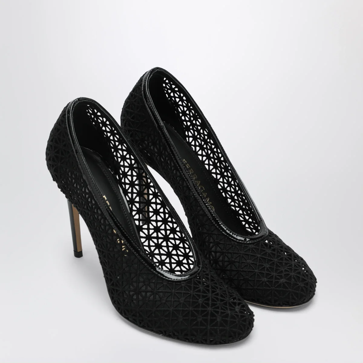 Pump di Ferragamo in macramè di cotone• Colore: Nero• Bordi in vernice tono su tono• Tacco a stiletto• Suola in cuoio