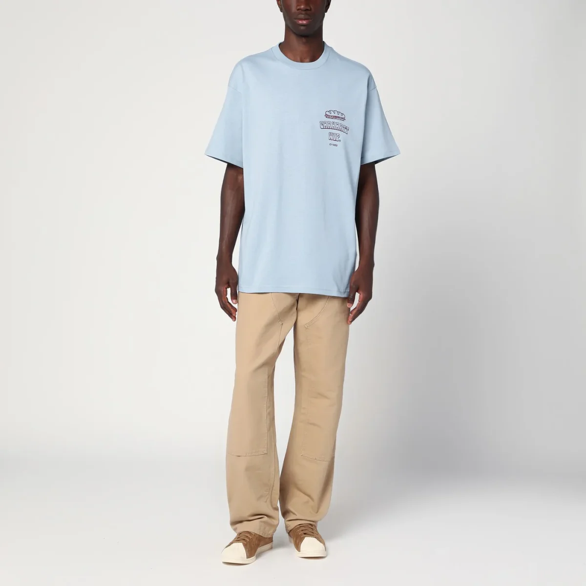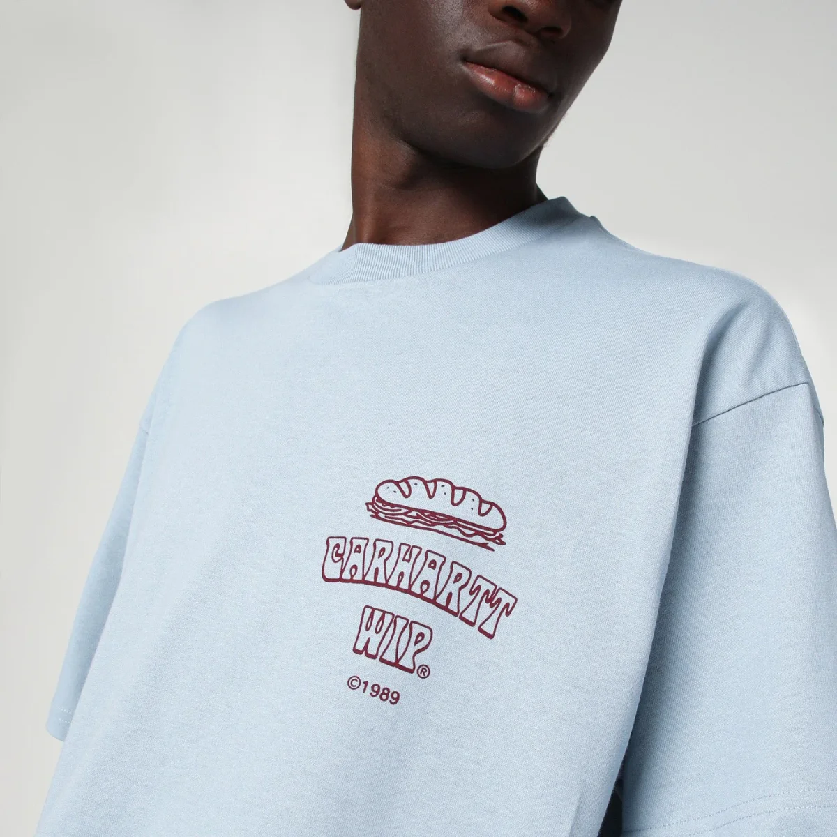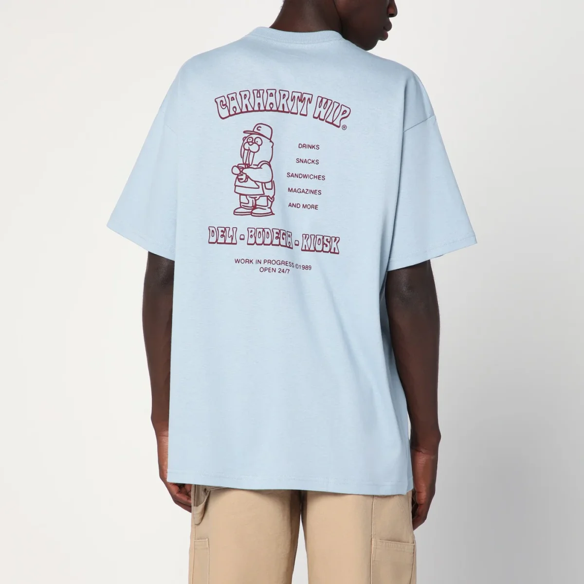 T-shirt di Carhartt WIP in jersey di cotone di medio peso color Blue Fog, caratterizzata da vestibilità ampia, stampe grafiche sul davanti e sul retro, manica corta e girocollo a costine.