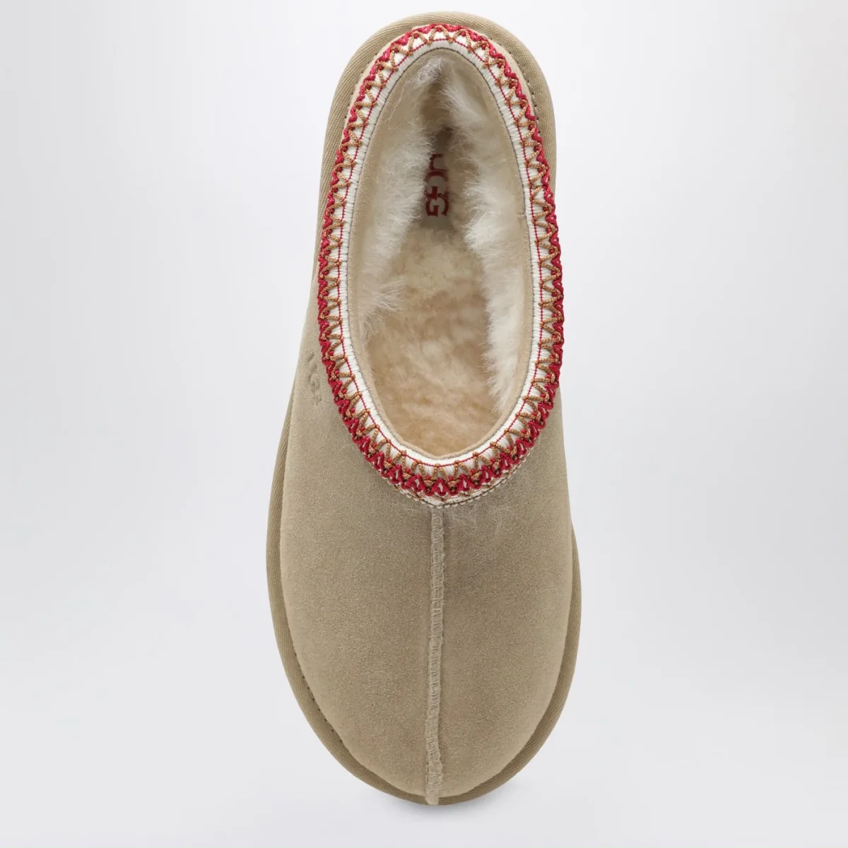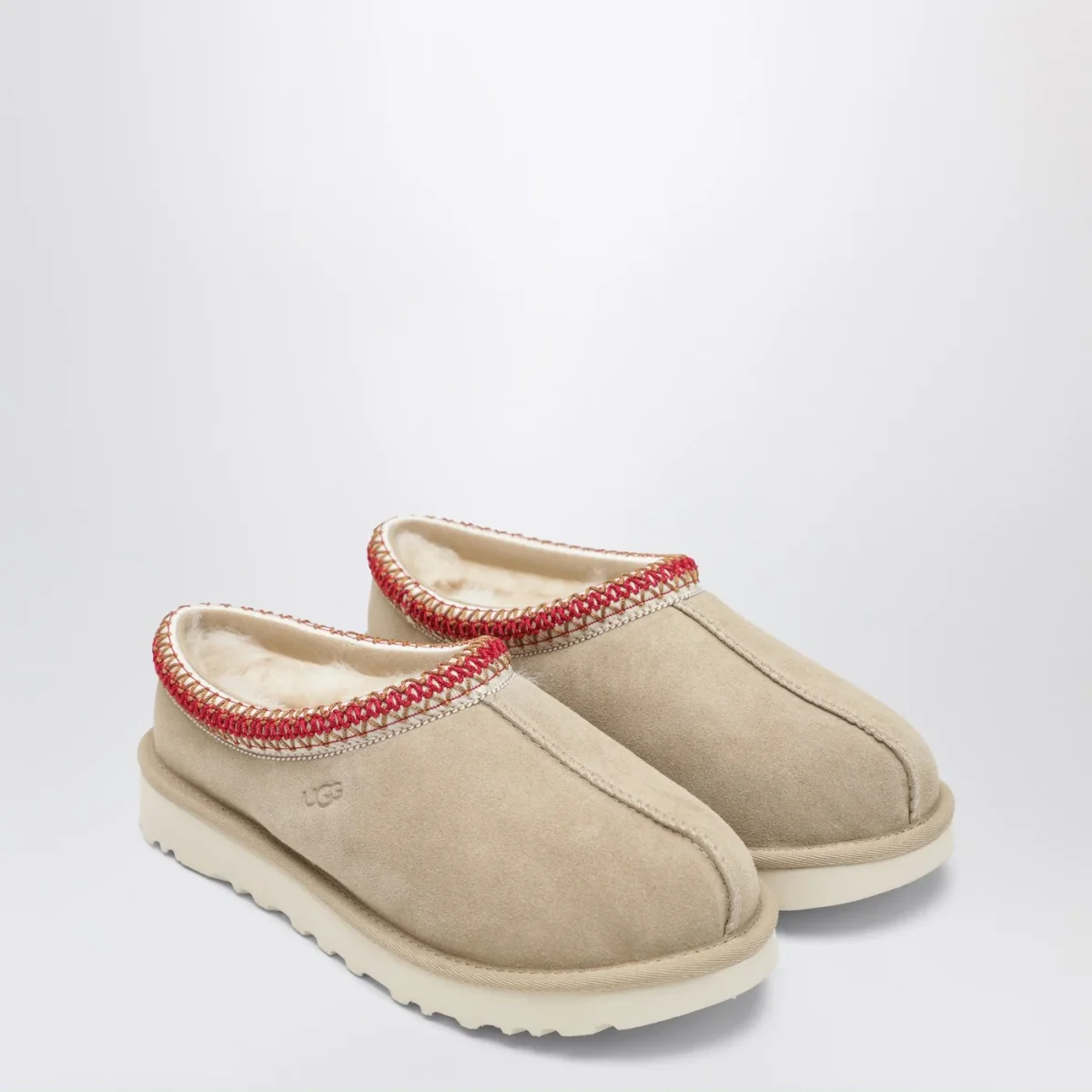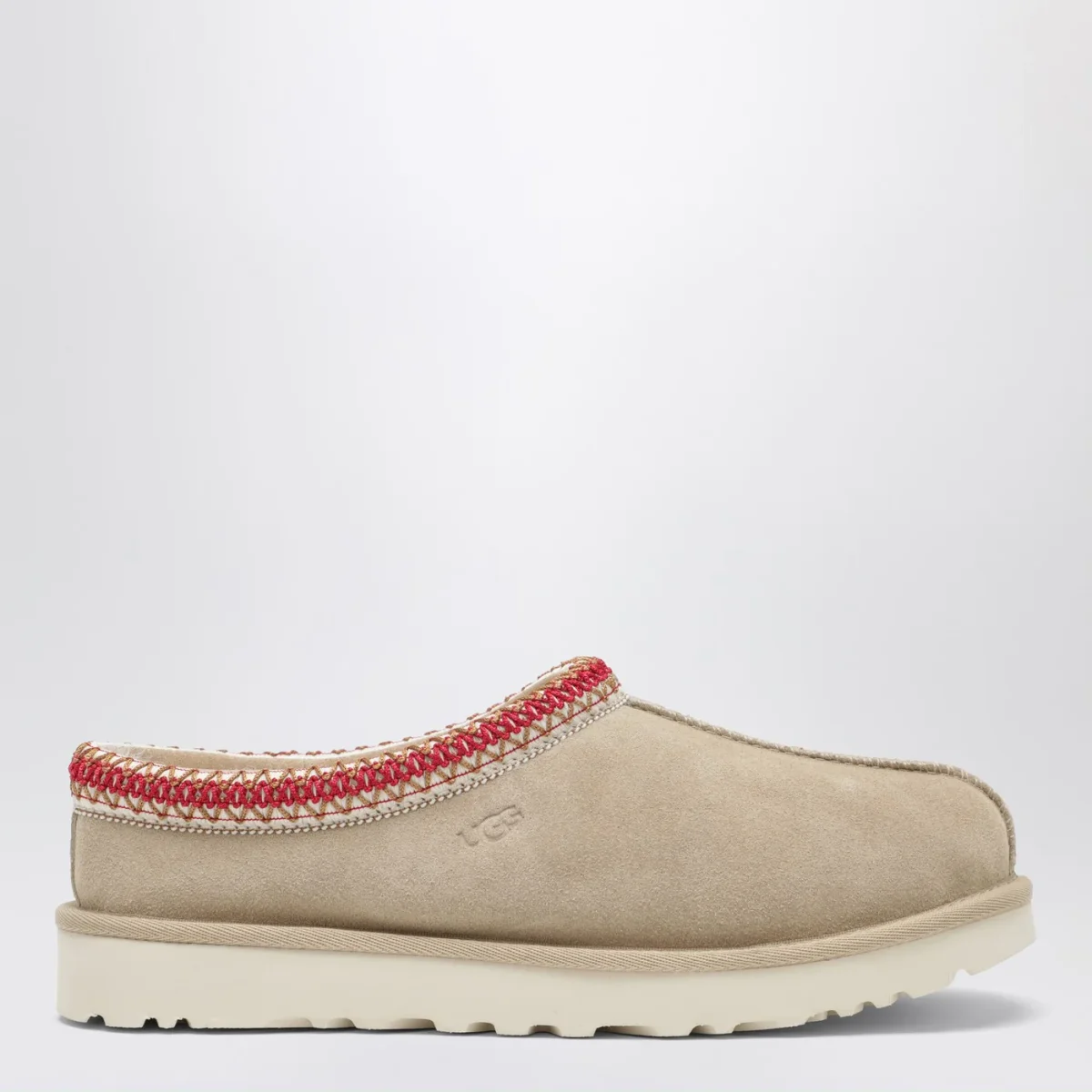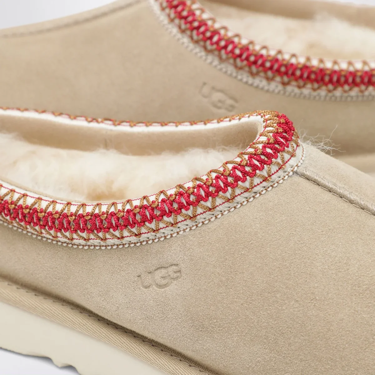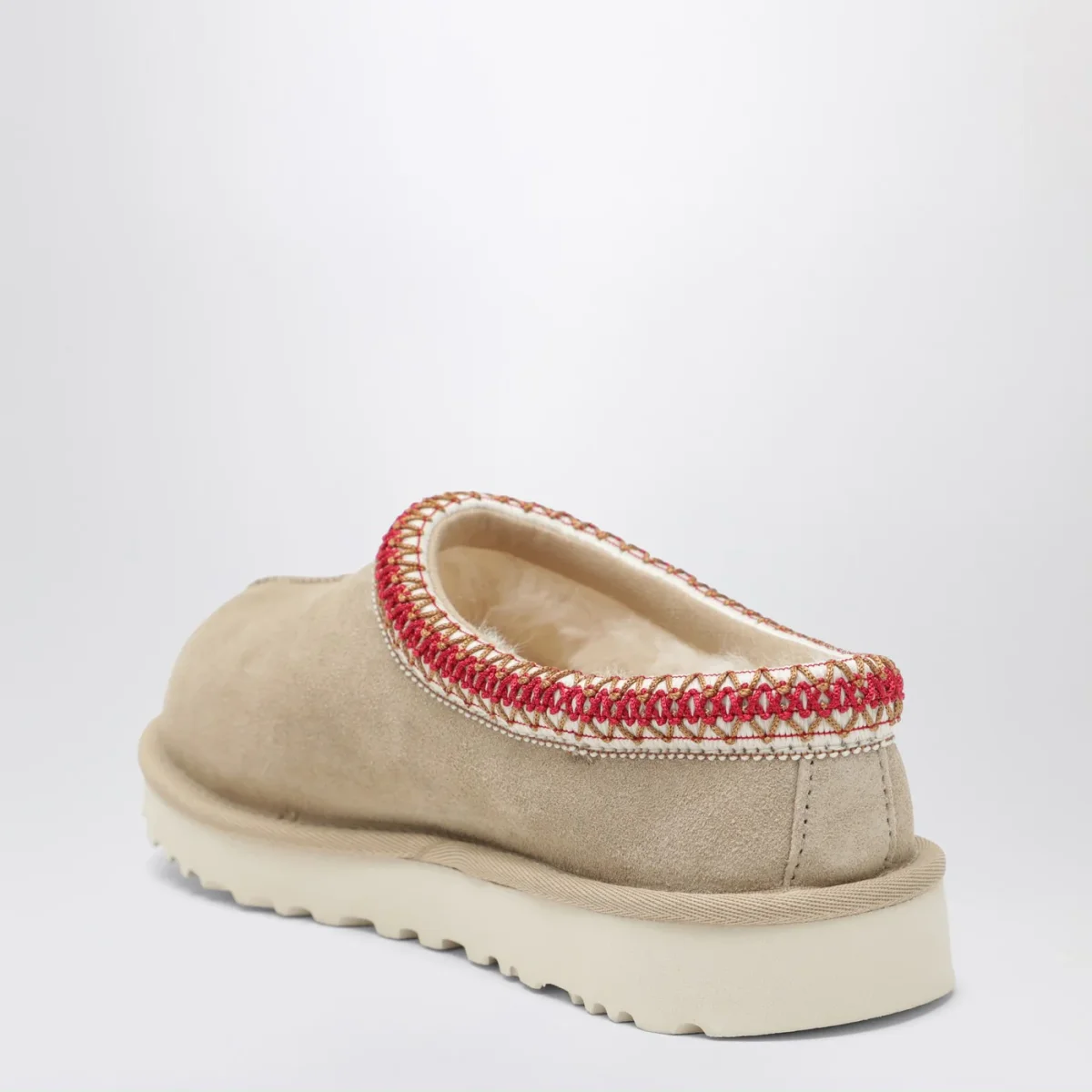 Sabot di UGG in camoscio color sabbia• bordo con ricamo in tessuto sui toni del rosso ciliegia• suola in EVA• logo lettering stampato a caldo in rilievo• etichetta in tessuto con logo lettering sulla soletta• fodera in montone• soletta in montone