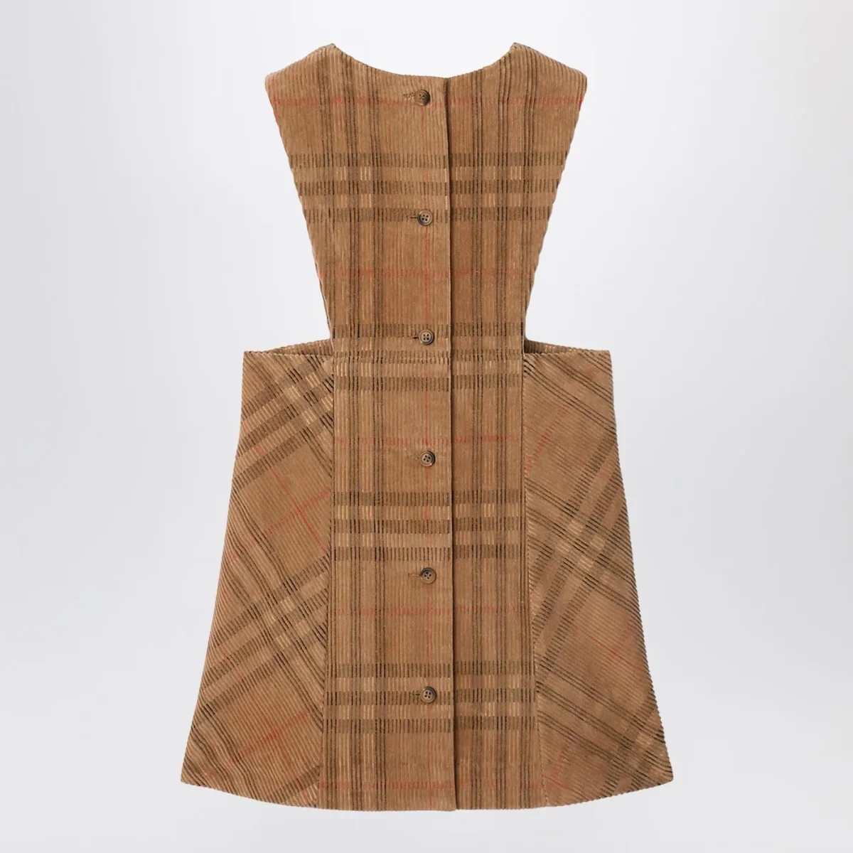 Salopette girocollo di Burberry in velluto di cotone a costine beige con motivo Check all over, caratterizzata da gonna svasata e chiusura con bottoni sul retro.