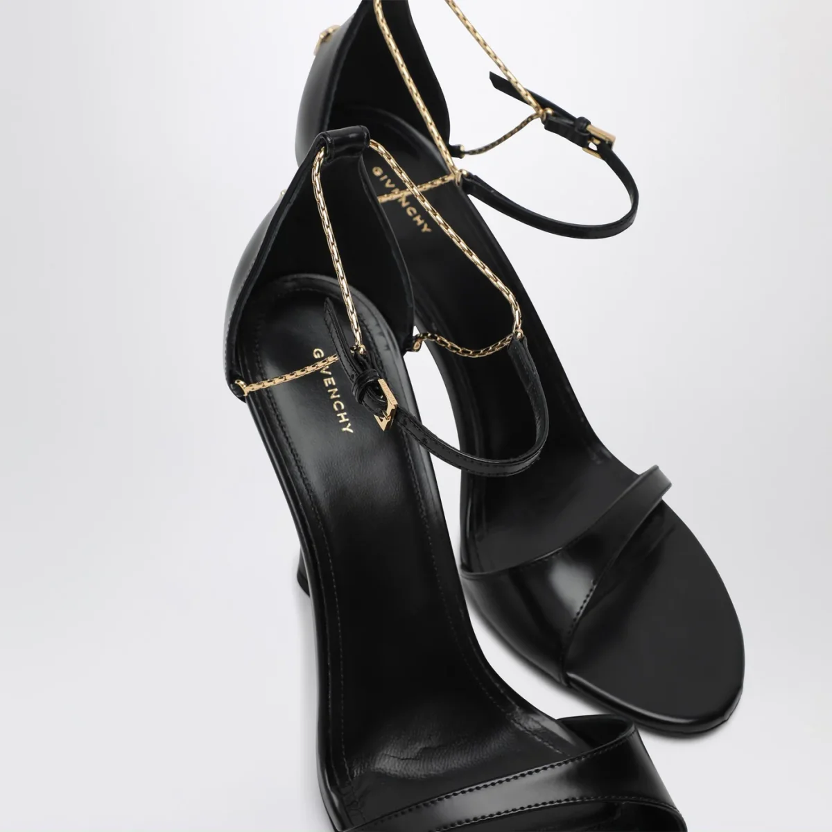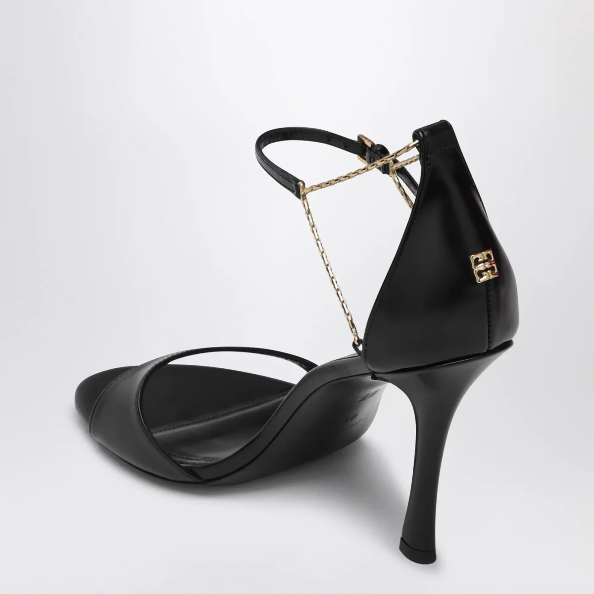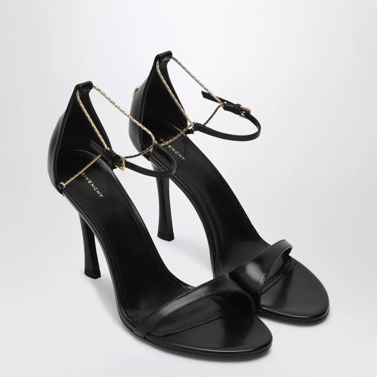 Sandali di Givenchy in pelle di vitello spazzolata nera, caratterizzati da cinturino sottile con catena in metallo, chiusura regolabile con fibbia laterale, logo in metallo 4G Liquid sul retro, sottopiede con logo, tacco alto a stiletto e suola in cuoio.
