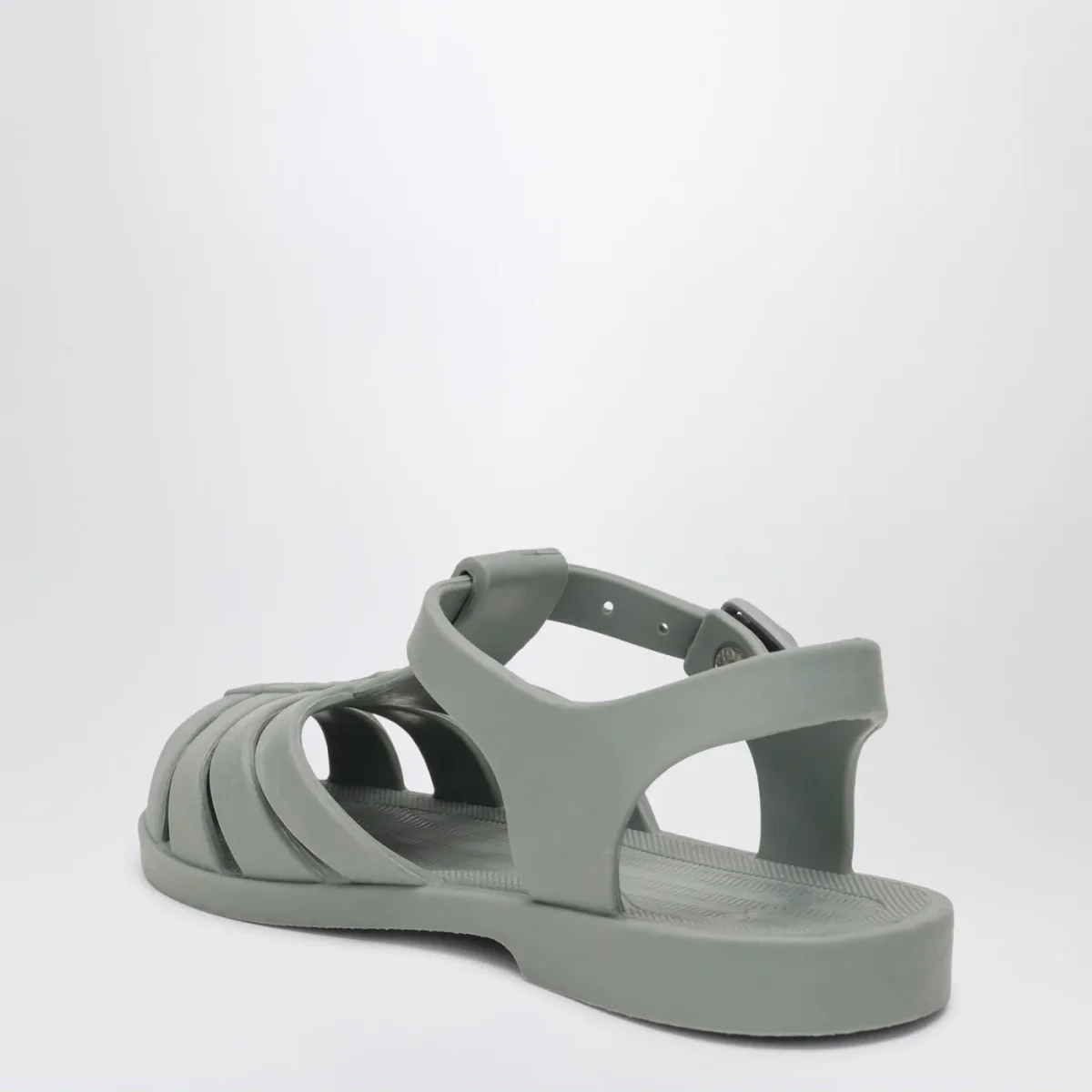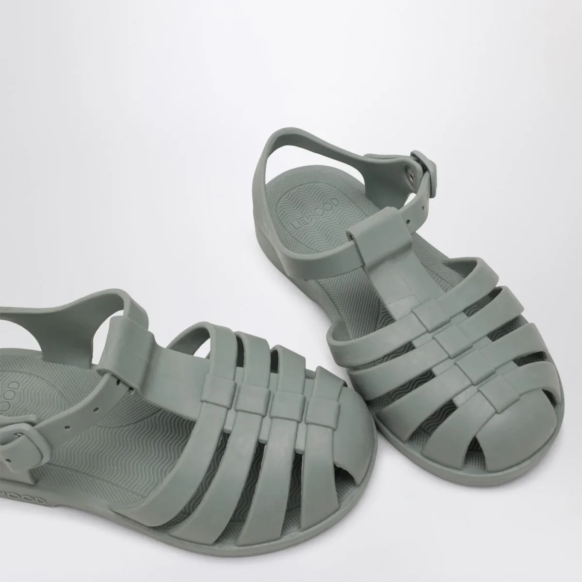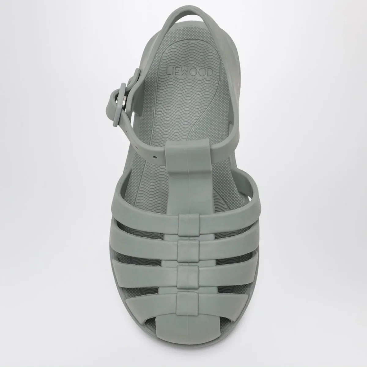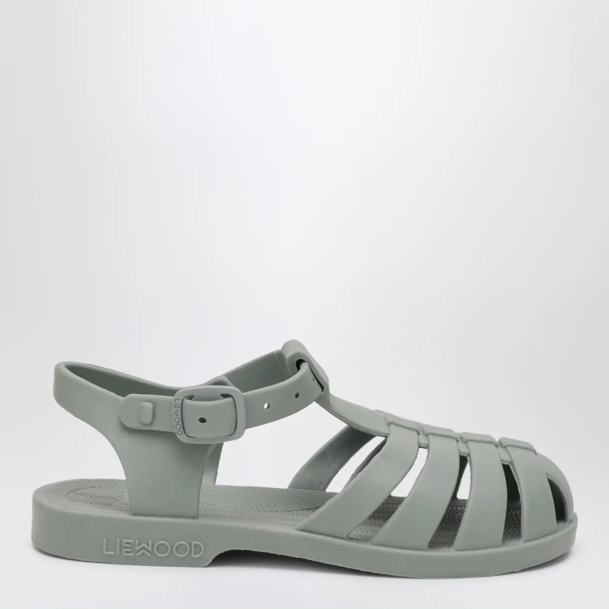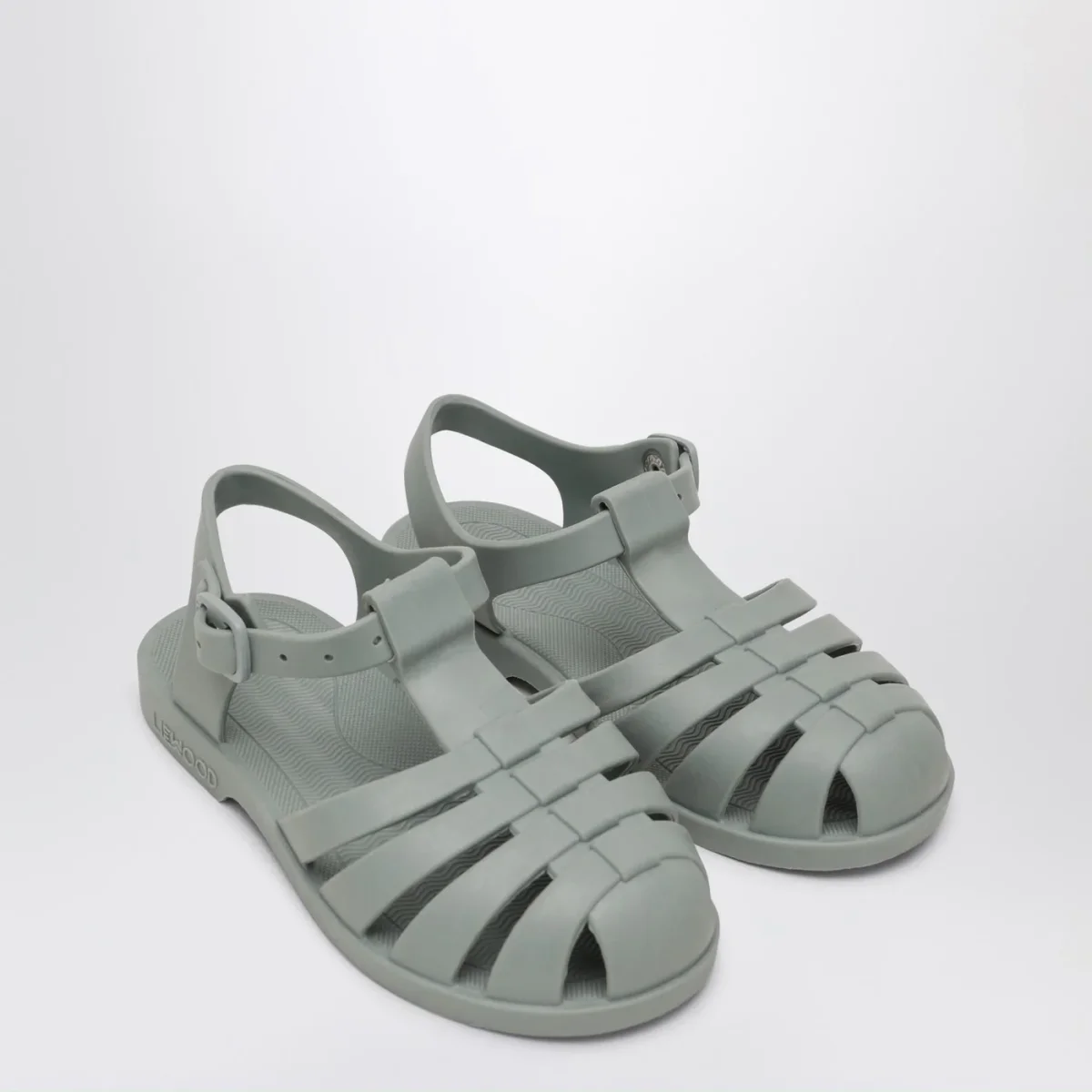 Sandali di Liewood in pvc verde menta, caratterizzati da tomaia a gabbia, design flessibile e impermeabile, chiusura regolabile con fibbia e pulsante a pressione e logo lettering in rilievo tono su tono sul lato.