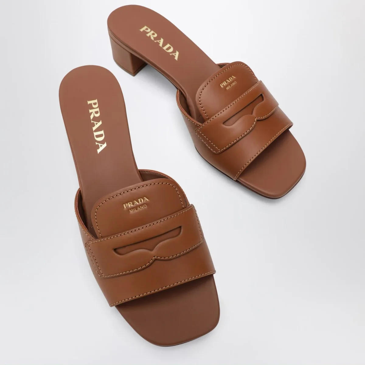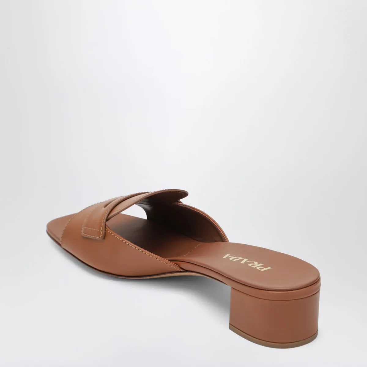 Sandali di Prada in pelle color cuoio• logo lettering serigrafato sul davanti• punta aperta• suola in cuoio con logo lettering in metallo• tacco fasciato in pelle