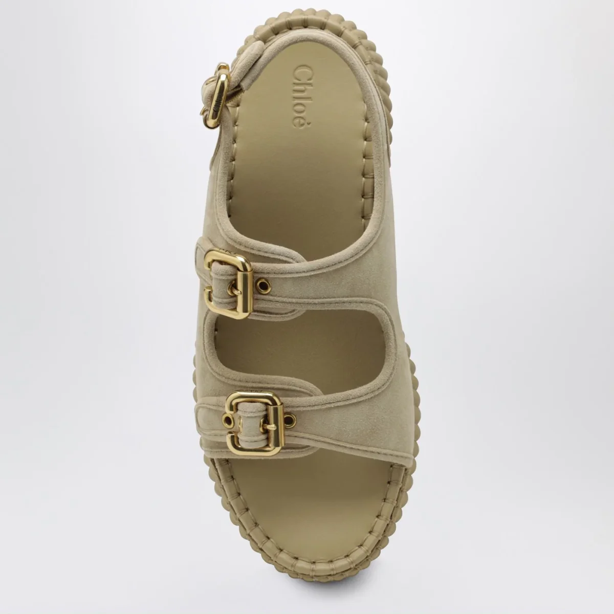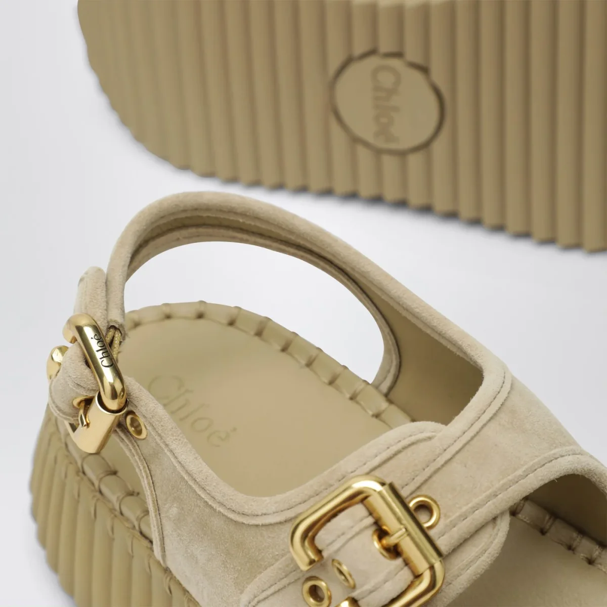 Sandali con zeppa di Chloé in pelle beige sabbia• doppi cinturini anteriori• un cinturino regolabile alla caviglia rifinito con fibbie Paddington nella tonalità Gold• plateau leggero in materiali riciclati• finiture con impunture a punto cavallo tono su tono