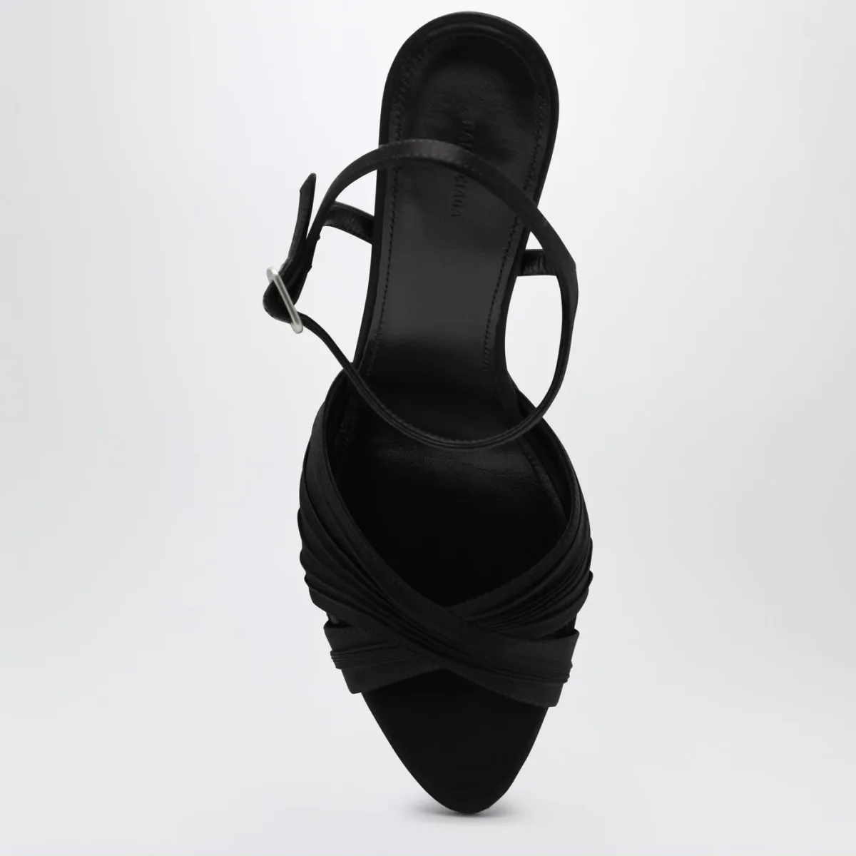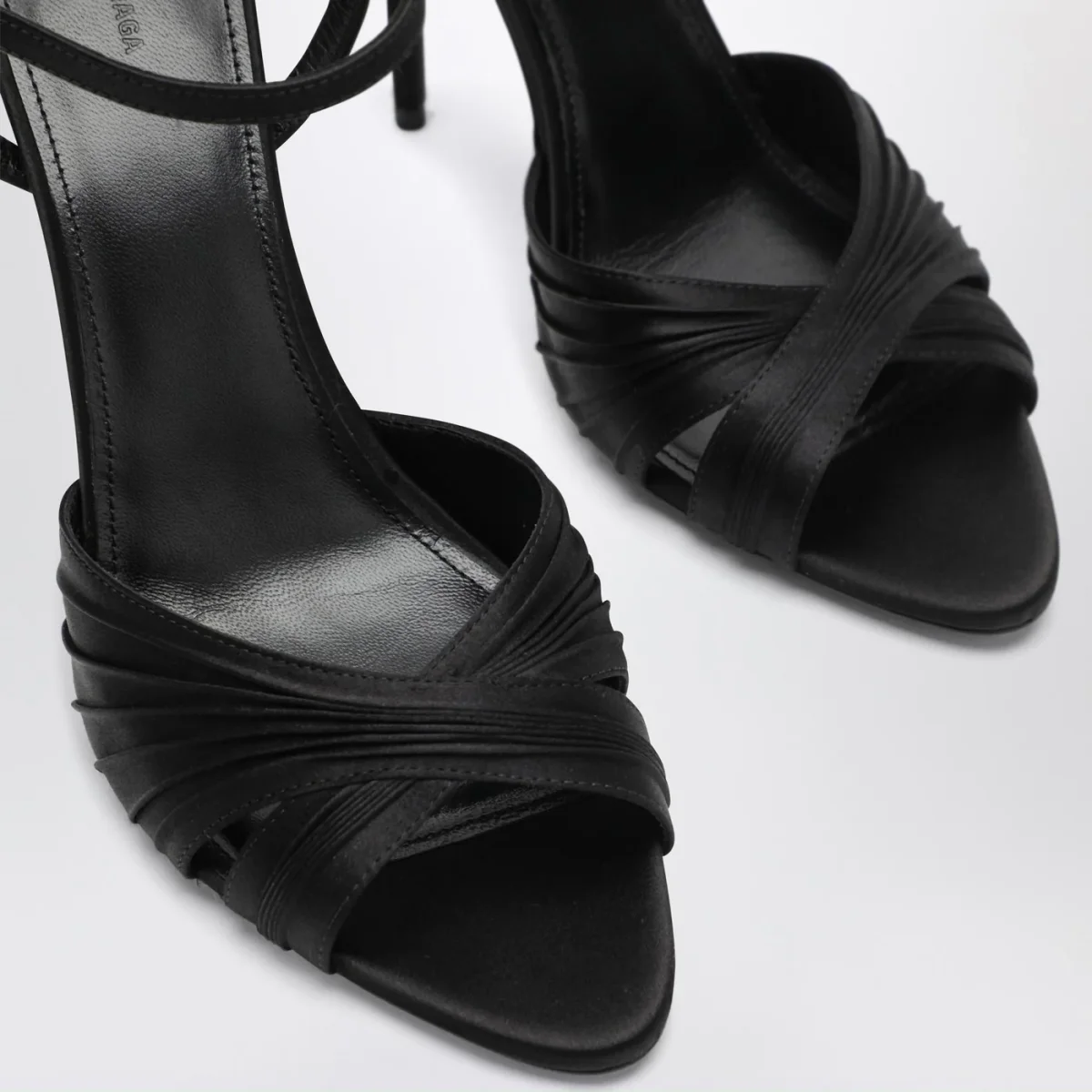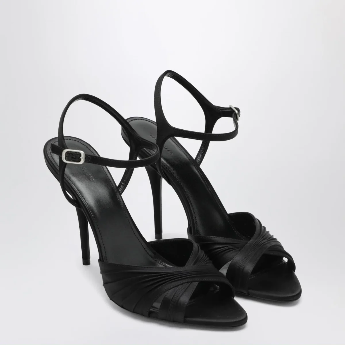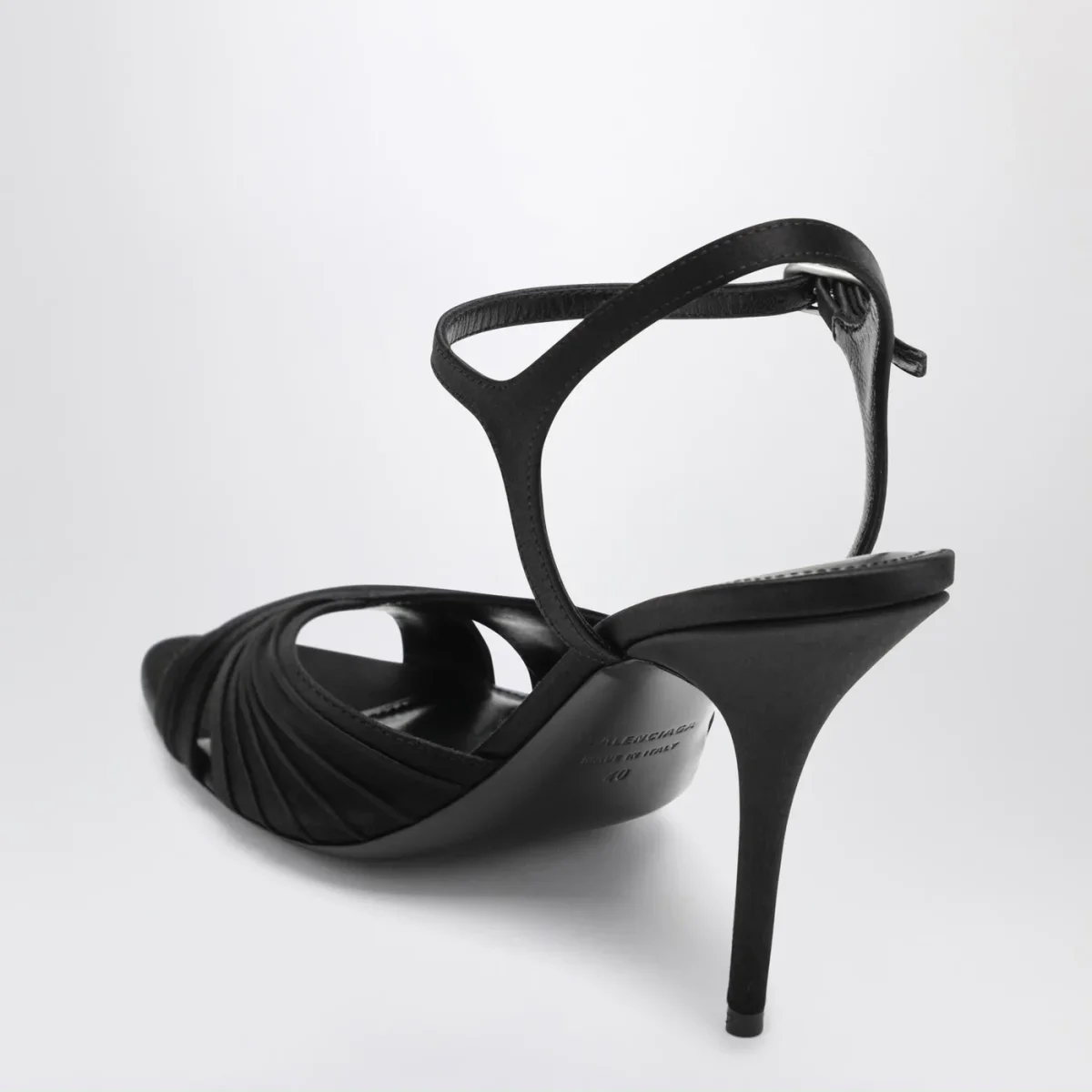 Sandali di Balenciaga in satin di viscosa e seta neri, caratterizzati da design con punta aperta, cinturino regolabile alla caviglia, tacco alto rivestito tono su tono e suola in cuoio.