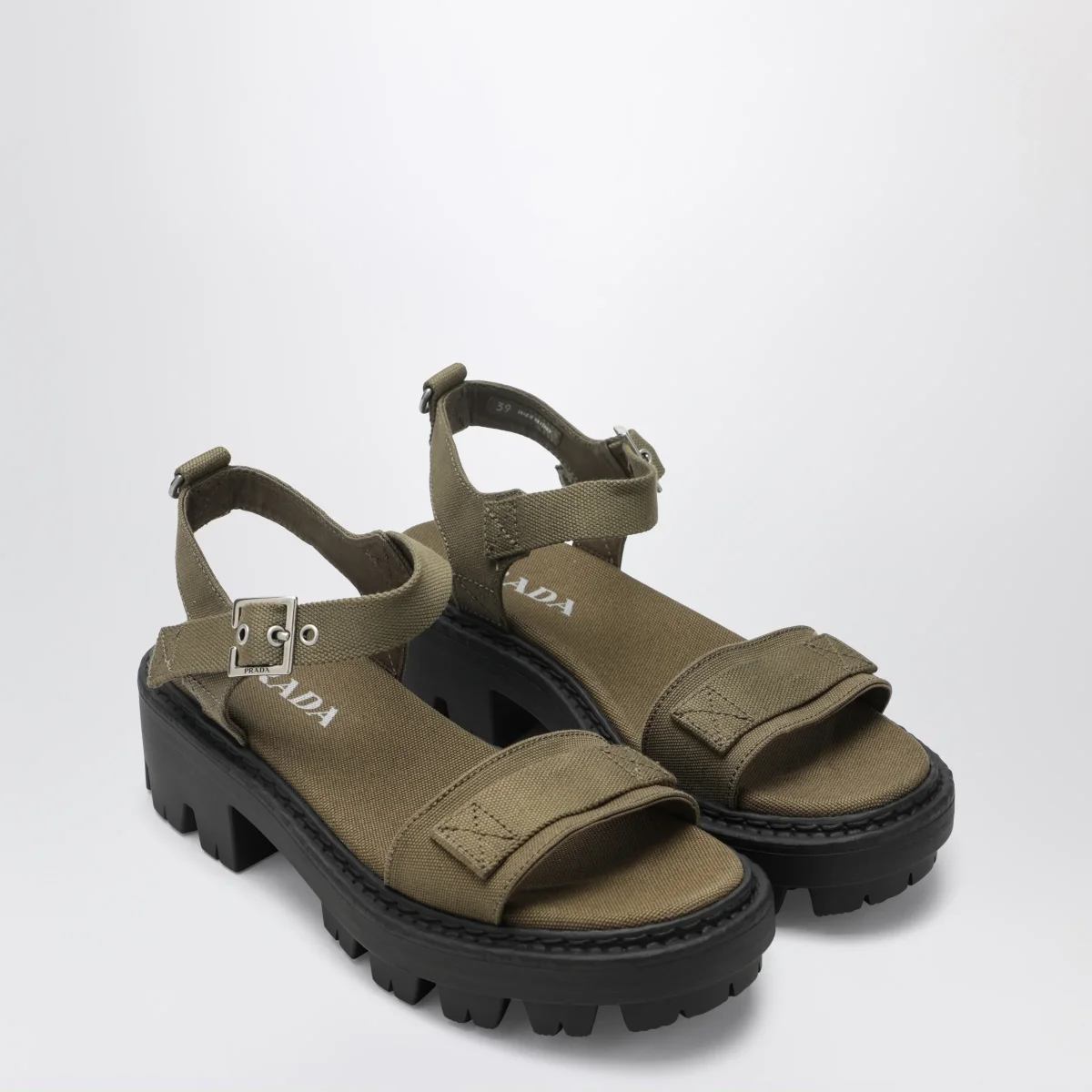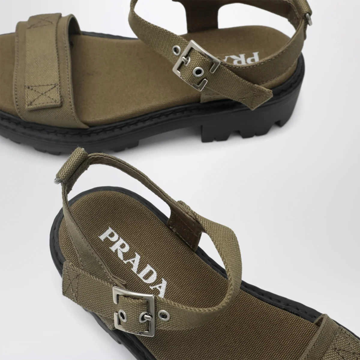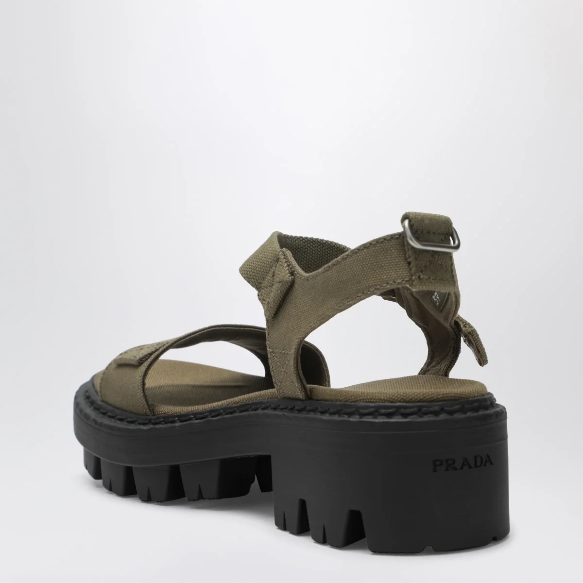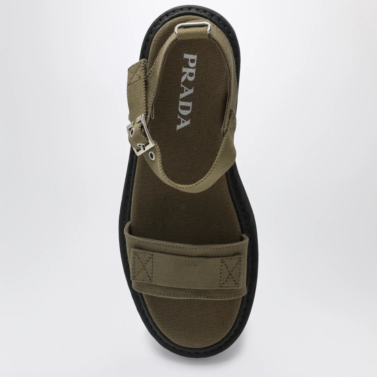 Sandali di Prada in canvas• Colore: Verde militare• Tomaia con fibbia in metallo logata• Suola in gomma monoblocco con logo a fuoco• Battistrada con disegno a tasselli