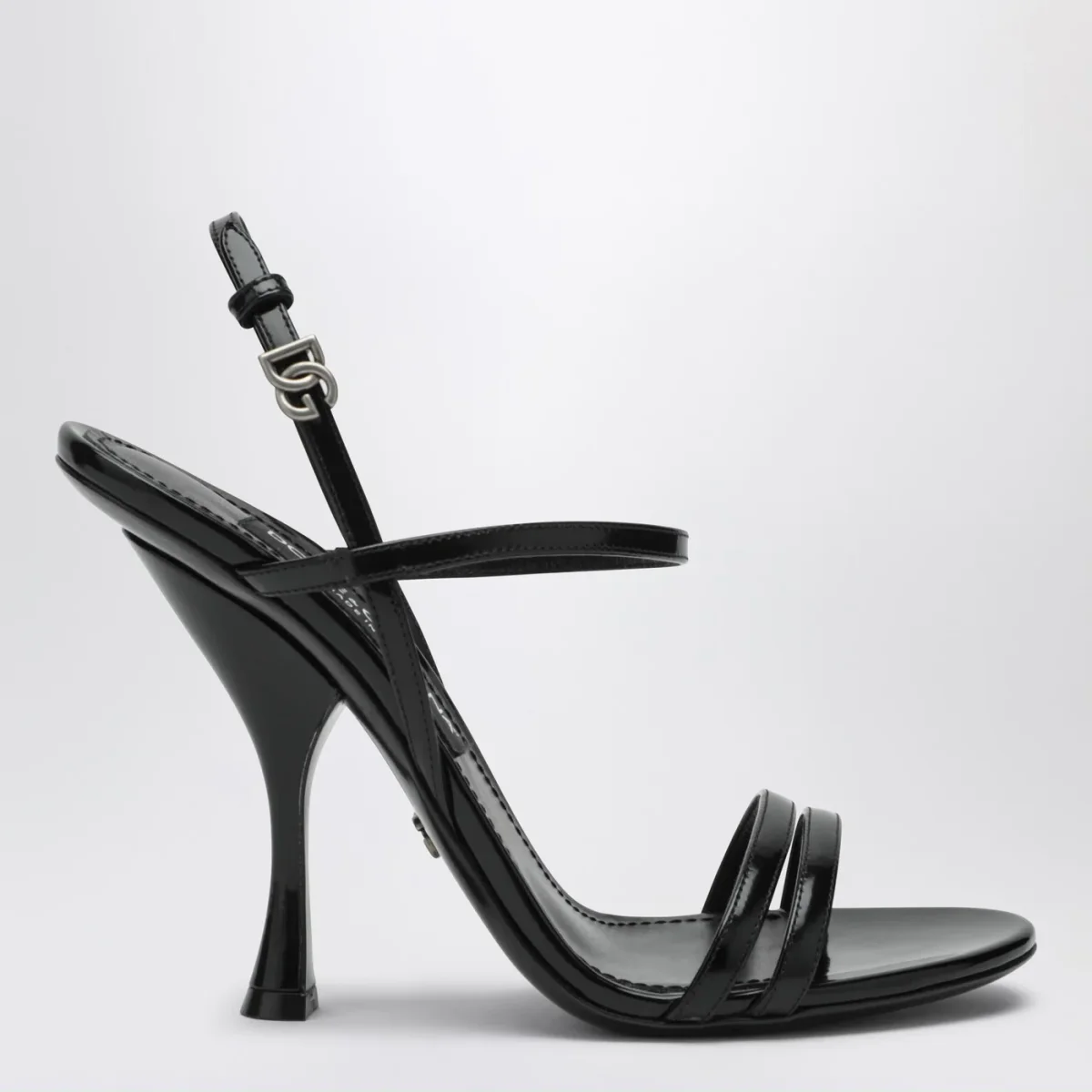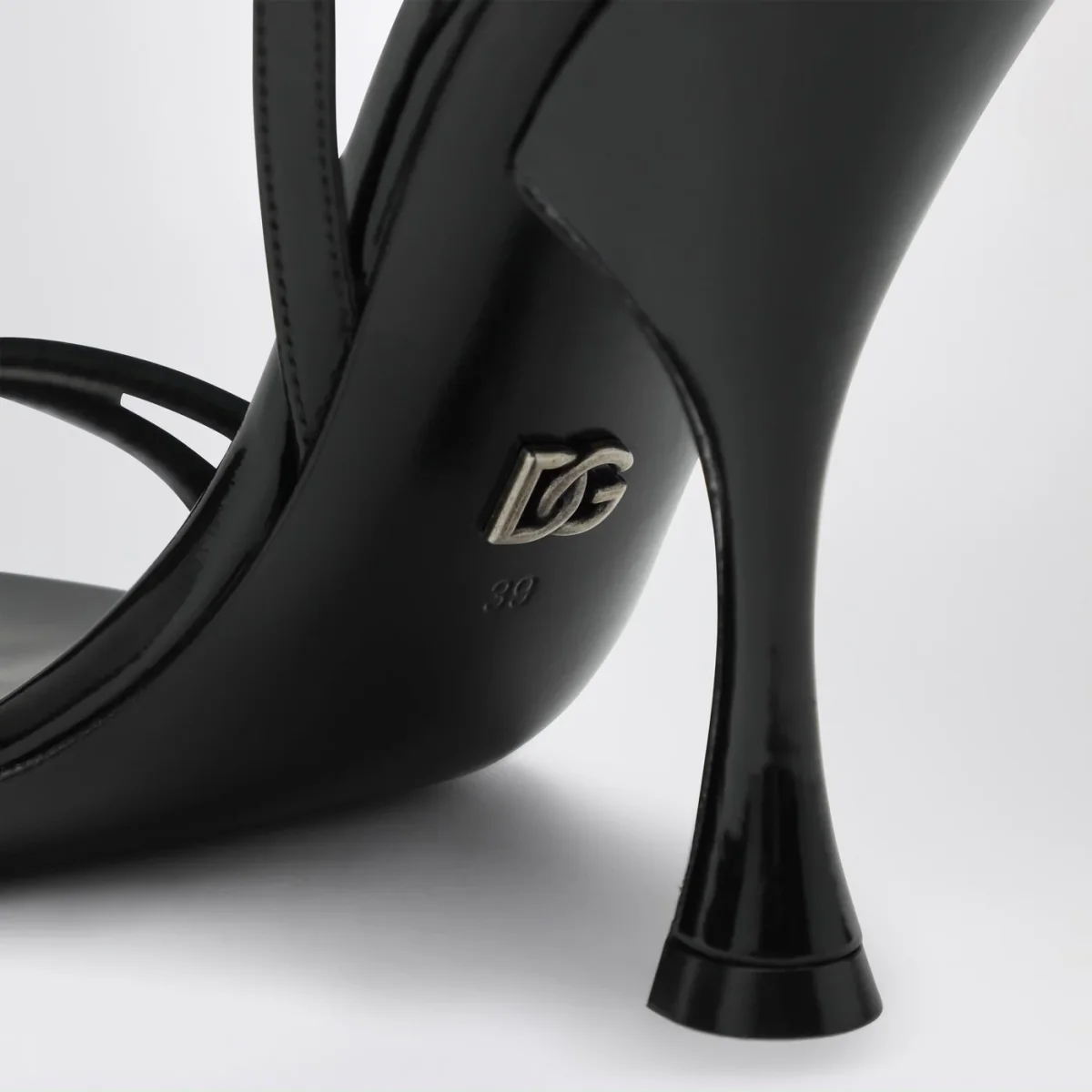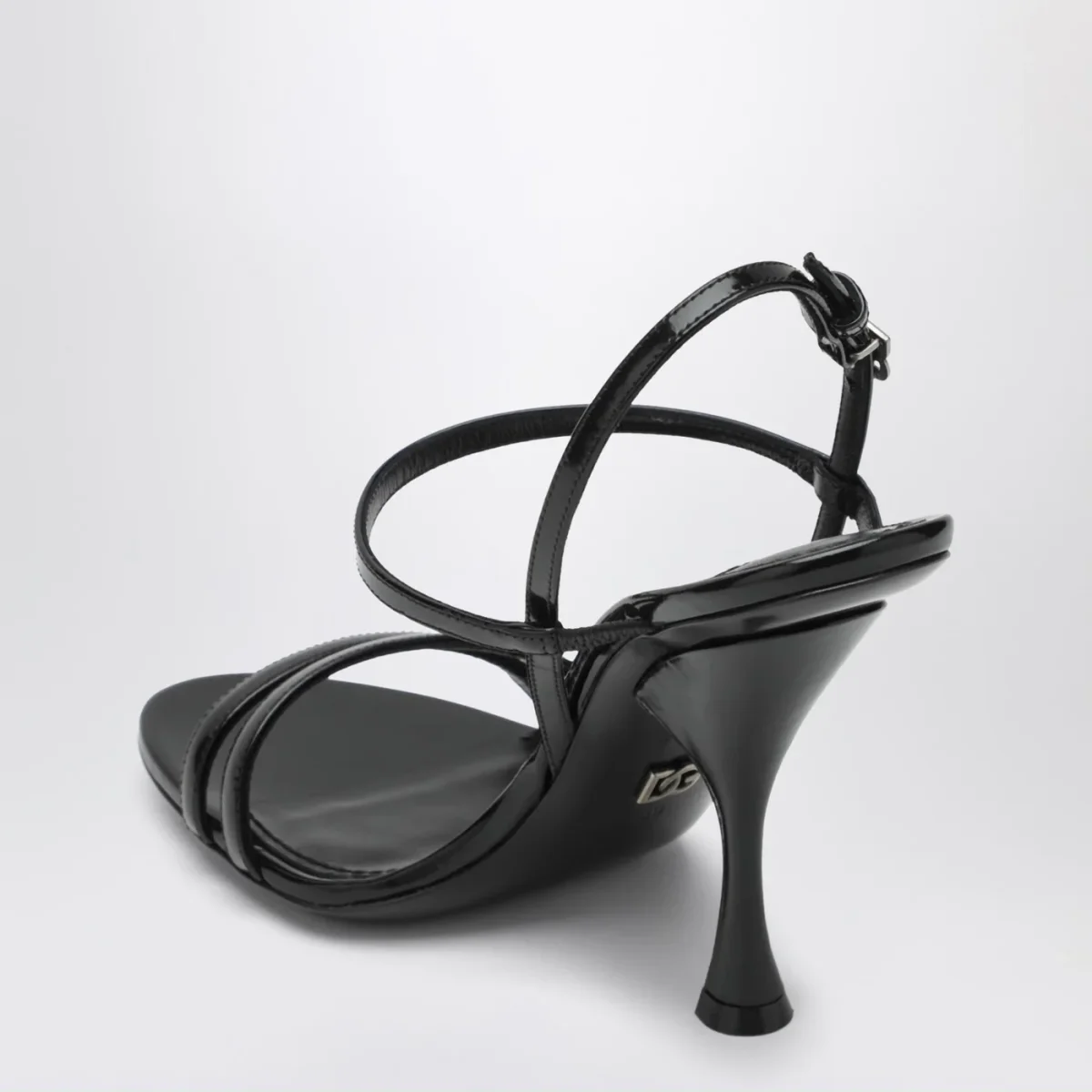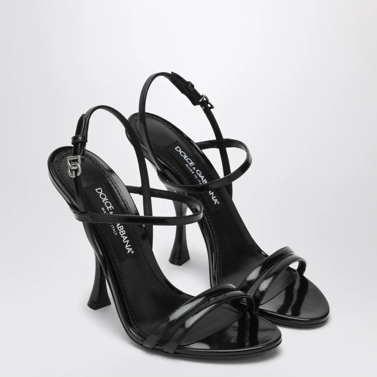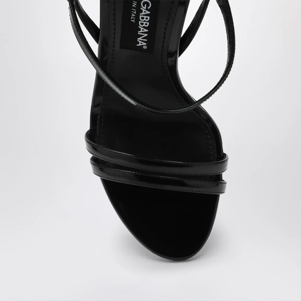 Sandali di Dolce & Gabbana in pelle di vitello lucida nera, caratterizzati da cinturini sottili, cinturino alla caviglia con fibbia DB regolabile, tacco alto a stiletto e suola in cuoio.