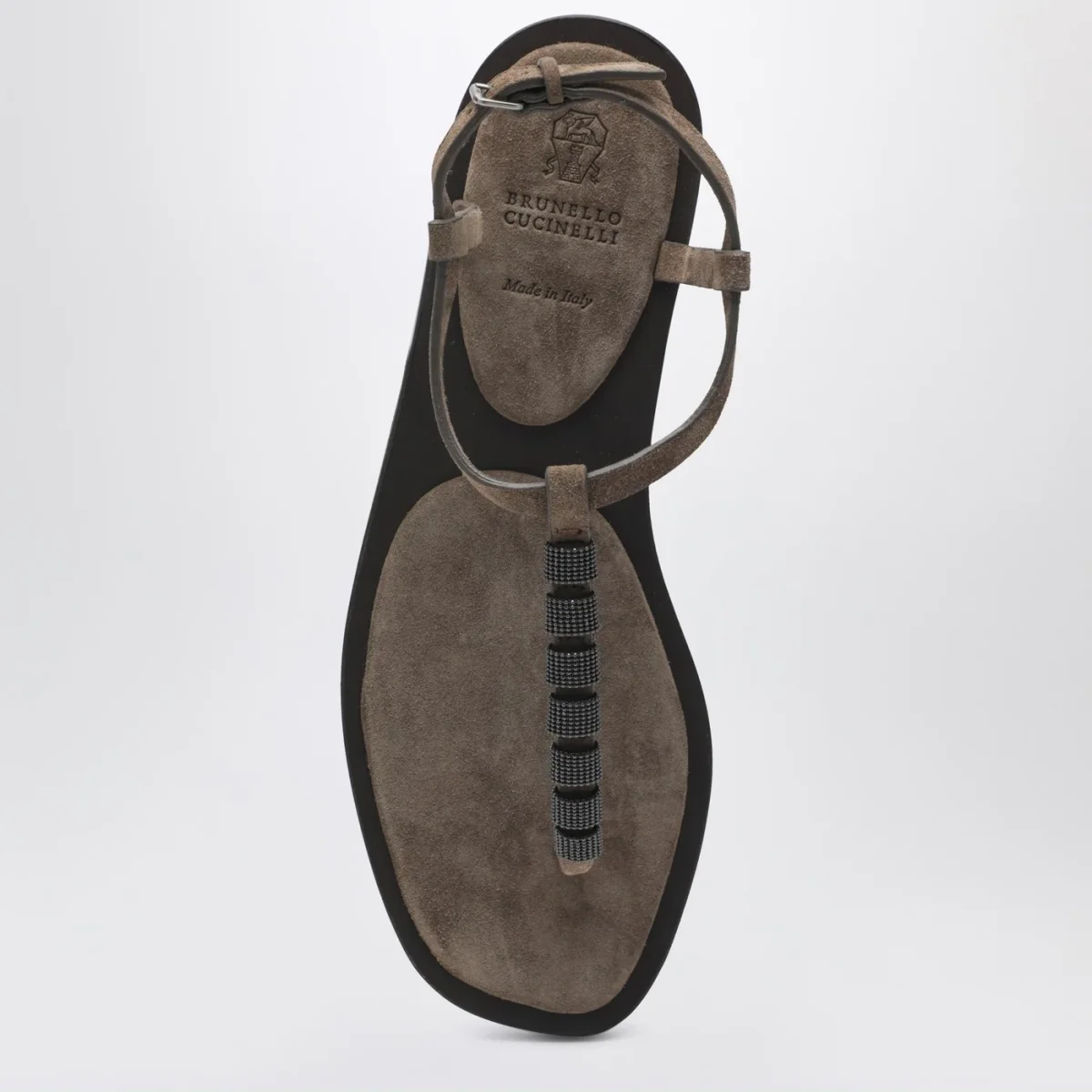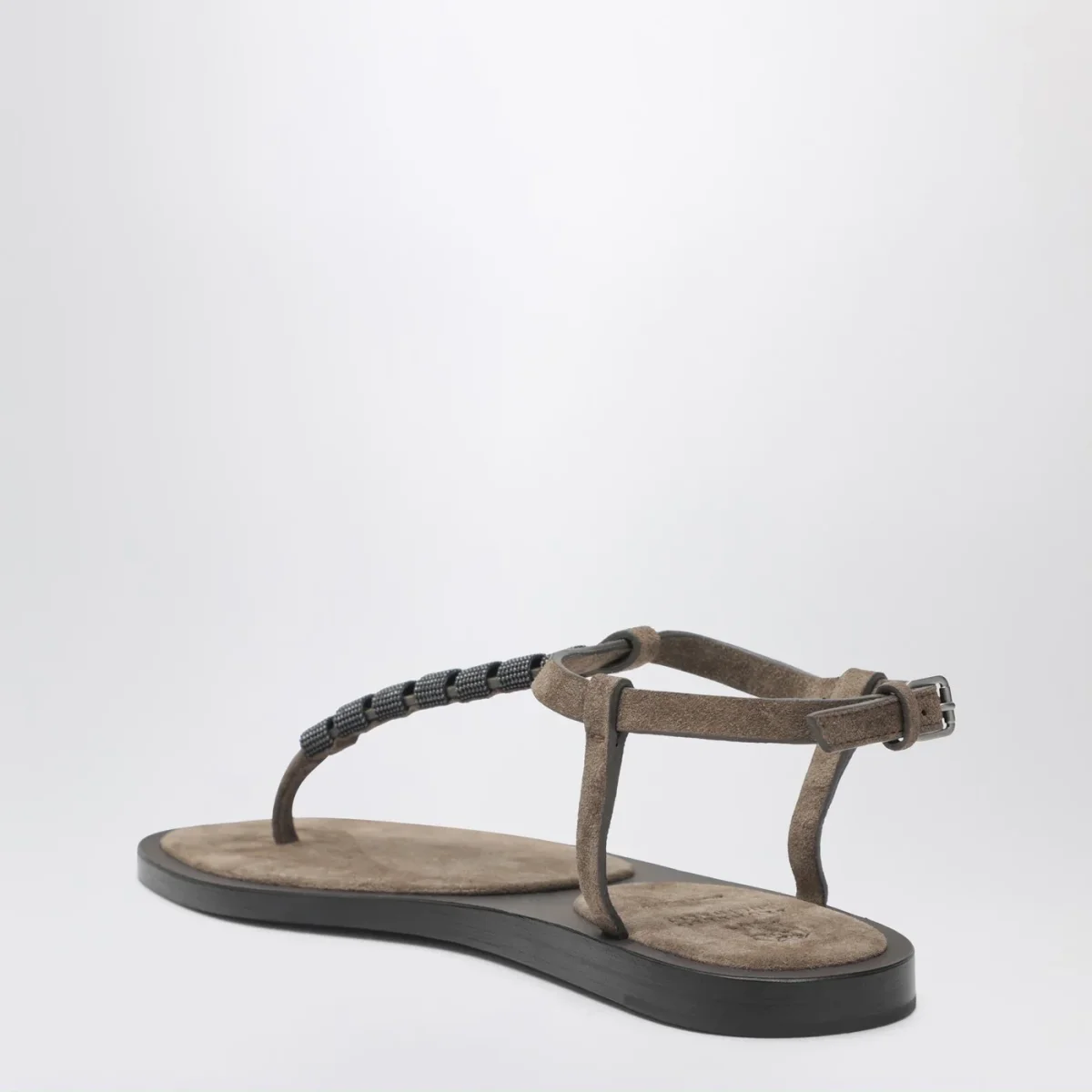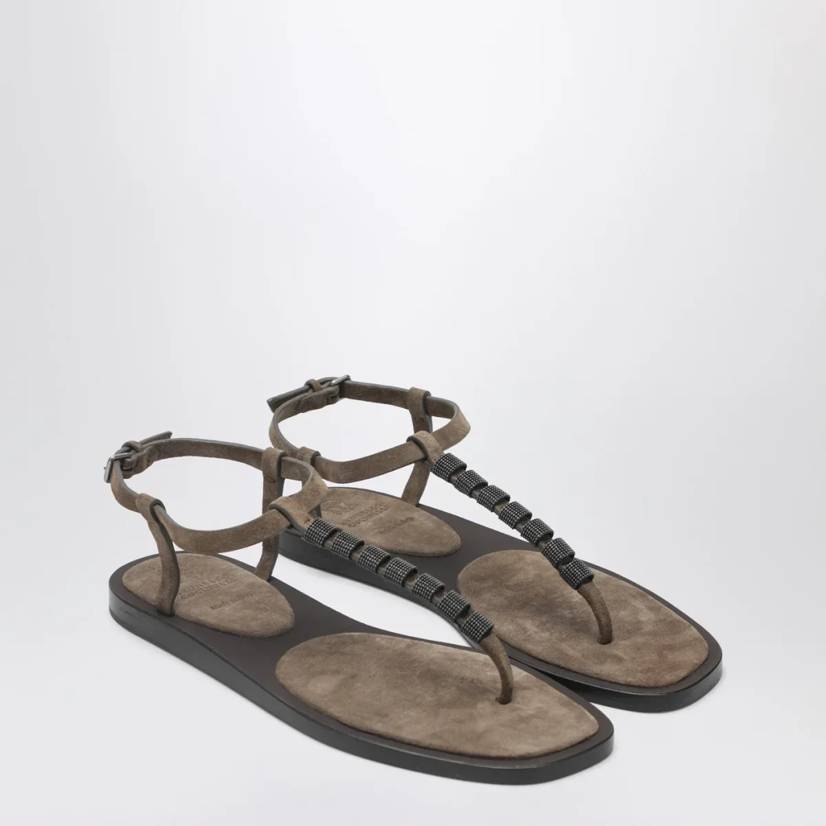 Sandali infradito di Brunello Cucinelli in pelle scamosciata marroni• chiusura posteriore con cinturino regolabile• fascia frontale con cilindri in monile• suola in cuoio con tacco in gomma• isola antiscivolo sotto alla punta