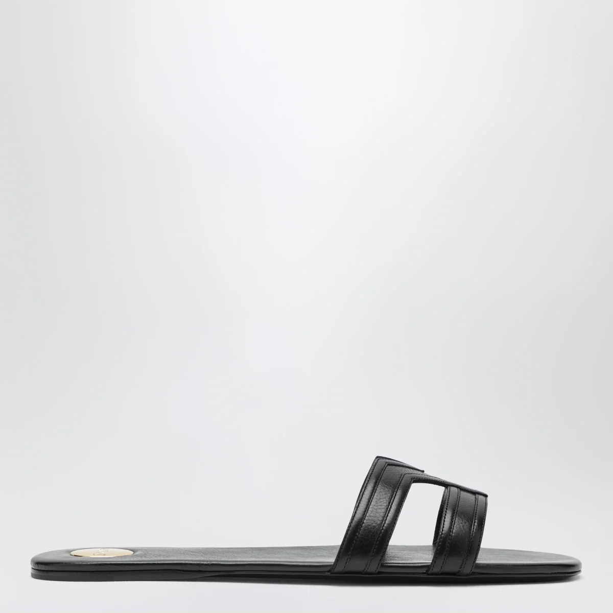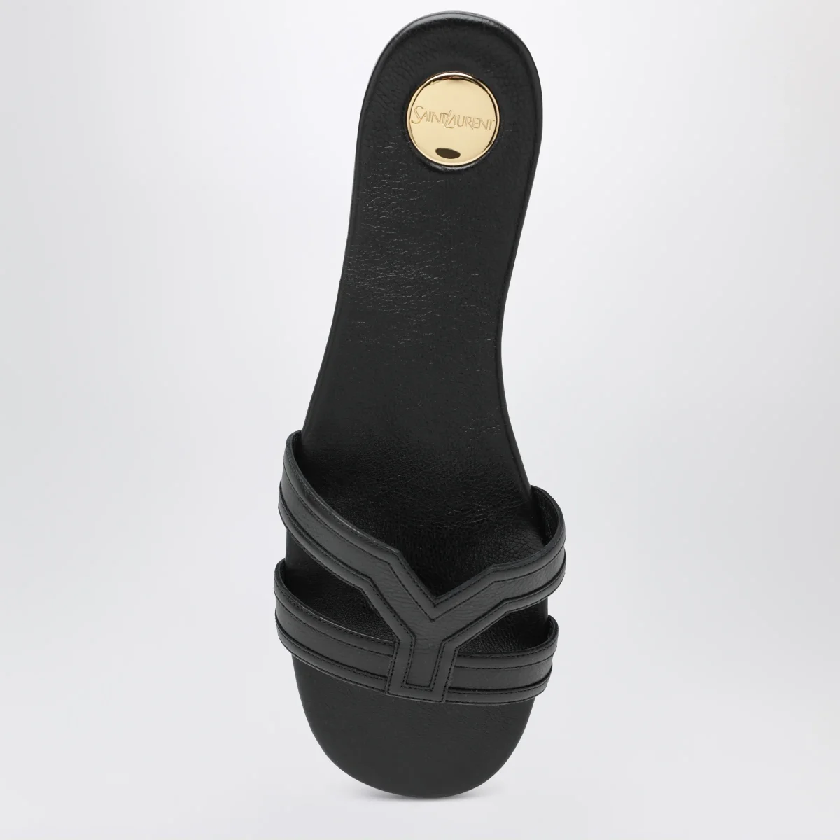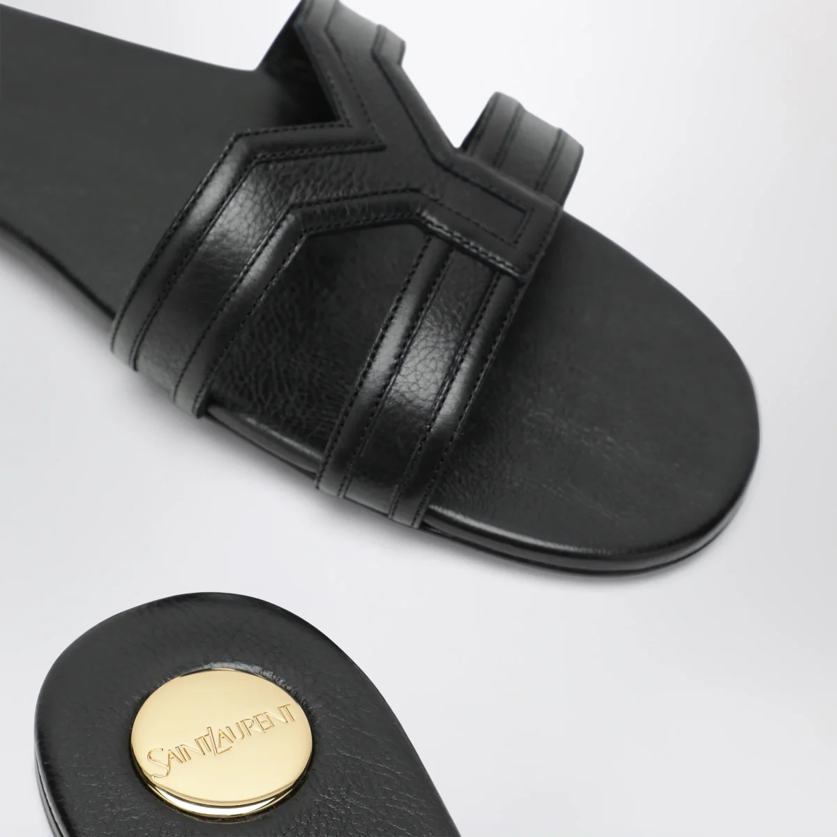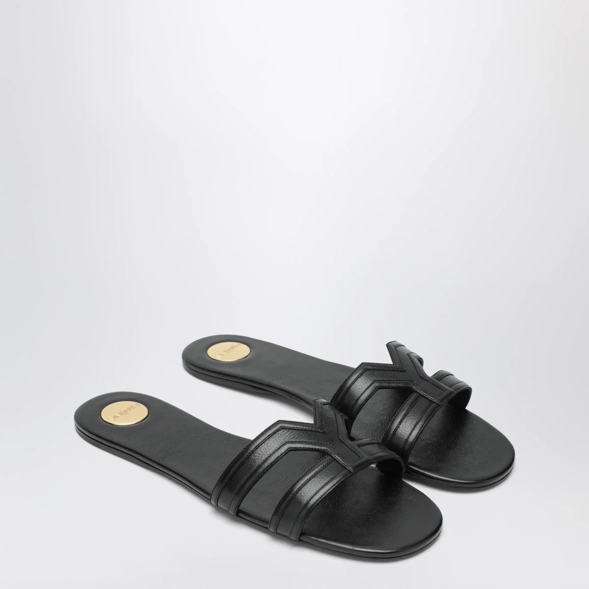Sandali in pelle liscia di Saint Laurent• Colore: Nero• Punta arrotondata• Doppia fascia spessa• Suola in cuoio• Targhetta rotonda in metallo con logo Saint Laurent inciso sulla soletta