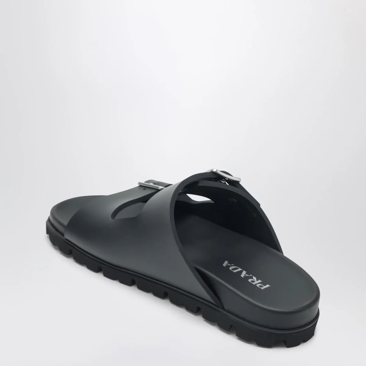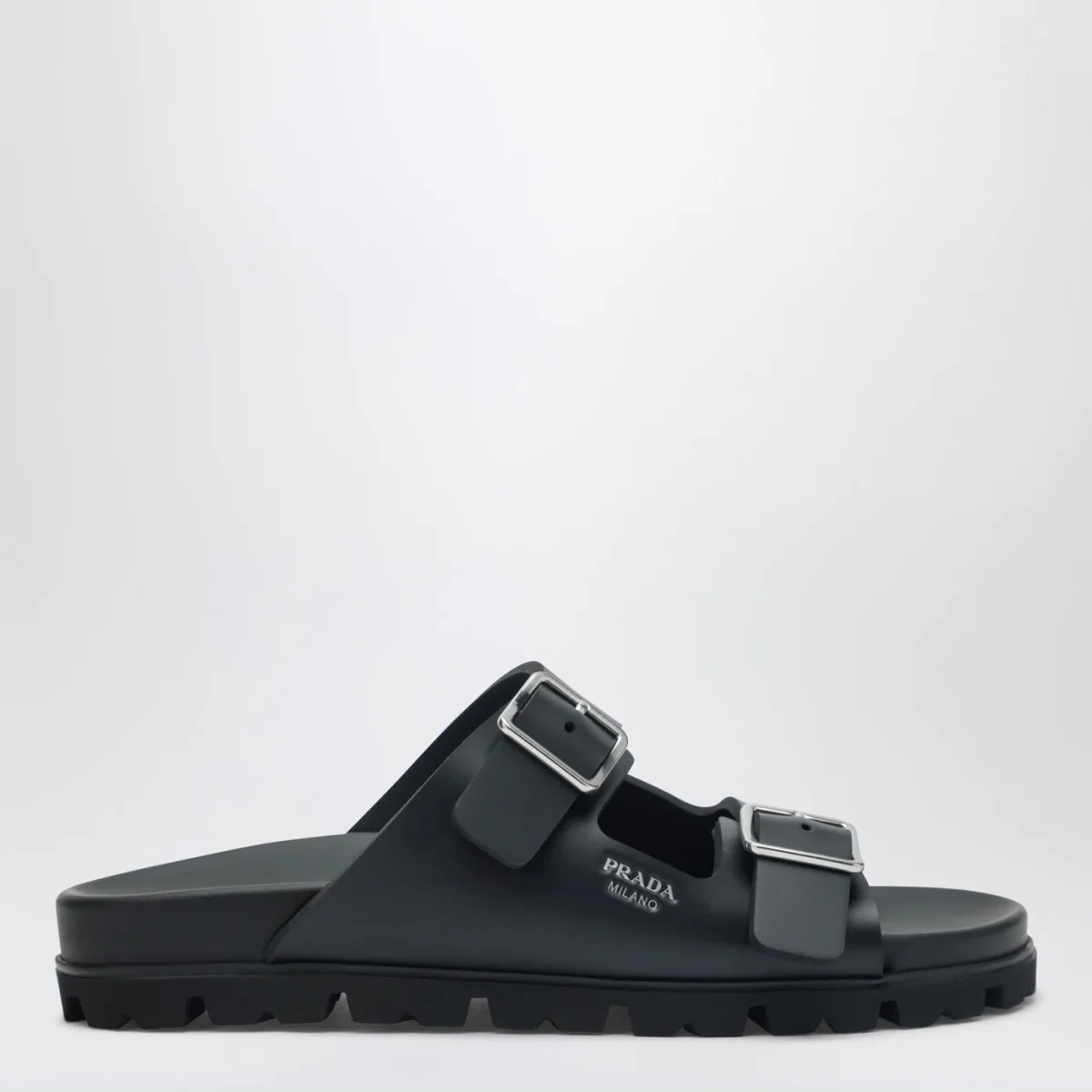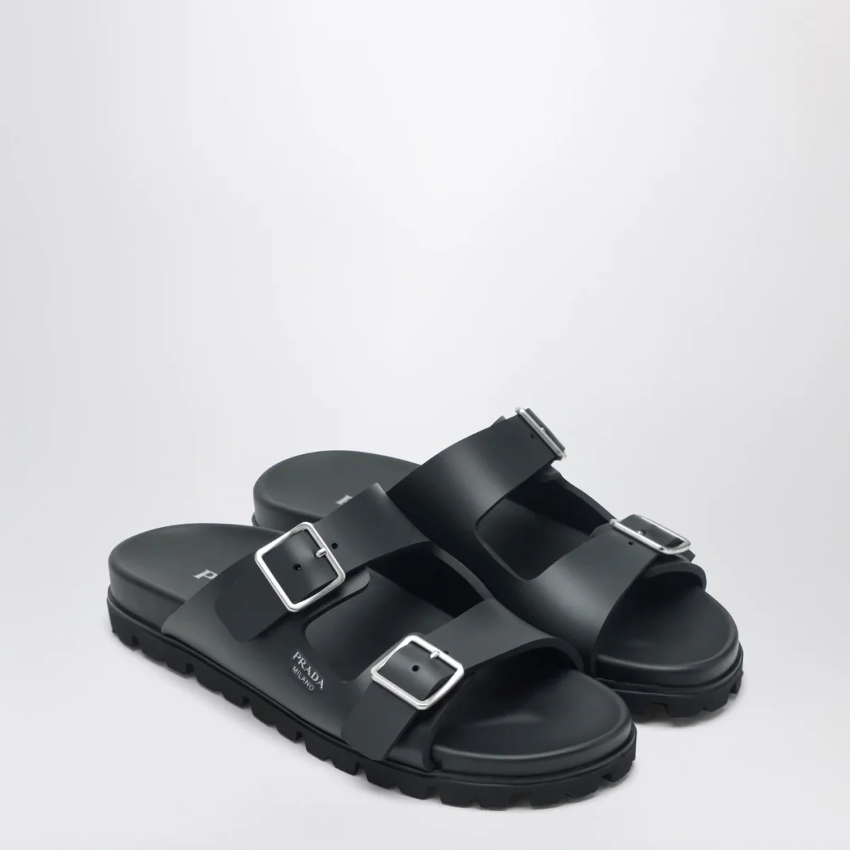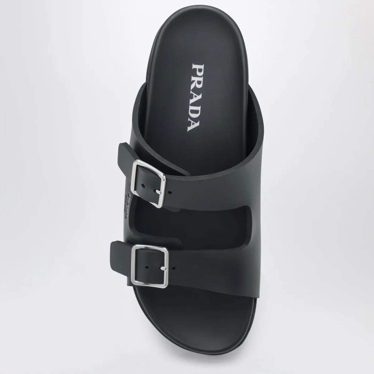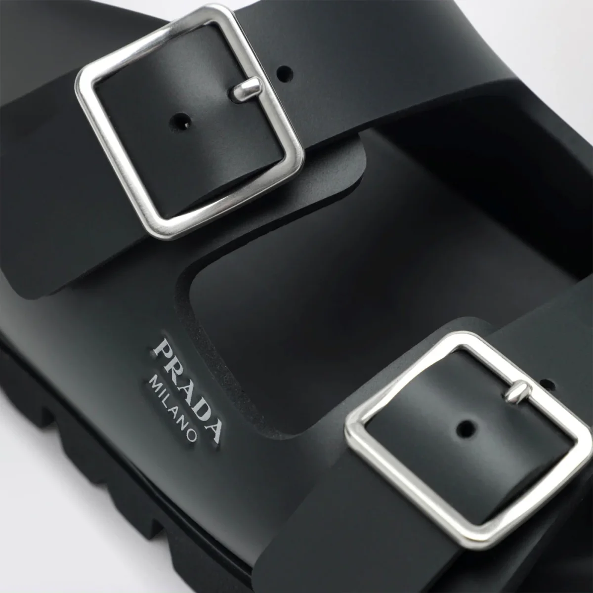 Sandali di Prada in pelle nera• chiusura con doppia fibbia• logo impresso• elementi metallici con finitura argento• suola in gomma