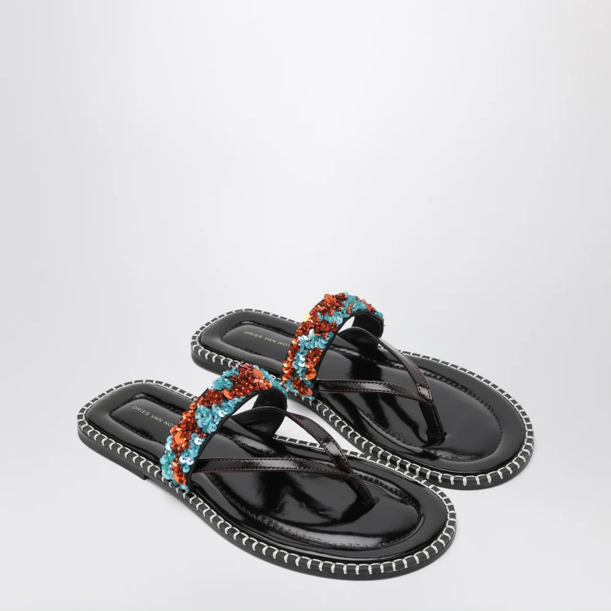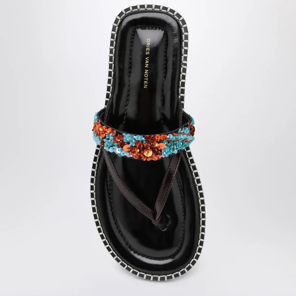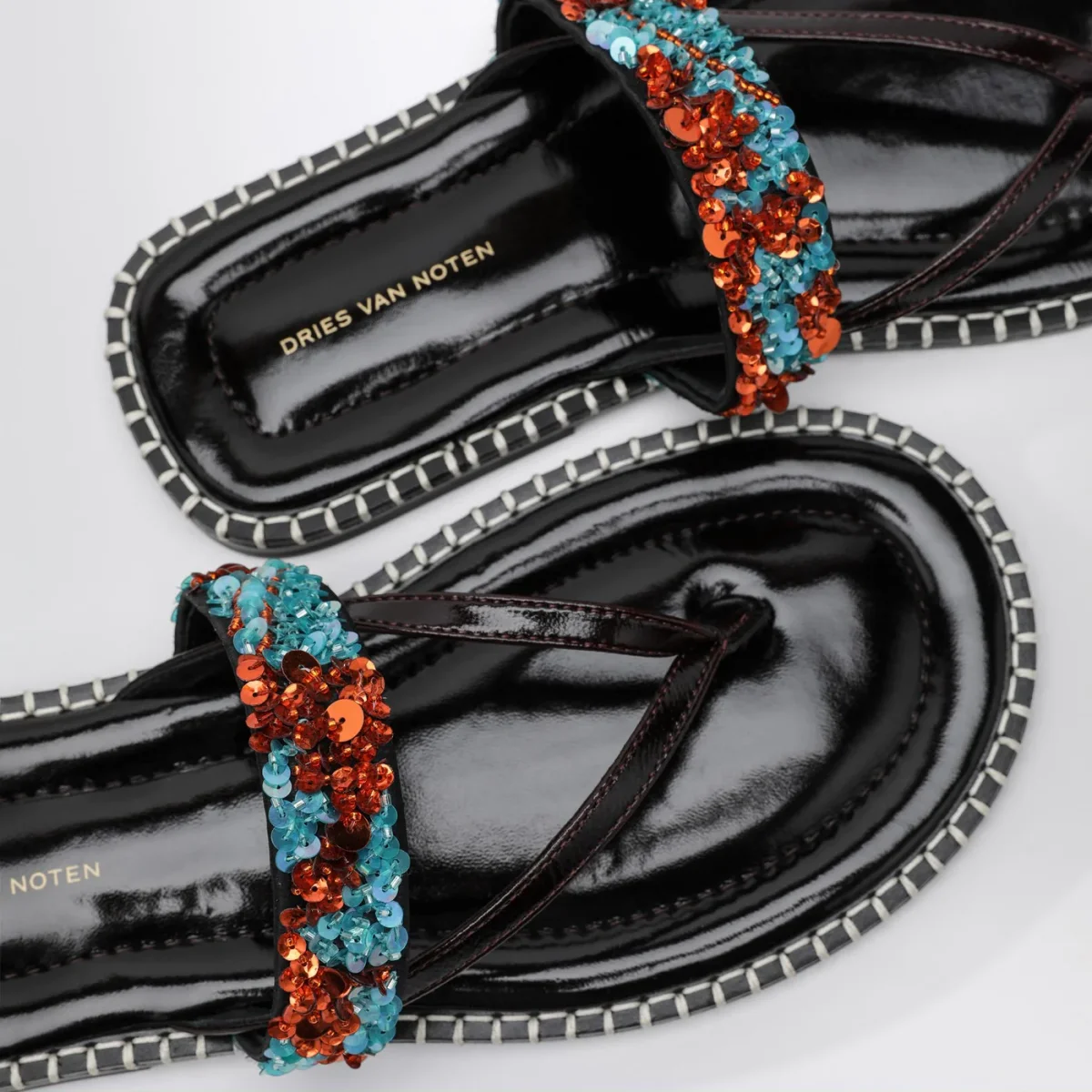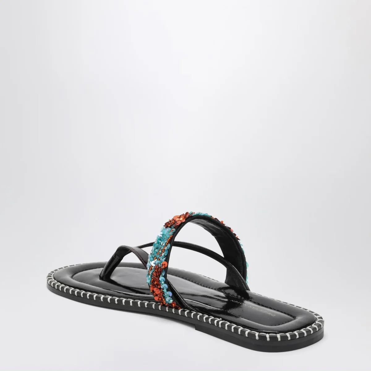 Sandali slip-on in pelle neri• Design infradito• Fascetta con paillette sui toni dell’azzurro e del rosso bruciato• Impunture a contrasto