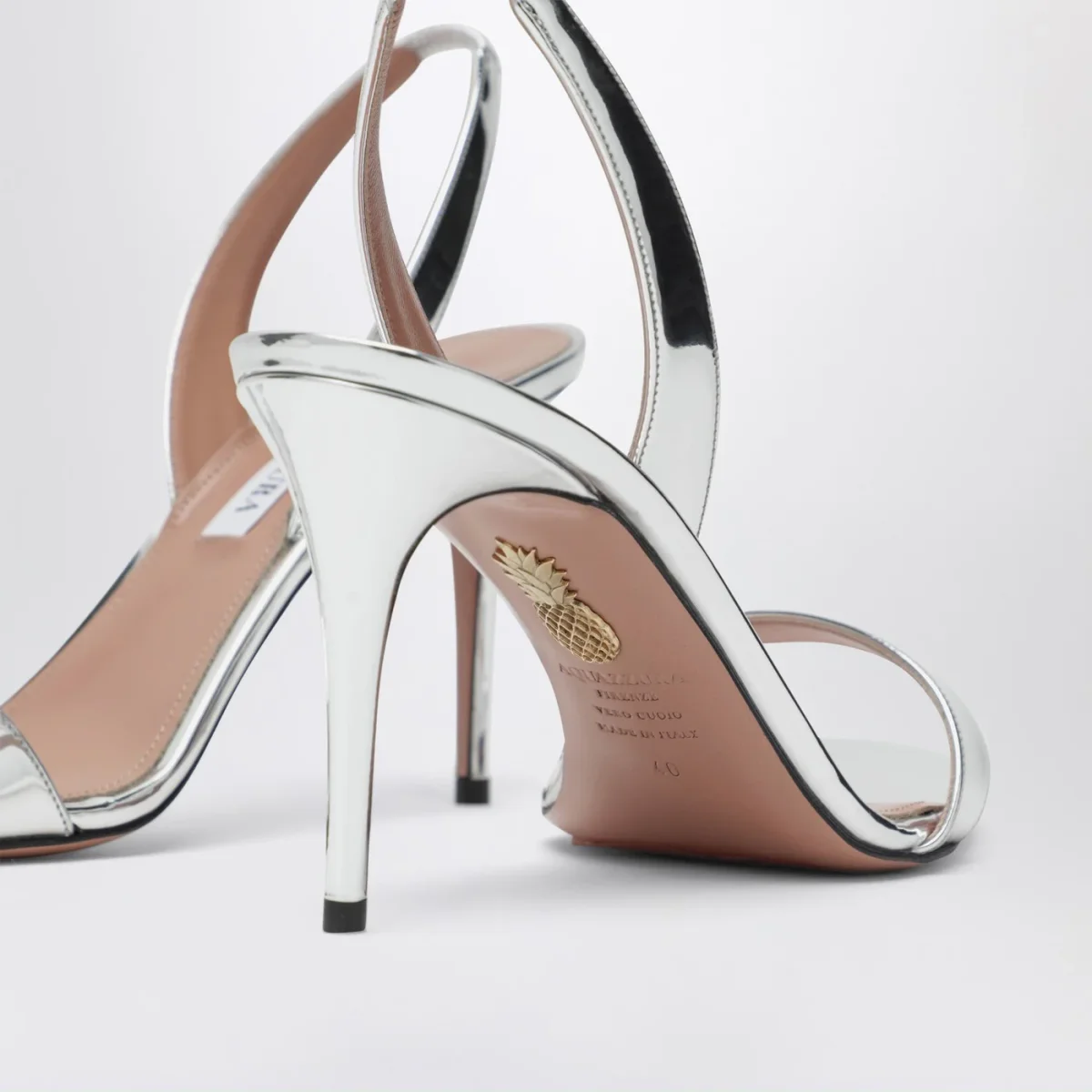 Sandali di Aquazzura in pelle argento effetto specchiato• cinturino slingback• tacco a spillo• sottopiede imbottito in pelle con scritta logo• suola in pelle