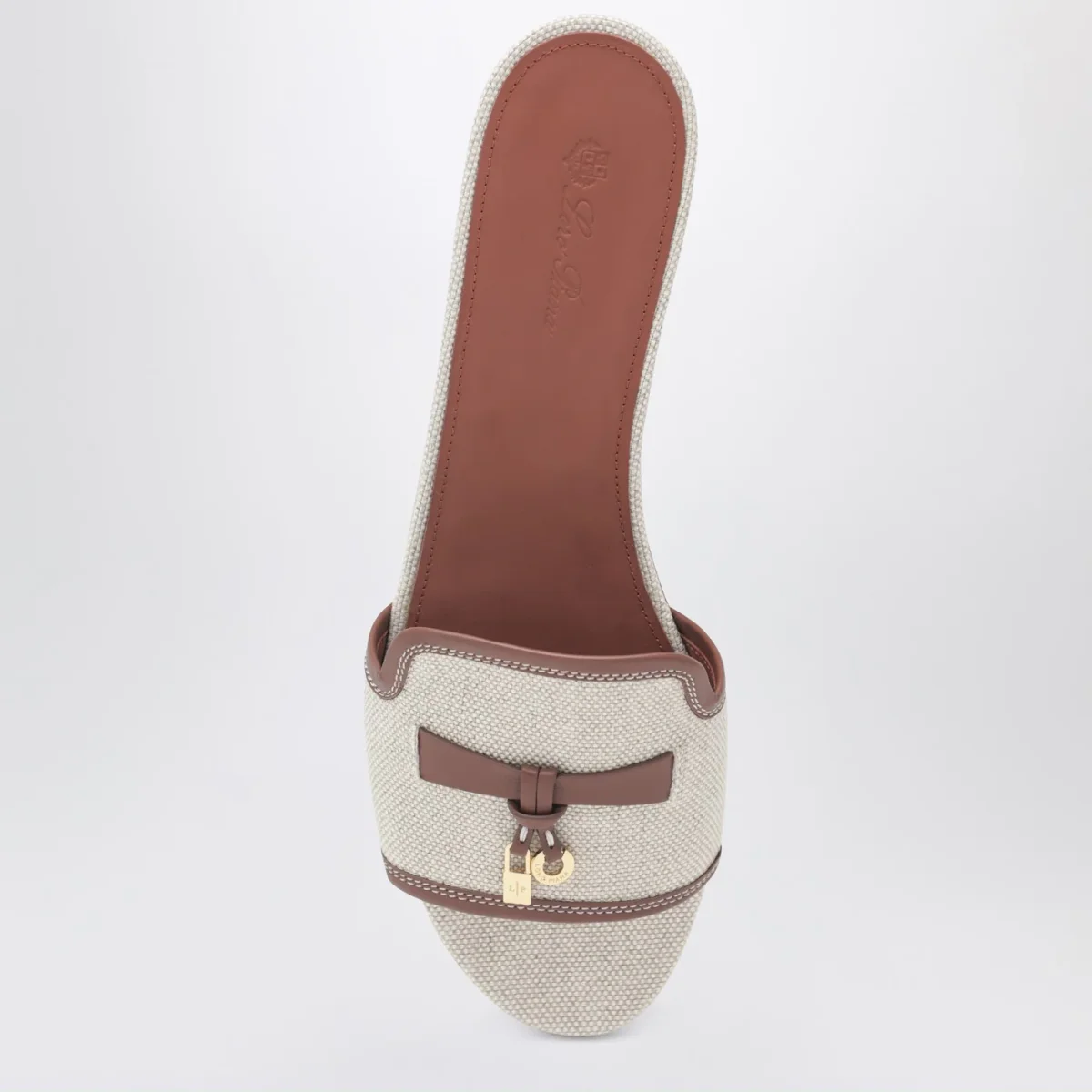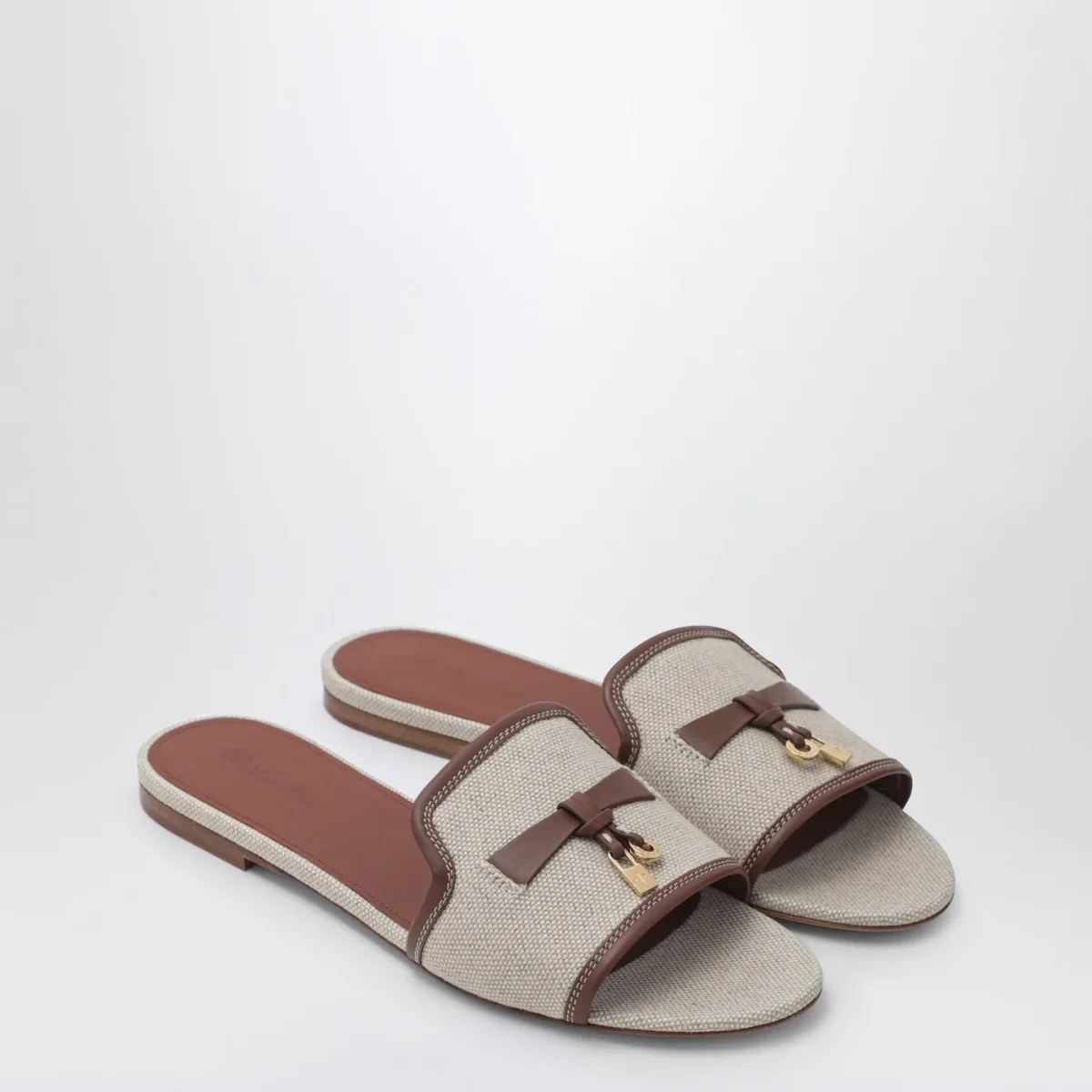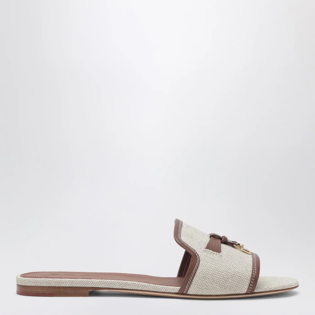 Slipper di Loro Piana in cotone e lino color naturale• plantare color Kummel leggermente imbottito• suola in pelle smerigliata con striscia color Kummel