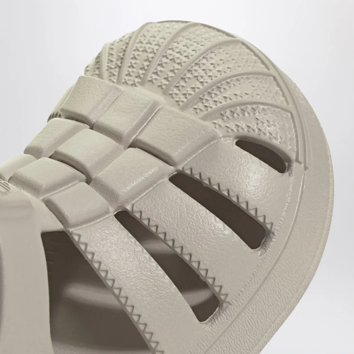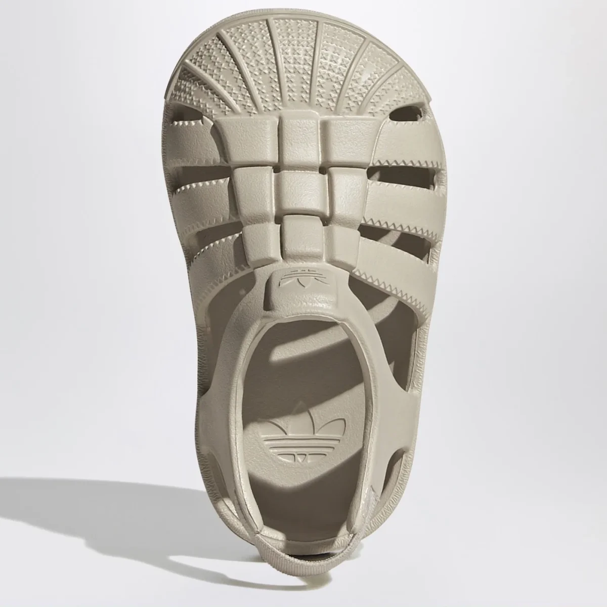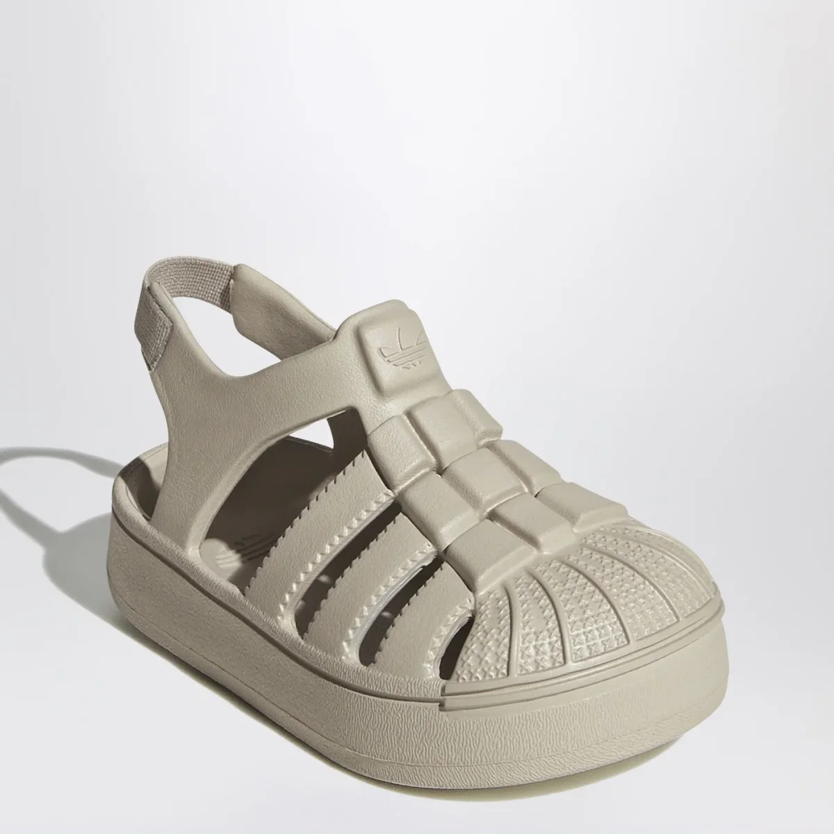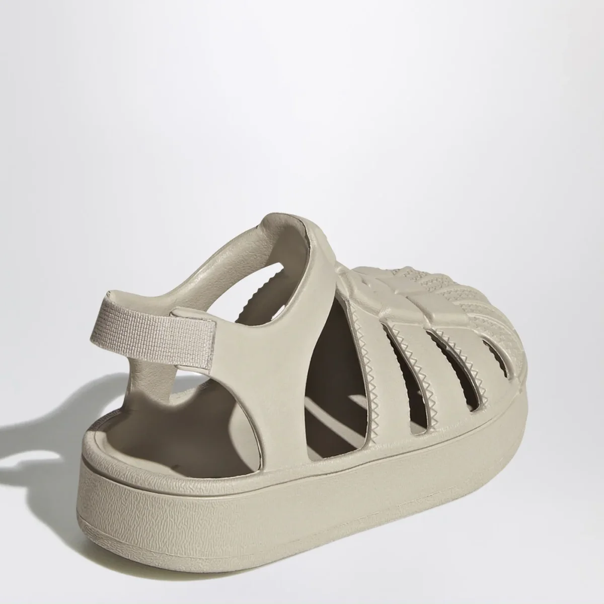 Sandali di adidas Originals beige, caratterizzati da tomaia sintetica con punta a conchiglia, chiusura elasticizzata sul tallone e logo in rilievo sul davanti tono su tono.