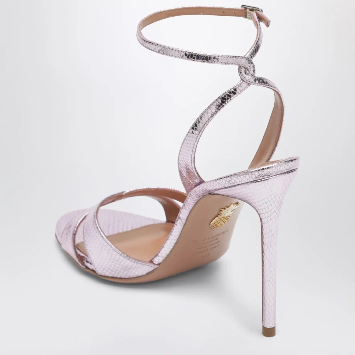 Sandali di Aquazzura in pelle metallizzata blu chiari• tomaia con decorazione di strass• strisce di pelle• punta aperta• cinturino alla caviglia regolabile con fibbia• tacco alto a stiletto