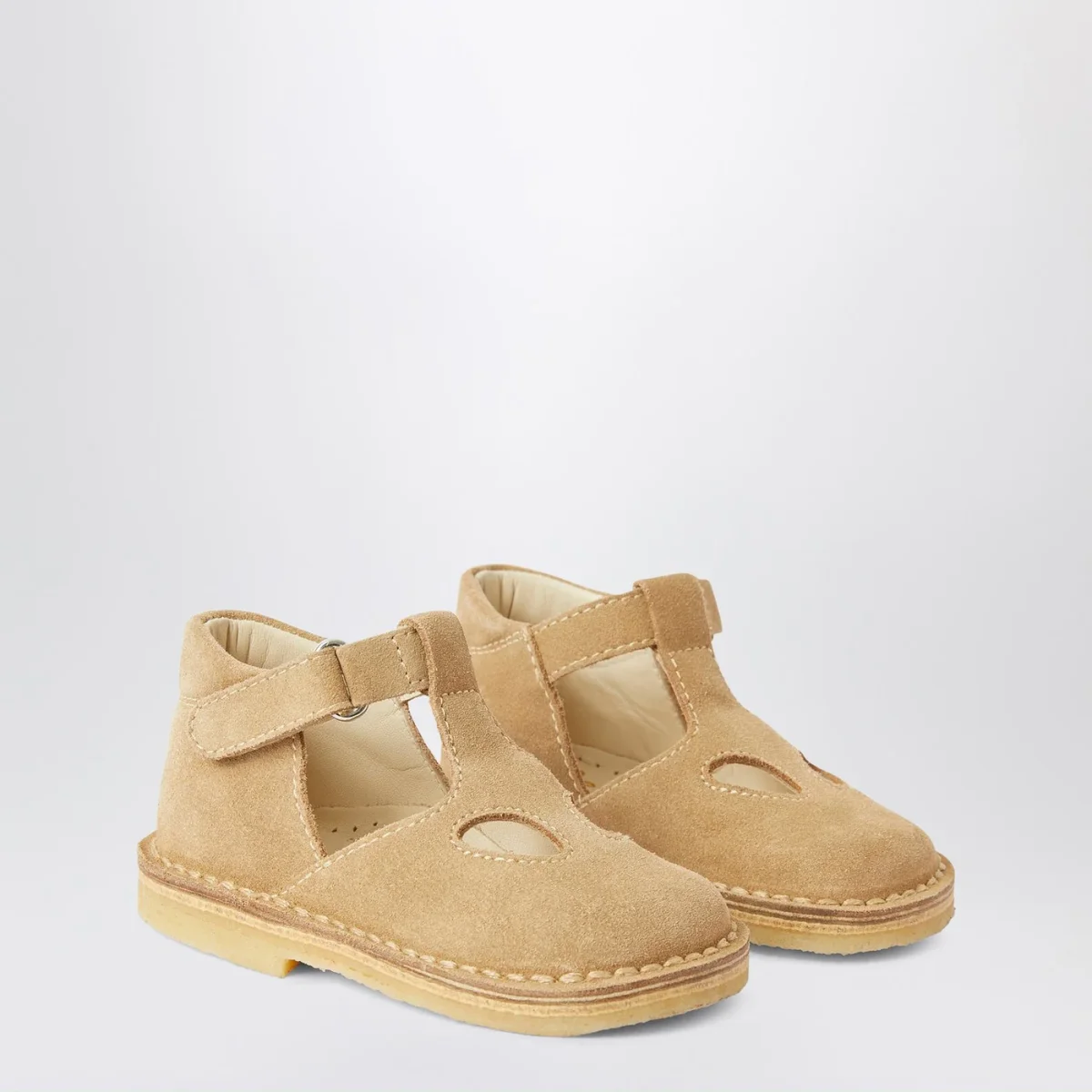 Sandalo alto de Il Gufo in pelle nabuk beige, caratterizzato da design ad occhielli, cinturino alla caviglia con chiusura regolabile con velcro, punta tonda e suola in gomma.
