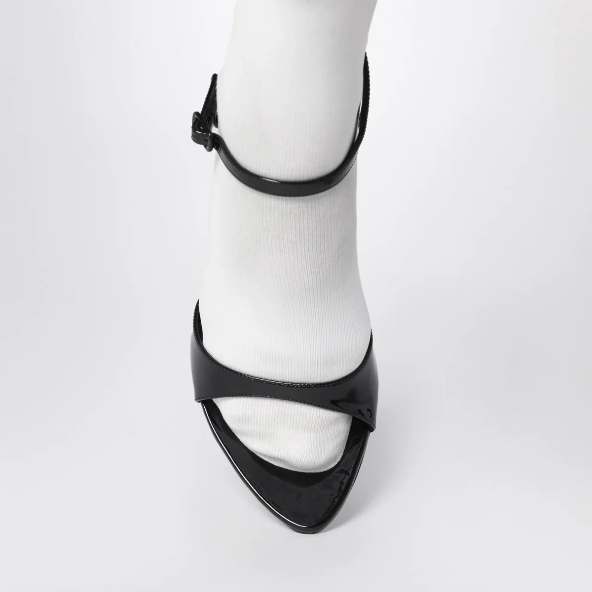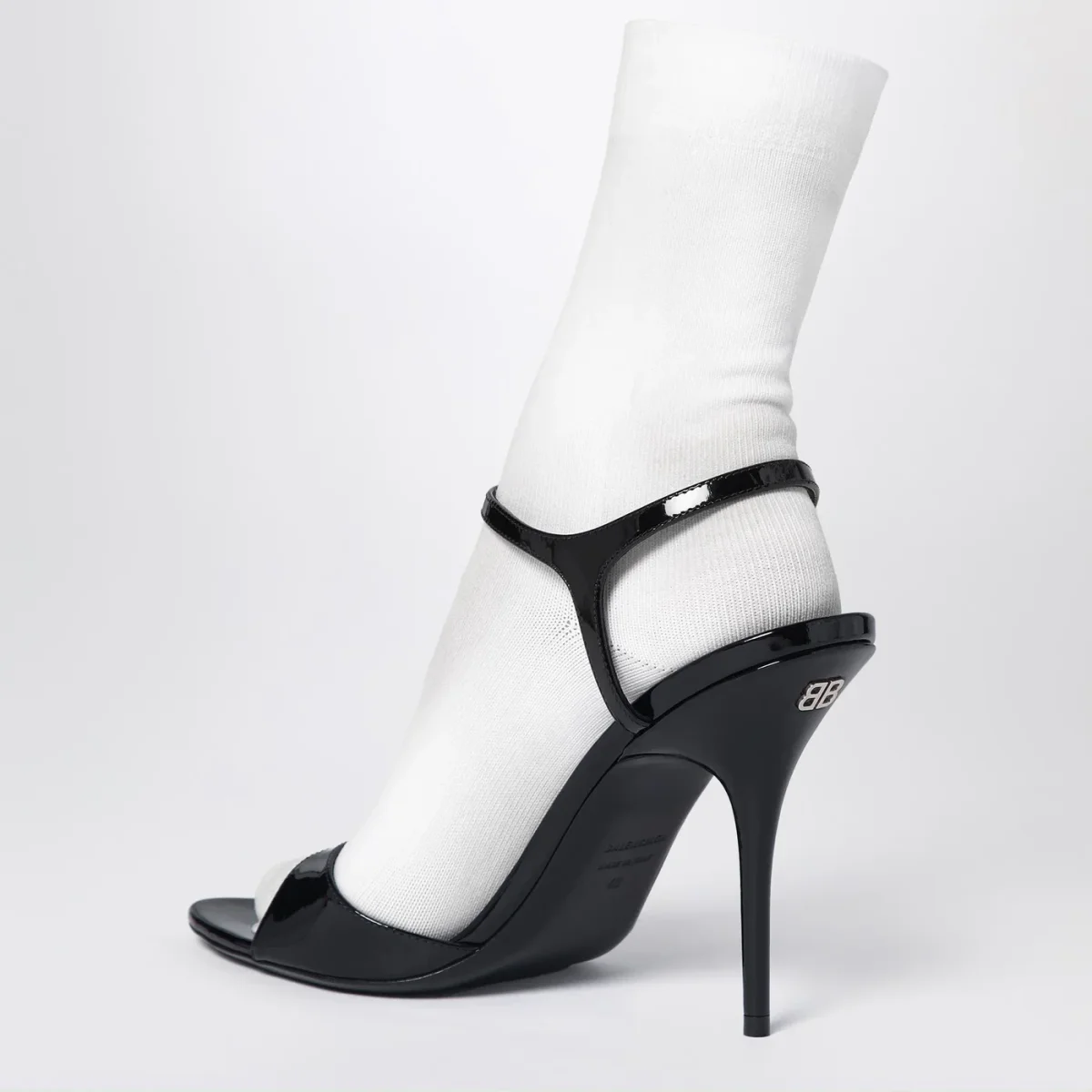 Sandalo di Balenciaga in pelle di vitello verniciata lucida nero, caratterizzato da chiusura con cinturino regolabile alla caviglia, calzino incorporato bianco in maglia, tacco alto sottile con logo BB in metallo sul retro, punta aperta e suola in cuoio.