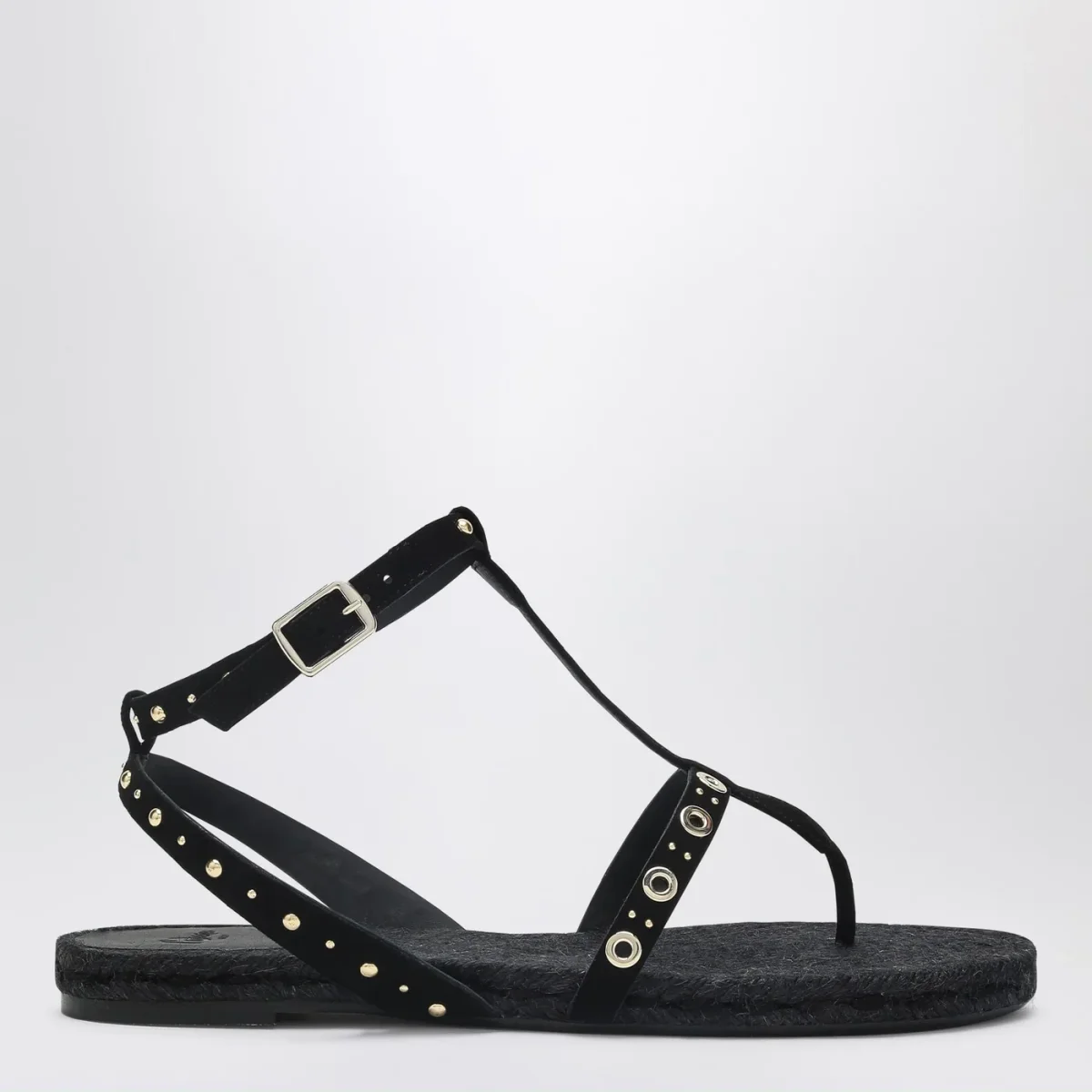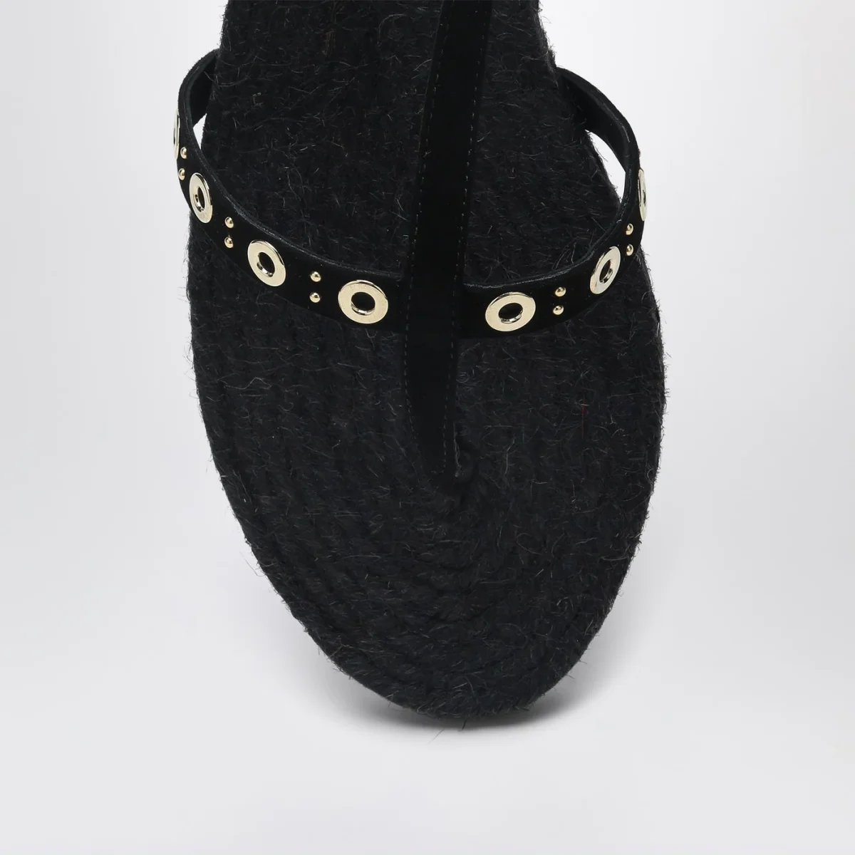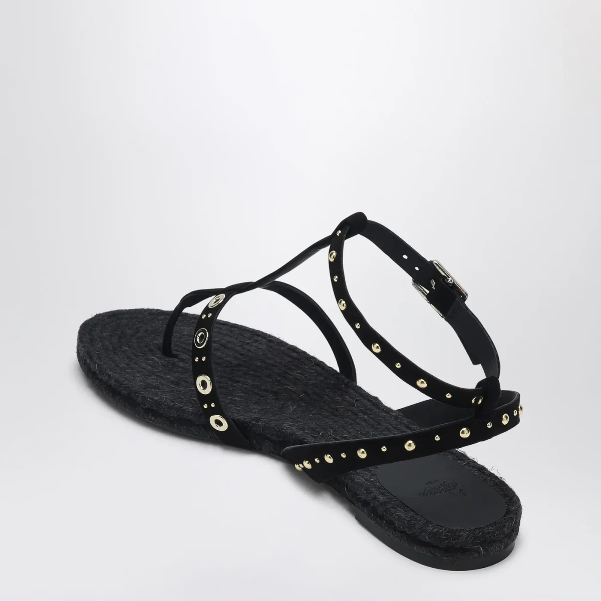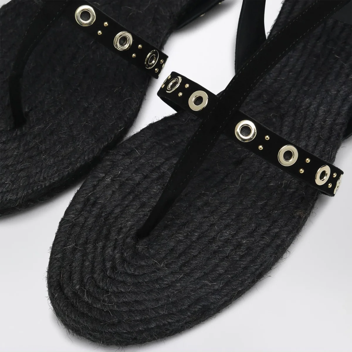 Sandalo basso di Castañer con tomaia in raffia nera, caratterizzato da design a infradito, dettaglio con borchie, cinturino alla caviglia con chiusura laterale con fibbia, sottopiede in raffia e suola juta e gomma.