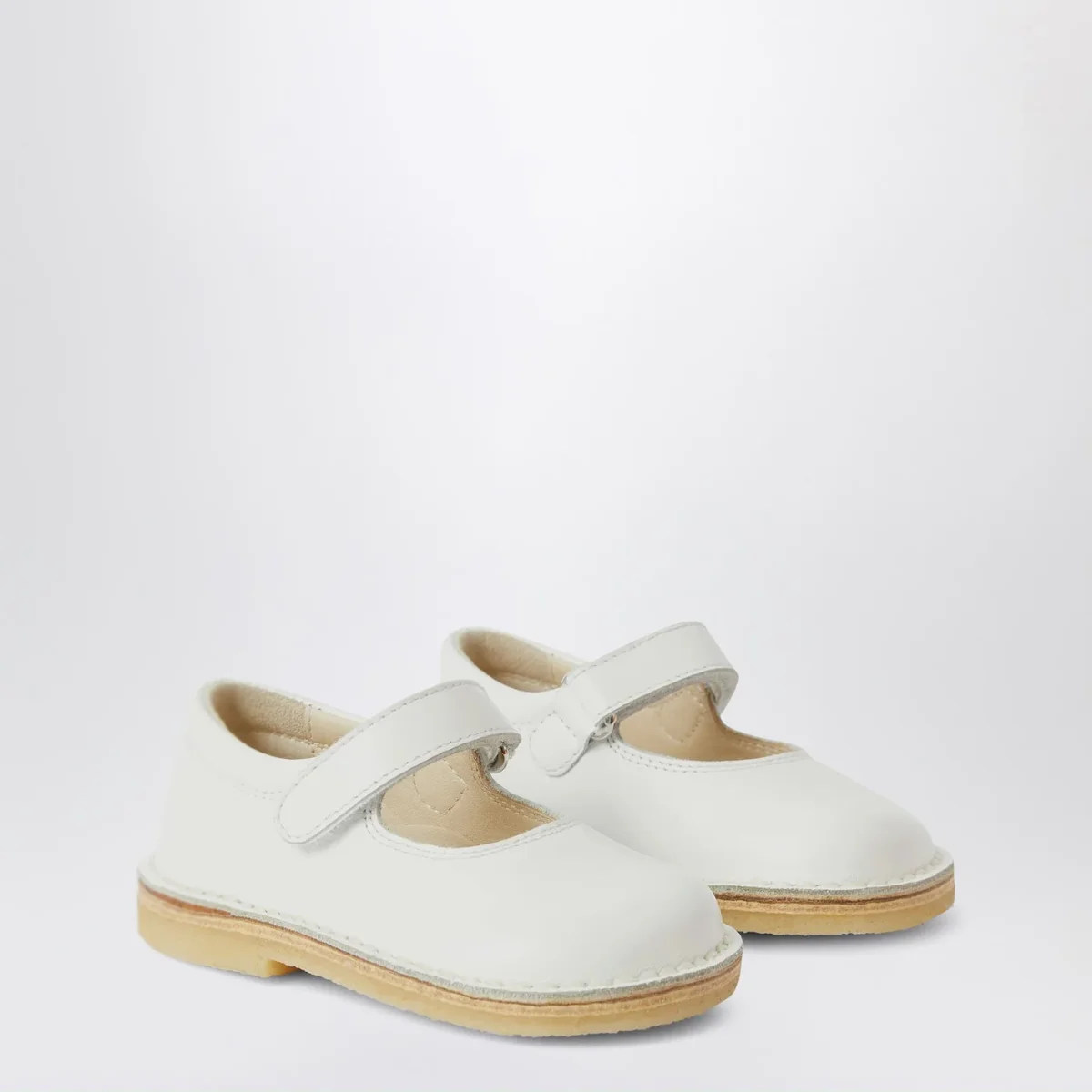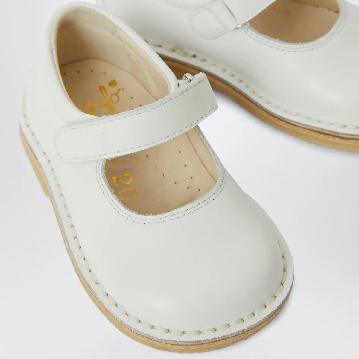 Sandalo de Il Gufo in pelle bianco, caratterizzato da cinturino alla caviglia con chiusura regolabile velcro, punta tonda e suola in gomma.