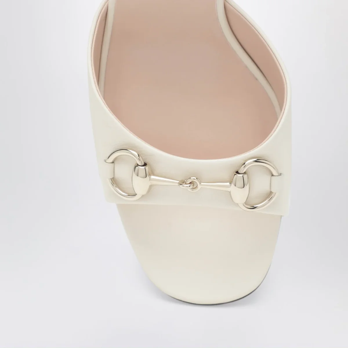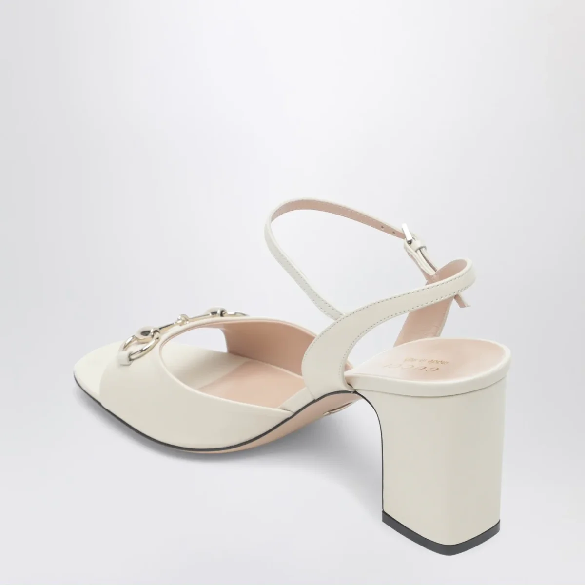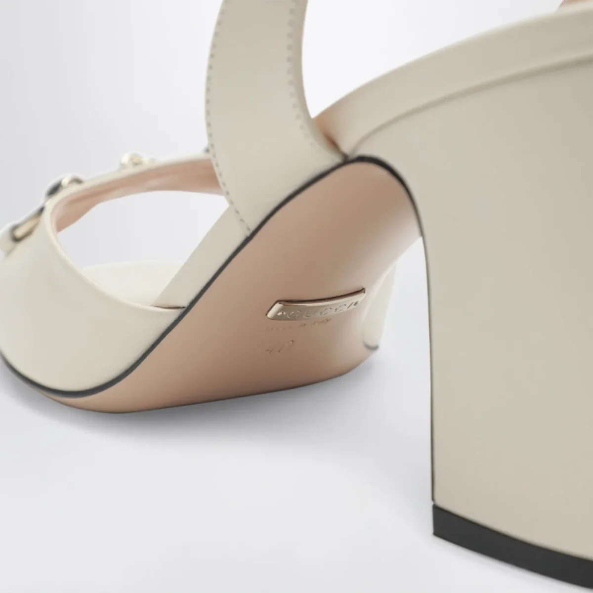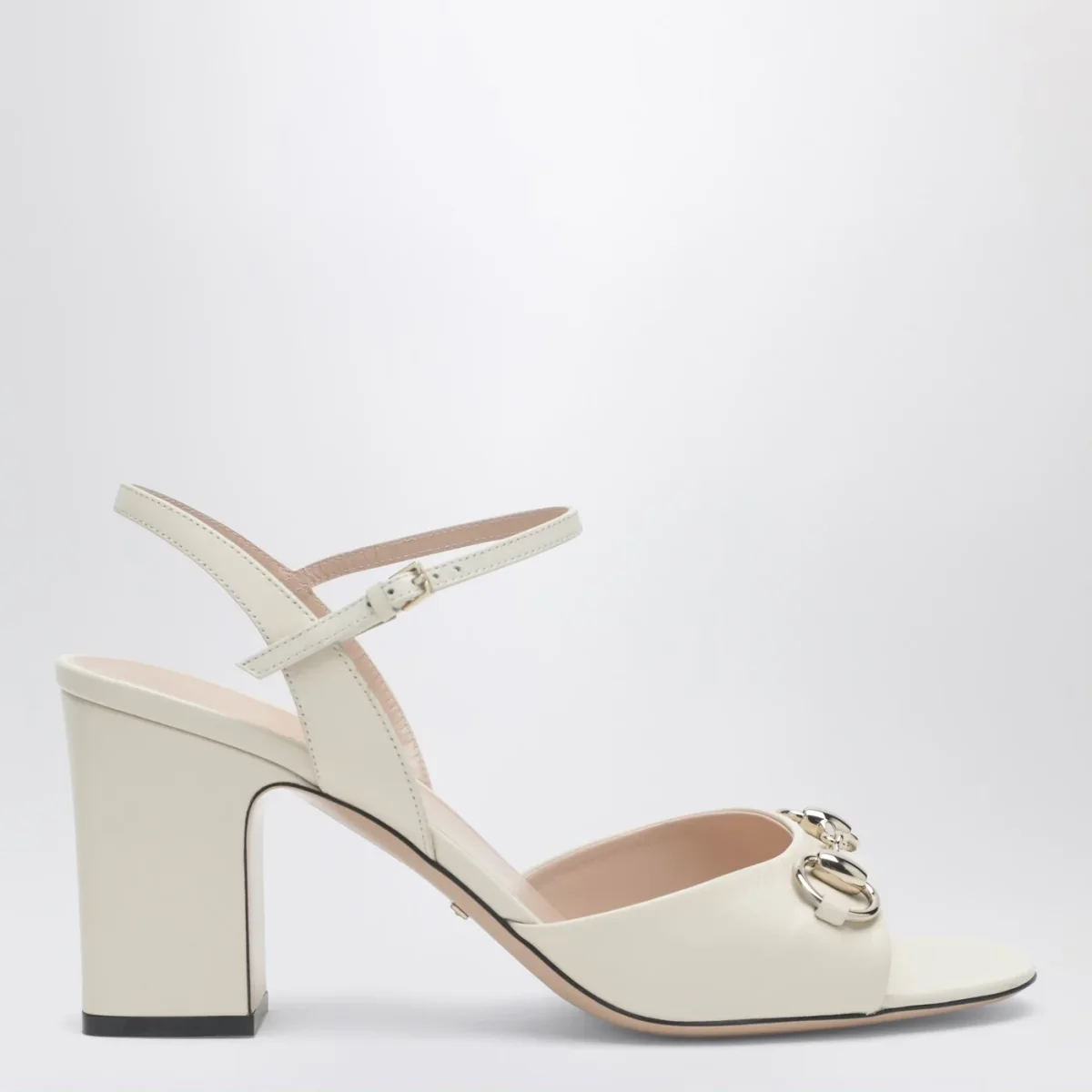 Sandalo di Gucci in pelle bianco• tomaia con cinturino• Morsetto in metallo color argento• chiusura regolabile con fibbia alla caviglia• tacco alto spesso• suola in cuoio