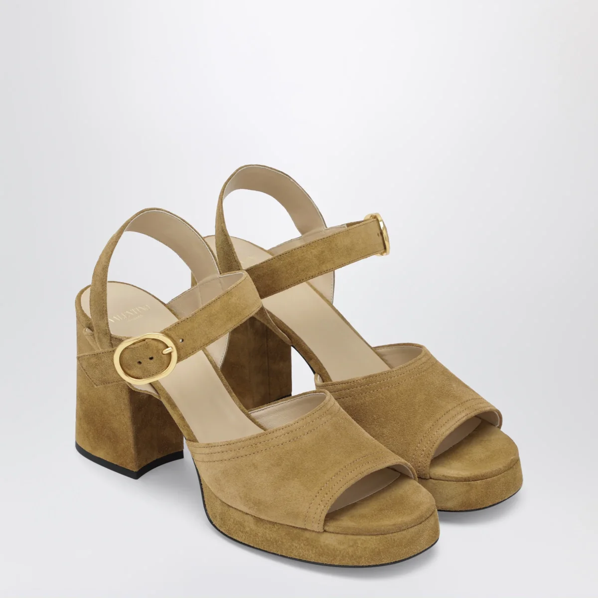 Sandalo di Valentino Garavani in crosta• Colore: Havana beige• Dettaglio VLogo Signature finitura ottone effetto anticato• Cinturino regolabile con fibbia• Plateau e tacco largo fasciati in crosta