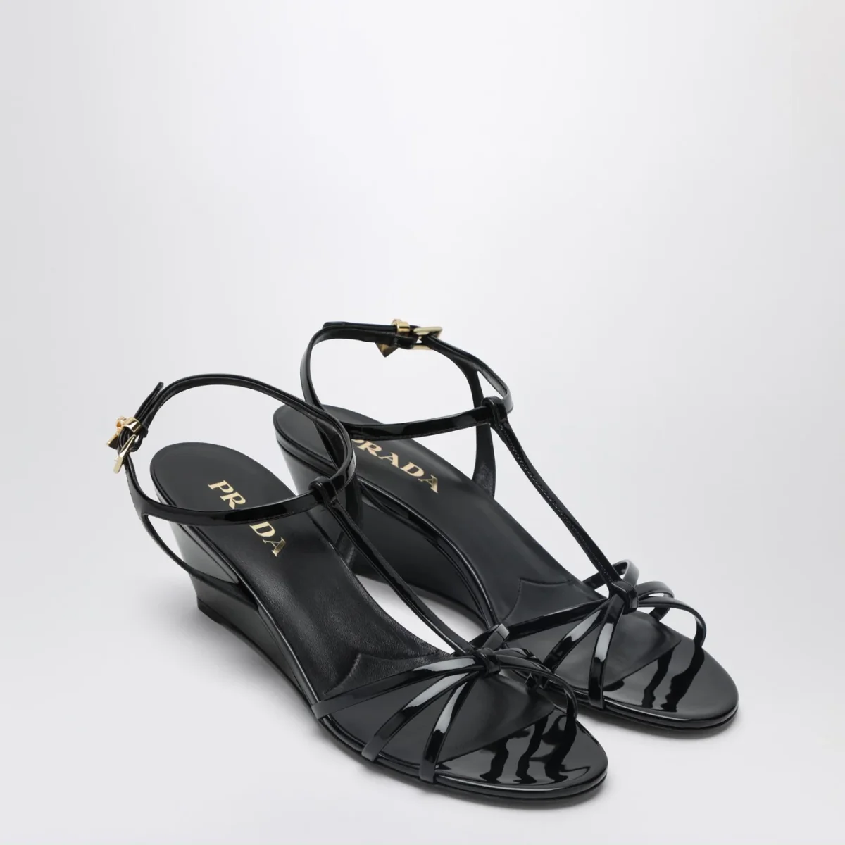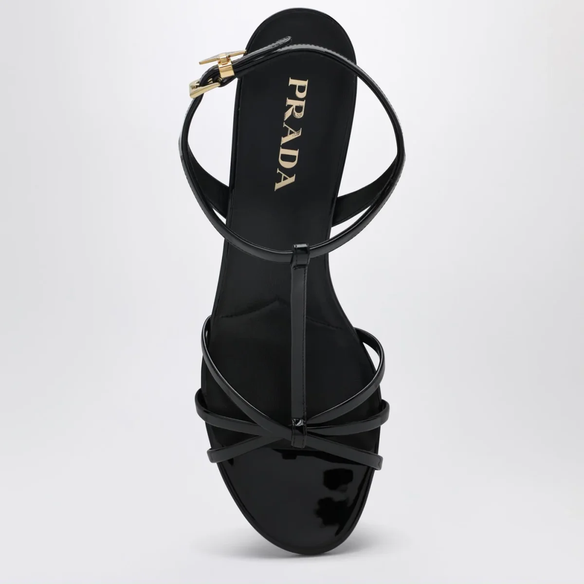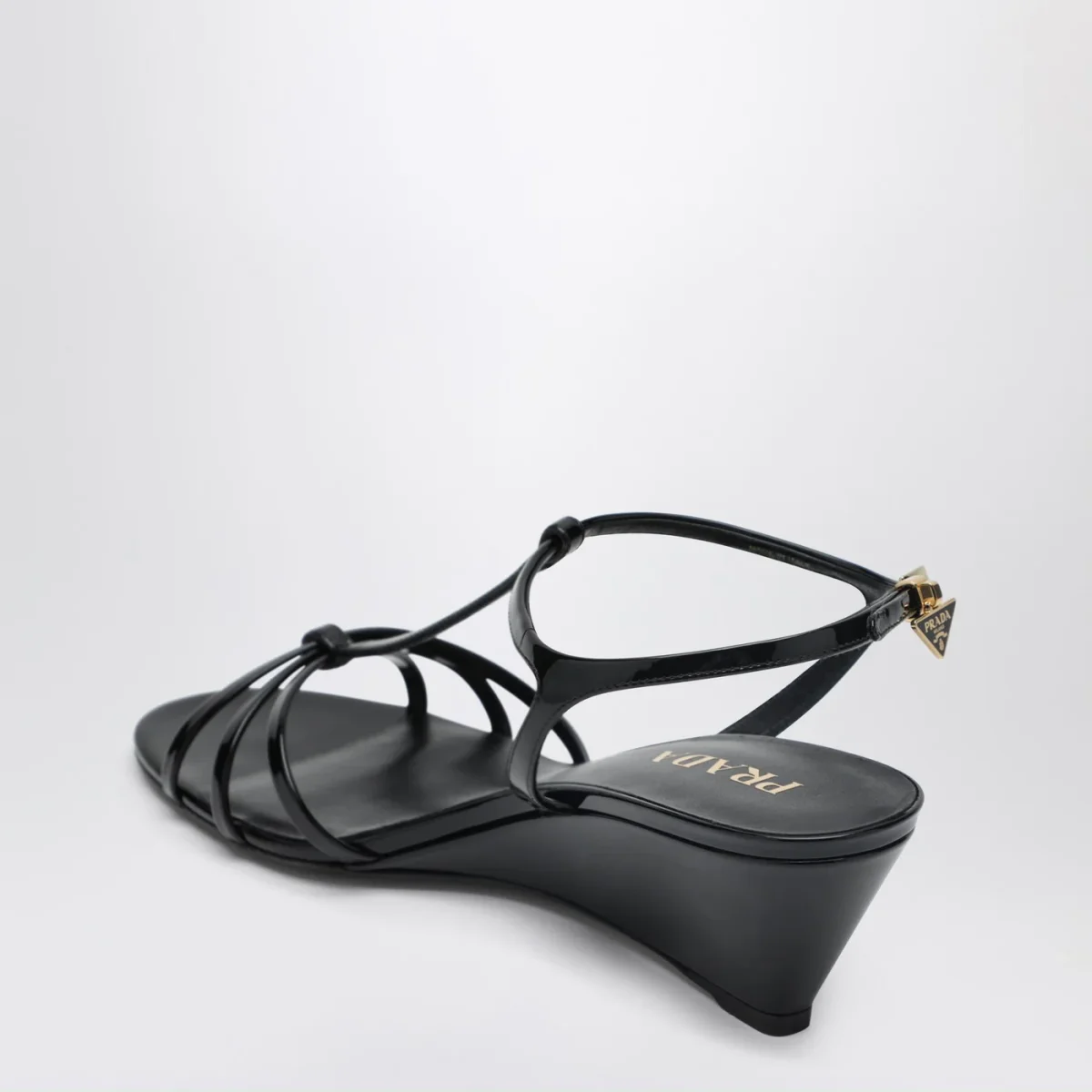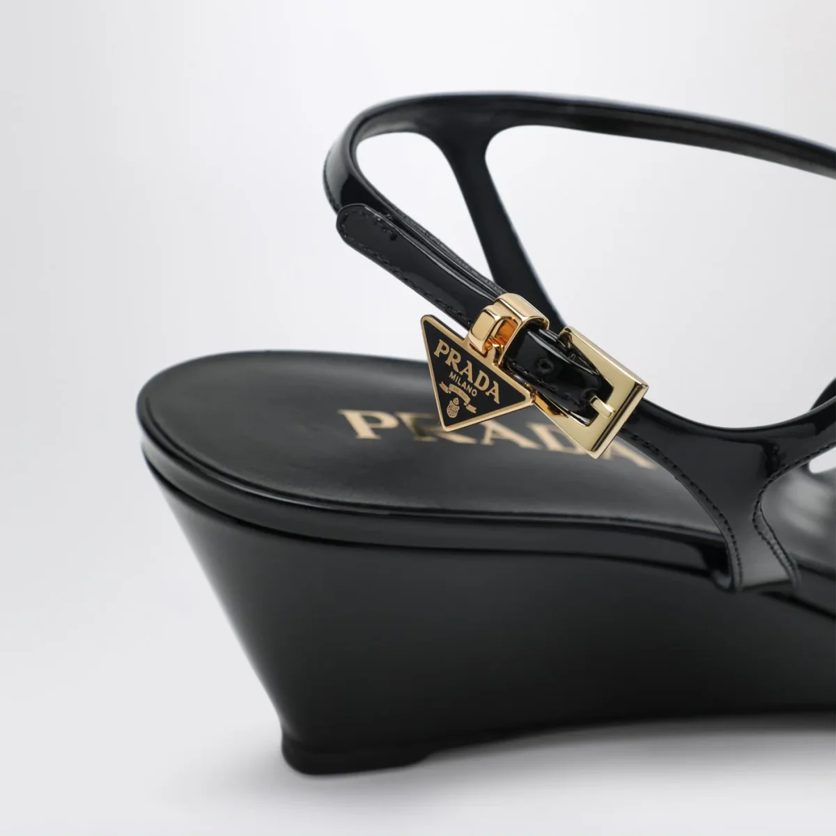 Sandalo di Prada in pelle nera, caratterizzato da punta aperta, cinturino regolabile alla caviglia con fibbia, charm triangolo logo, zeppa bassa e suola in pelle.