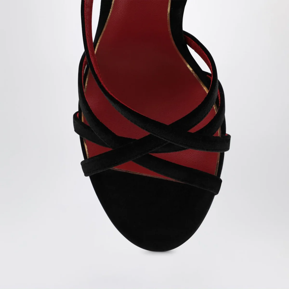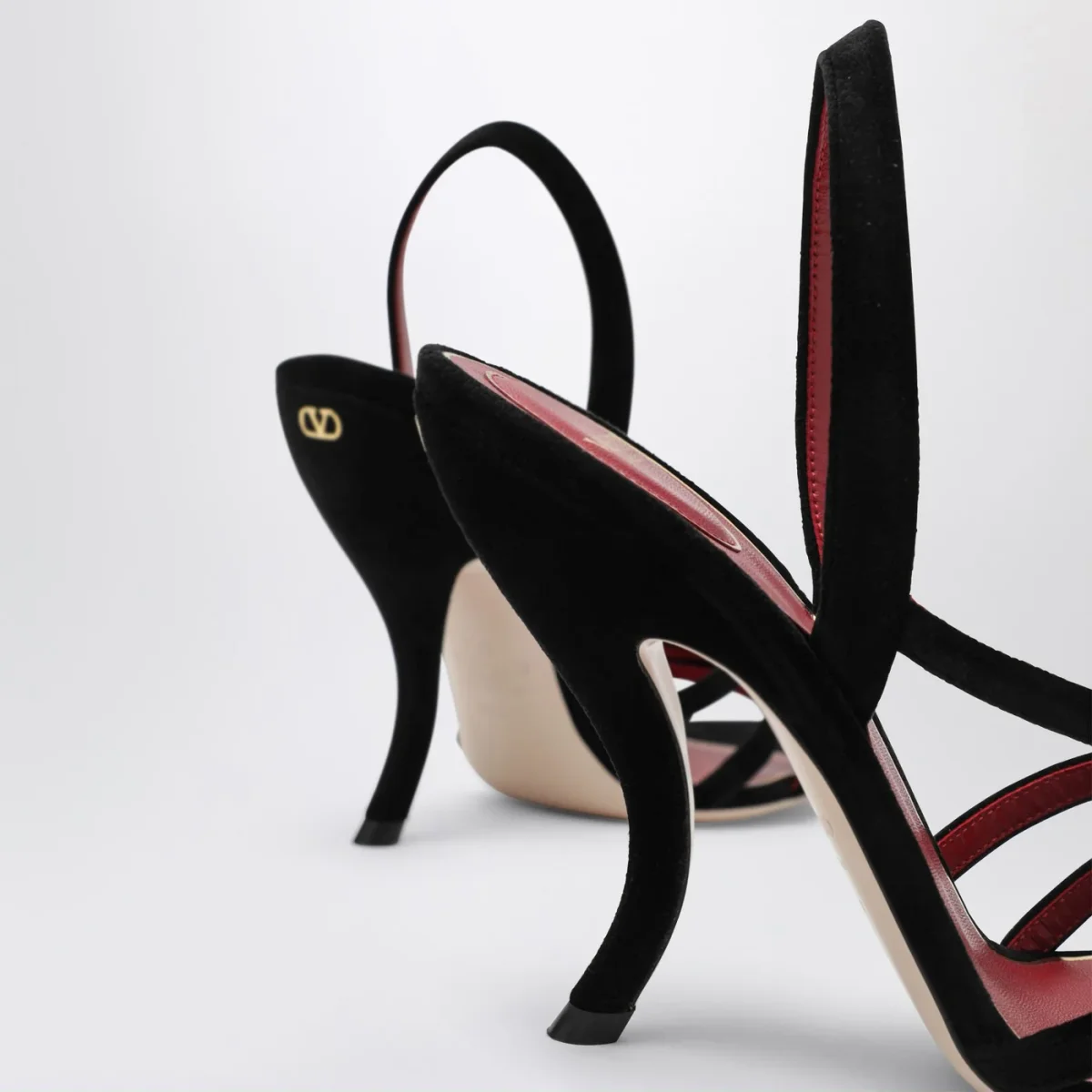 Sandalo di Valentino Garavani in velluto nero, caratterizzata da design intrecciato, VLogo Signature sul retro in ottone con finitura oro, cinturino con inserto elasticizzato e tacco curvo.