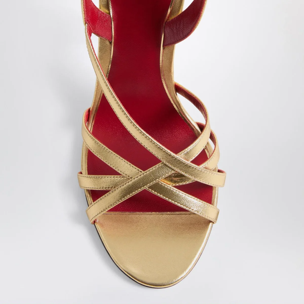 Sandalo di Valentino Garavani in pelle oro, caratterizzata da design intrecciato, VLogo Signature sul retro in ottone con finitura oro, cinturino con inserto elasticizzato e tacco curvo.